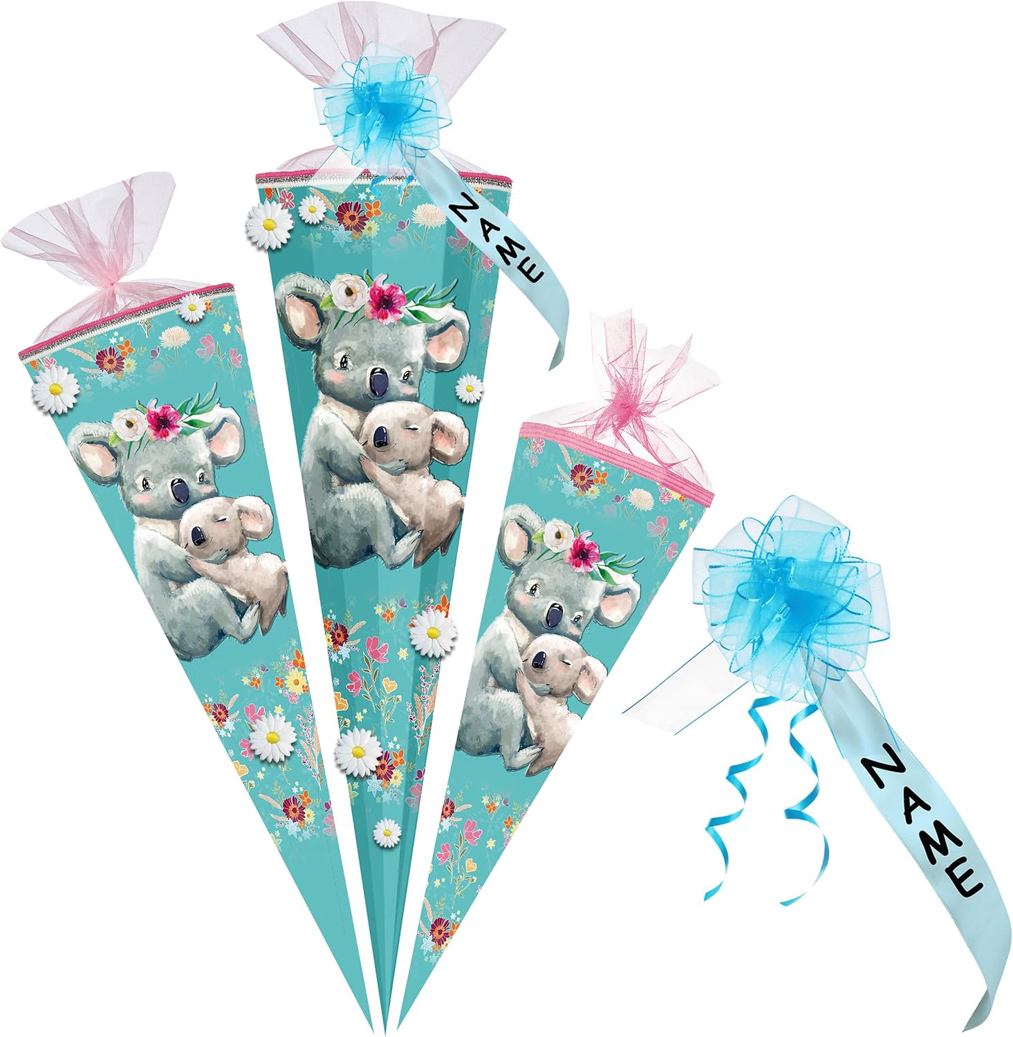 con effetto 3D - fiori e applicazioni in tessuto + stampa glitter!! ____ stabile e di alta qualità - zaino per la scuola _____ Dimensioni: 70 cm di lunghezza (misurato solo il cartone) ___ Forma: ROTONDO ____ Motivo: "dolce famiglia di koala" SPECIALE E INDIVIDUALE: _____ personalizzato con il NOME desiderato e il TESTO desiderato ___ / ____ la richiesta del nome viene effettuata - AUTOMATICAMENTE - per favore NON inviare un messaggio in anticipo fatto in Germania e vero FATTO A MANO! _______ Materiale: cartone rivestito e di alta qualità - idrorepellente! _____ SUPER stabile e tanto spazio per fantastici regali! ____ ottimi colori di stampa! _______ / ___ il bordo superiore del sacchetto regalo ha un elegante bordo intrecciato e un'elegante finitura in organza scintillante dell'EYE-CATCHER: ______ incluso un grande fiocco di tulle in colore coordinato (brilla in modo molto elegante) ______ la consegna dei bellissimi modelli di fiocchi è mista (puoi vedere esempi nelle immagini) e la marca _ alles-meine Gmbh __ offre oltre 1000 articoli relativi all'inizio della scuola ____ ad es. vari fiocchi come chiusure, piccoli zaini decorativi da appendere, candele, varie decorazioni per la stanza e la tavola, salvadanai ___ e persino imbottiture complete! ____ I coni scolastici sono ottime idee regalo... per l'inizio della scuola, dell'asilo e dell'asilo, per l'inizio della formazione o degli studi, per un nuovo lavoro! …. o un inizio diverso per una nuova fase della vita