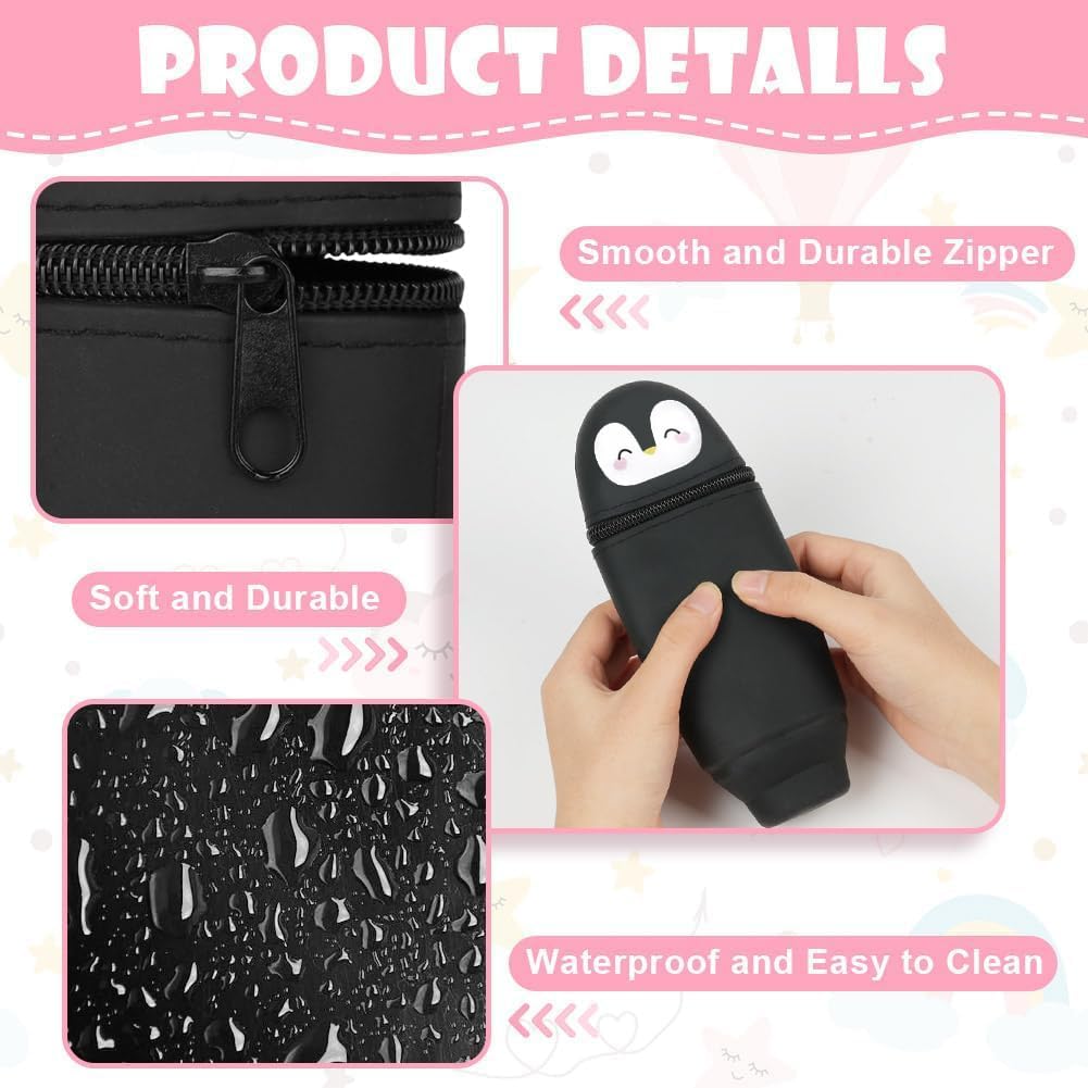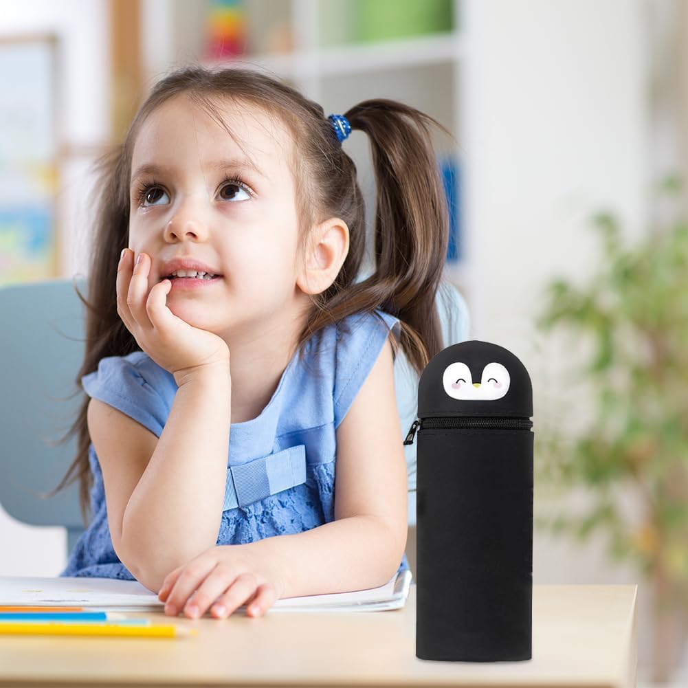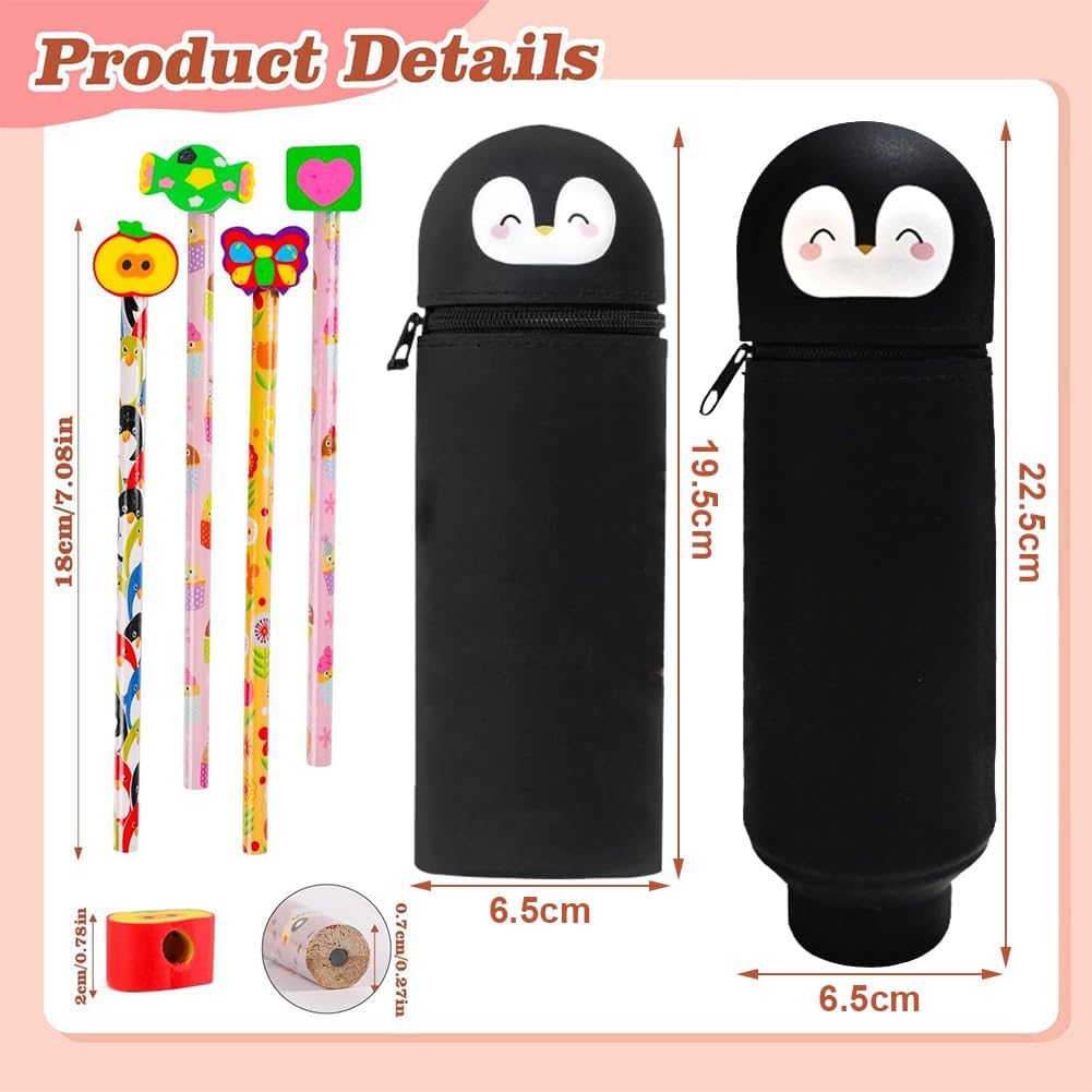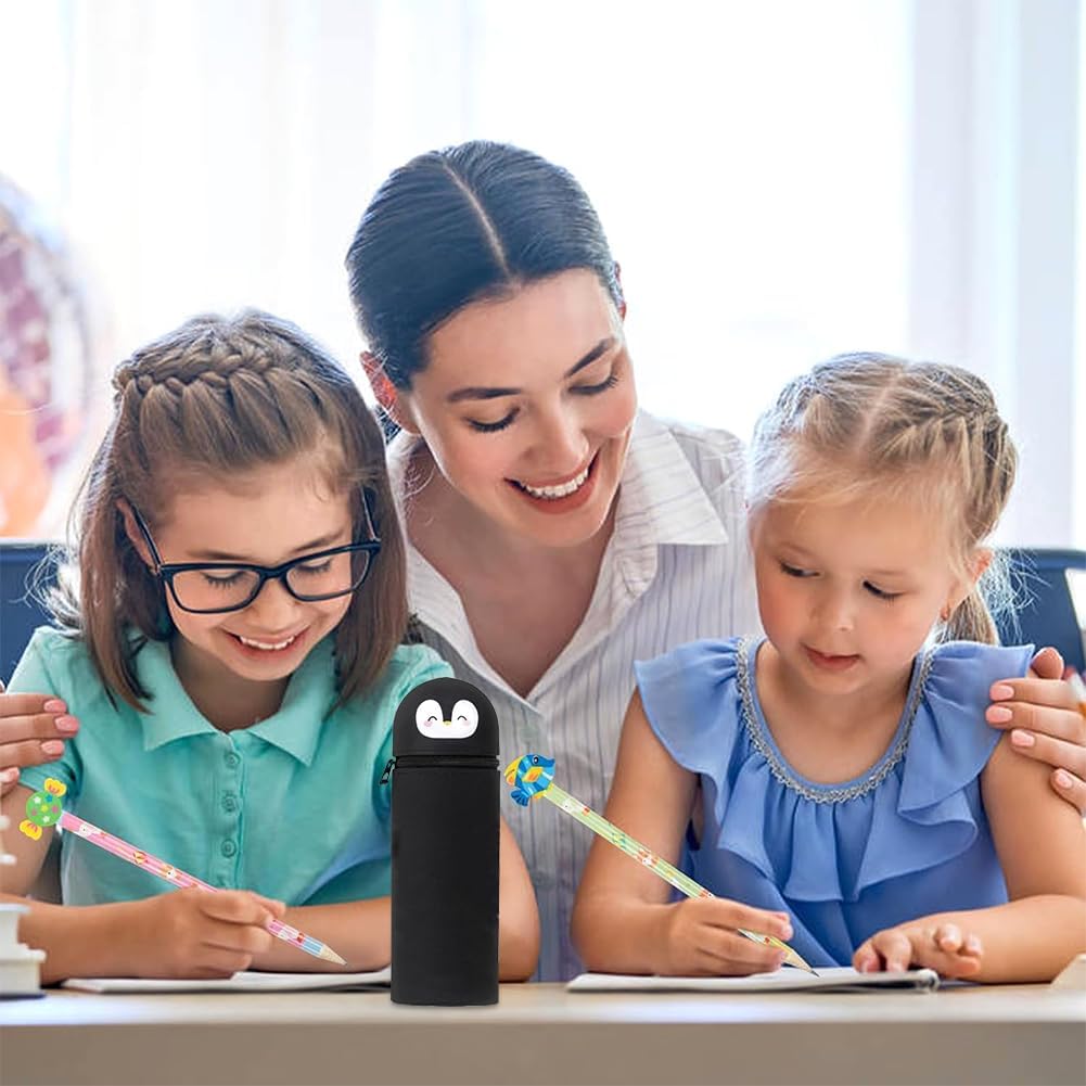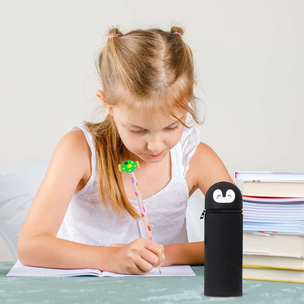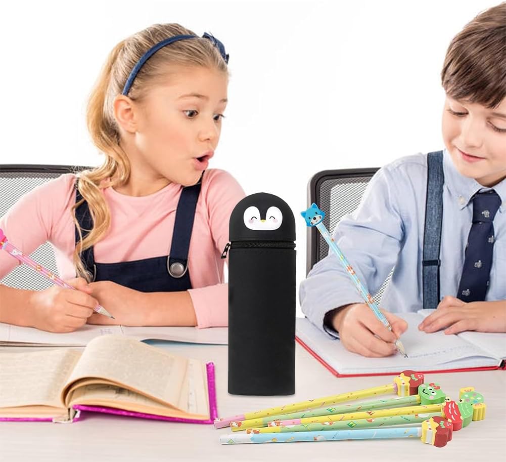 Materiale di alta qualità: Realizzato in silicone resistente e sicuro, facile da pulire e da igiene. La vernice antiscivolo offre una sensazione confortevole e protettiva. Dimensioni ideali: La borsa da 6.5*22.5 cm è progettata per adattarsi perfettamente ai 30 matitoni da 19.5 cm, garantendo un'ottima capacità di stoccaggio. Design unico e funzionale: La borsa ha una struttura a scomparsa, è dotata di una custodia per gomme di sughero e un design a forma di pinguino che attira l'attenzione e si adatta perfettamente alle matite. Regalo perfetto: Questo set di 30 matite con gomma a tema cartoon, inclusa una borsa portamatite divertente, è un'idea regalo ideale per bambini e studenti, ricco di personalità e creatività. Utilizzi versatili: Perfetto come accessorio da scrivania per bambini, ma anche come portamatite portatile per studenti. La sua capacità e il design pratico lo rendono adatto a vari contesti.