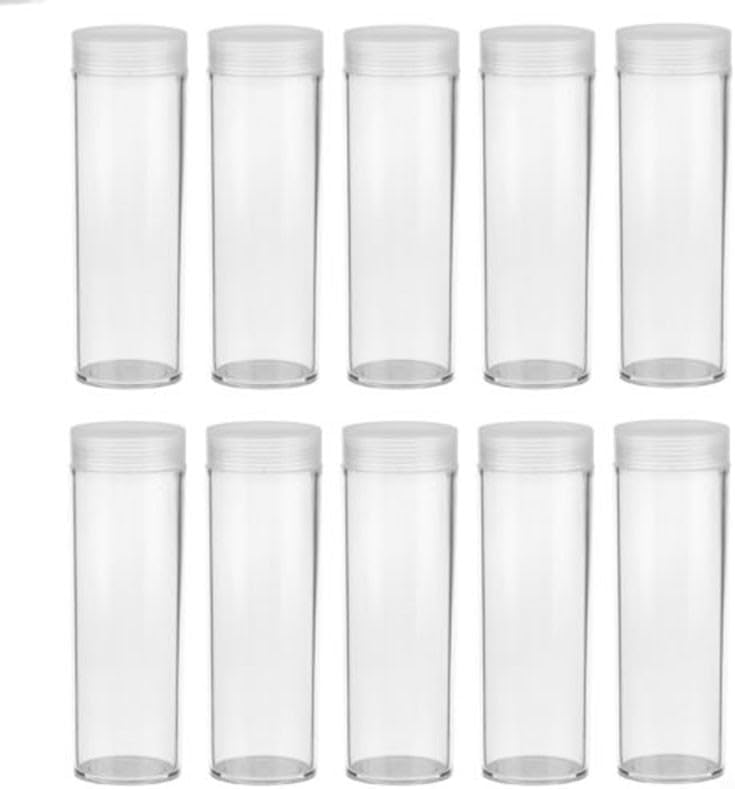 Contenitore per monete: proteggi la tua collezione di monete con 10 supporti in plastica portatili con custodie rotonde trasparenti progettate per una facile visualizzazione e conservazione organizzata durante i viaggi Protezione sicura per: queste capsule trasparenti offrono una difesa di lunga durata contro l'erosione e i danni con una vestibilità sicura che evita graffi e accumulo di polvere Dimensioni precise: ogni custodia ha un diametro interno di 30 mm e un'altezza di 110 mm che li rende adatti per dimensioni standard e tondi con precisione di dimensionamento costante Superfici in plastica trasparente: la finitura liscia e simile al display garantisce una visibilità immediata degli oggetti conservati consentendo una rapida identificazione senza rimuovere dal supporto Set di 10 tubi di lunga durata: il set include 10 supporti compatti leggeri ideali per l'uso in raccoglitori di monete o cassetti per mantenere l'ordine e l'accessibilità