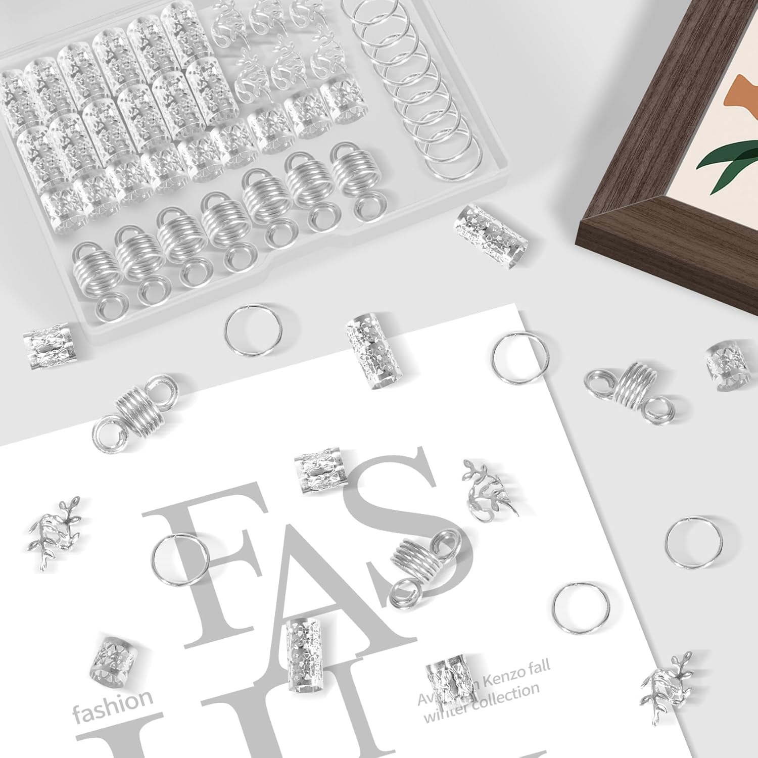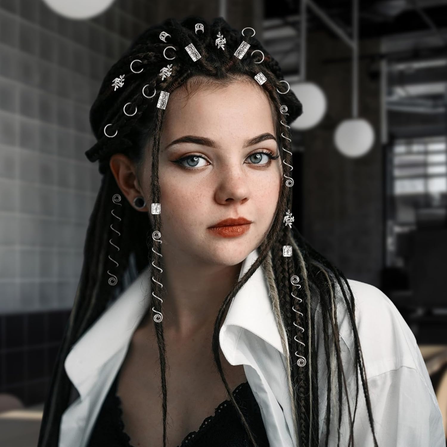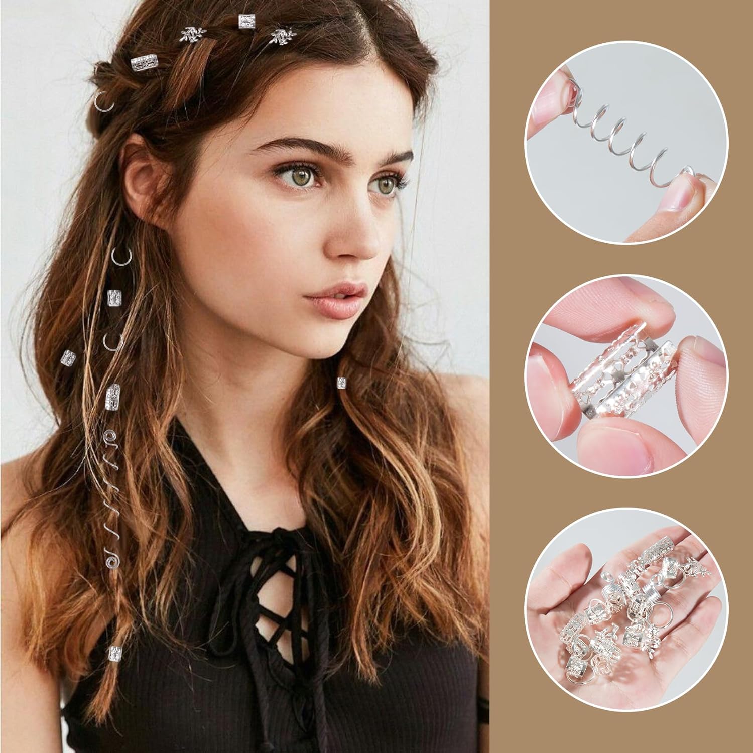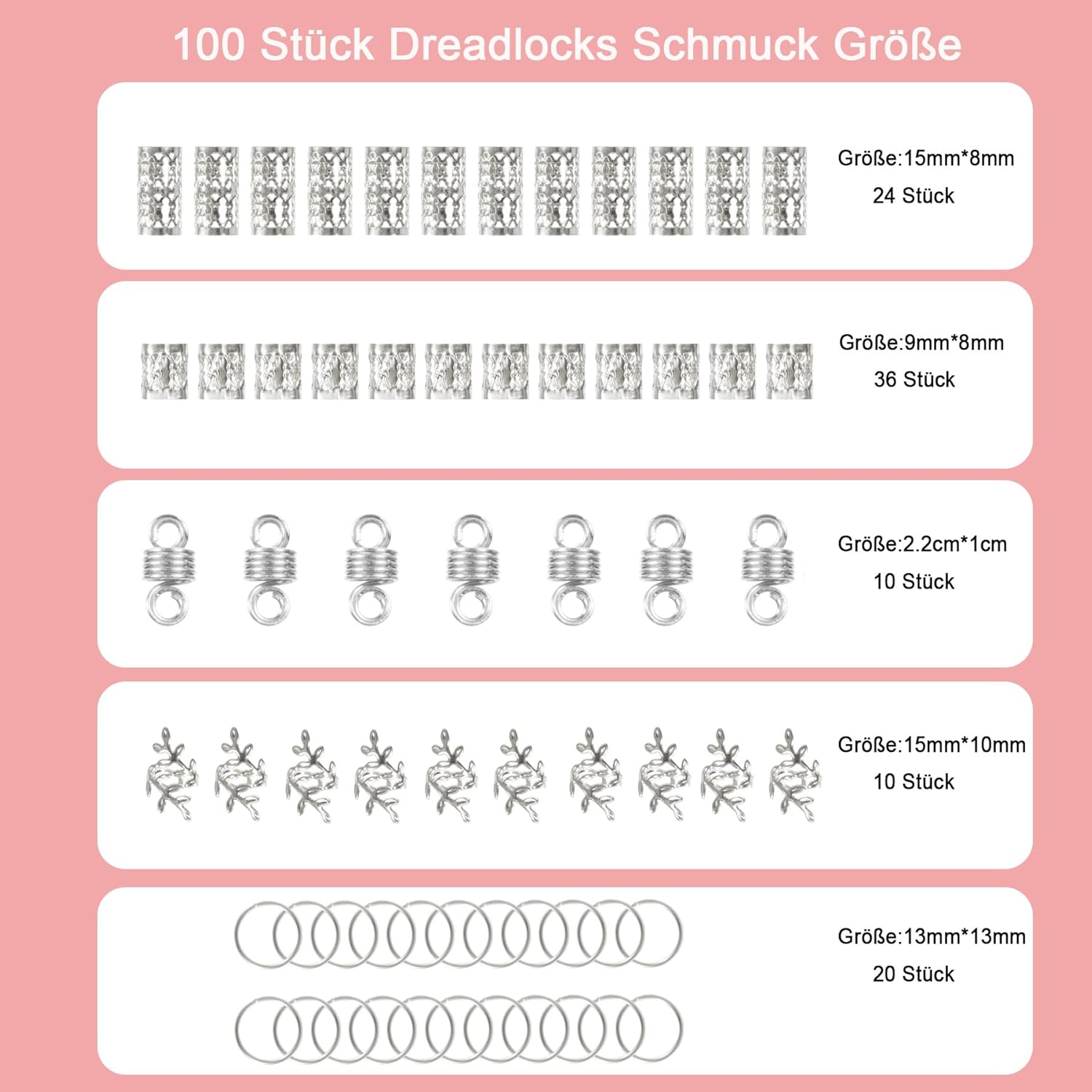 【Pacchetto incluso】Un totale di 100 accessori per capelli in argento con una scatola trasparente, facile e conveniente per riporli. Sono lucenti, classici e belli, puoi applicarli a trecce, code di cavallo, dreadlocks, extension per capelli, barbe, trecce di capelli e altro ancora, alla moda e alla moda, mostrano la tua personalità. 【Vari accessori per capelli in argento】 tra cui perline per dreadlocks in argento da 9 mm, perline per dreadlocks in argento da 15 mm, spirali per capelli in argento, anelli per trecce in argento e polsini per capelli in argento con design a foglie, per soddisfare tutte le tue esigenze di decorazione e rendere la tua acconciatura più attraente. 【Morsetti per capelli di alta qualità】 Questi accessori per capelli per trecce sono realizzati in materiale in lega di alta qualità e con tecnologia placcata, non arrugginiscono e il colore non sbiadisce. I gioielli con dreadlock per capelli sono anche morbidi ed elastici per tenere saldamente le ciocche, rimarranno saldamente in posizione e non danneggeranno i capelli. 【Facile da usare】 I gioielli per capelli intrecciati hanno una buona flessibilità, facili da aprire e chiudere, possono essere indossati su dreadlocks e trecce di tutte le dimensioni. Basta intrecciare i capelli nello stile desiderato, quindi aprire l'anello per capelli e metterlo direttamente tra i capelli o attorno ai dreadlocks, è possibile regolare la tenuta in base al volume dei capelli, quindi premere delicatamente i polsini per fissarli. Ampio utilizzo: i polsini con anelli per trecce di capelli sono un ottimo accessorio per extension e intrecciare i capelli lunghi, decorazione perfetta per varie acconciature, possono essere utilizzati nell'uso quotidiano e in molte occasioni come feste, sfilate di moda, concerti, balli studenteschi ecc., ed è adatto anche come regalo per il tuo amante, famiglia, amico e colleghi di lavoro.