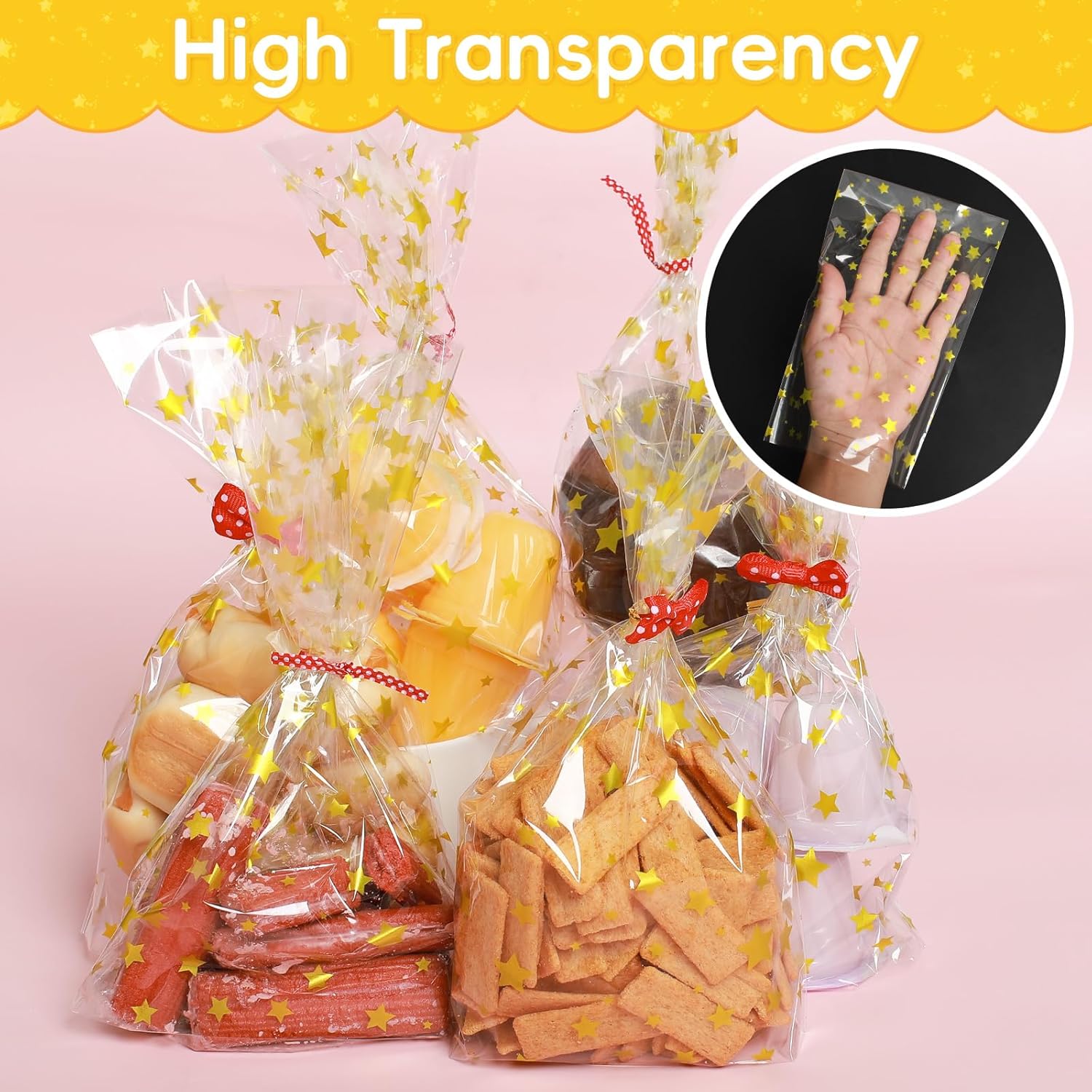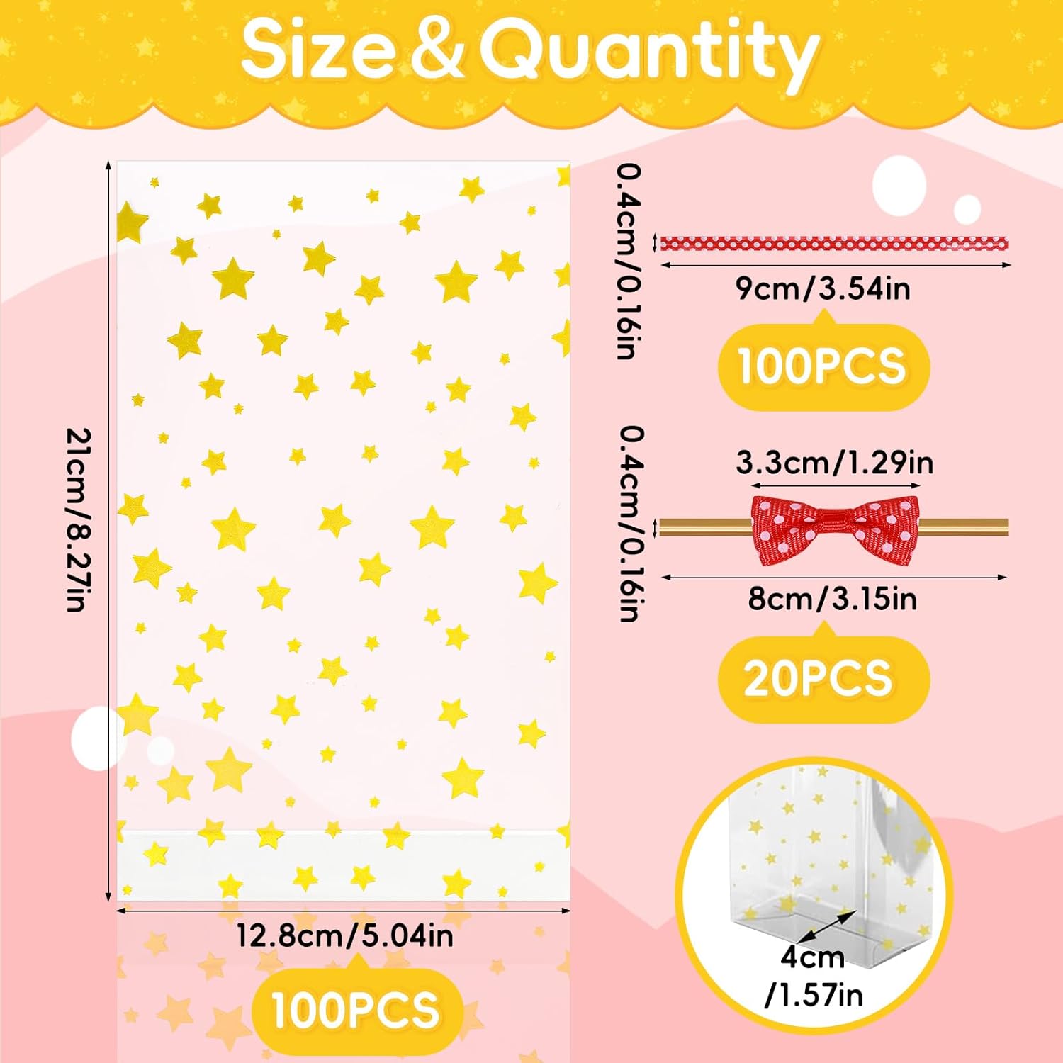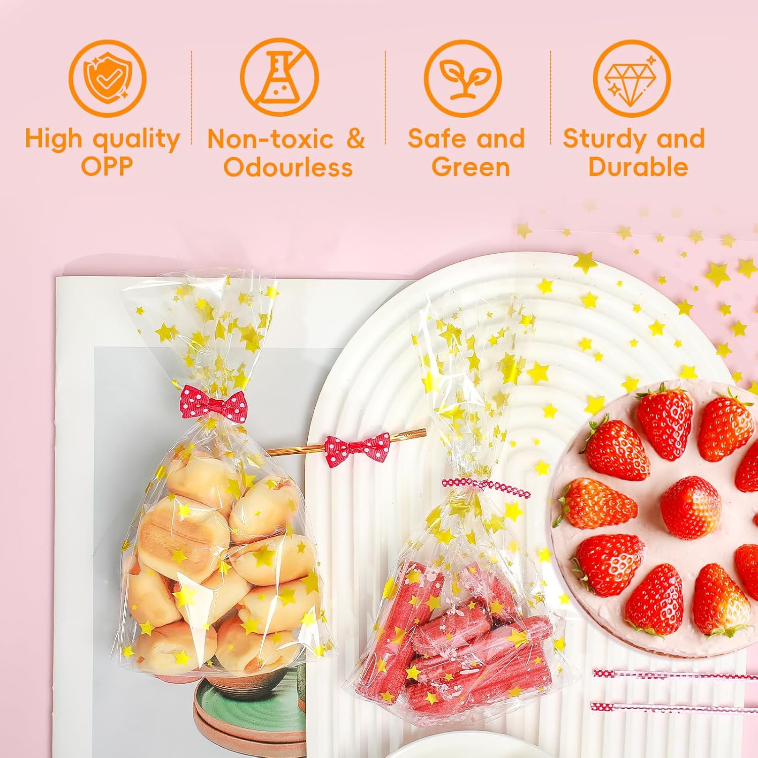 Specifiche: il set di sacchetti per caramelle contiene 120 sacchetti per caramelle dorati che misurano 21 x 12,8 centimetri con elevata trasparenza, 100 nuovi nastri metallici rossi densamente a pois e 20 fiocchi rossi per cravatta. Puoi regolarli liberamente per soddisfare le diverse esigenze, con quantità sufficienti, molto adatti per oggetti di grandi dimensioni o possono essere conservati per situazioni di emergenza. 【Materiale】I piccoli sacchetti regalo sono realizzati secondo rigorosi standard di qualità e sono realizzati al 100% in polipropilene deviato (OPP). Sono puliti, igienici, non tossici, inodori e rispettosi dell'ambiente. Sono più trasparenti dei sacchetti di plastica PP e sono adatti per il confezionamento degli alimenti. Possono entrare in contatto diretto con gli alimenti, hanno una buona ermeticità e garantiscono una maggiore freschezza e durata di conservazione degli alimenti. 【Estetica】I piccoli sacchetti regalo con stella dorata hanno una forma unica e un forte senso del design, che li rende festosi e accattivanti. Grazie al design autoportante a fondo piatto, l'imballaggio diventa più stabile. I fiocchi rossi a pois e i nastri rossi a pois sembrano belli e alla moda. Le fasce contengono fili di ferro morbidi, non facili da rompere e facili da arrotolare, sicuri e non feriscono le mani. 【Imballaggio trasparente】Il materiale trasparente consente di vedere il contenuto della confezione in modo chiaro e rapido, senza necessità di etichettatura e classificazione. Il design trasparente rende le grandi buste di cellophane più pulite e ordinate, e i bordi della borsa sono puliti e non si danneggiano facilmente. Bello, leggero, comodo da usare e fa risparmiare lavoro, è molto adatto per la protezione, lo stoccaggio, l'organizzazione e il trasporto. 【Ampiamente usato】Questi piccoli sacchetti di cellophane sono perfetti per conservare piccoli regali, cibo, biscotti, dolci, cioccolatini, mandorle, popcorn, marshmallow ecc. Possono proteggere bene il tuo cibo. I sacchetti di imballaggio trasparenti sono adatti non solo per Natale, ma anche per altre festività e occasioni, come bomboniere, compleanni, matrimoni, cerimonie di laurea e altre celebrazioni, rendendoli una confezione regalo molto creativa.