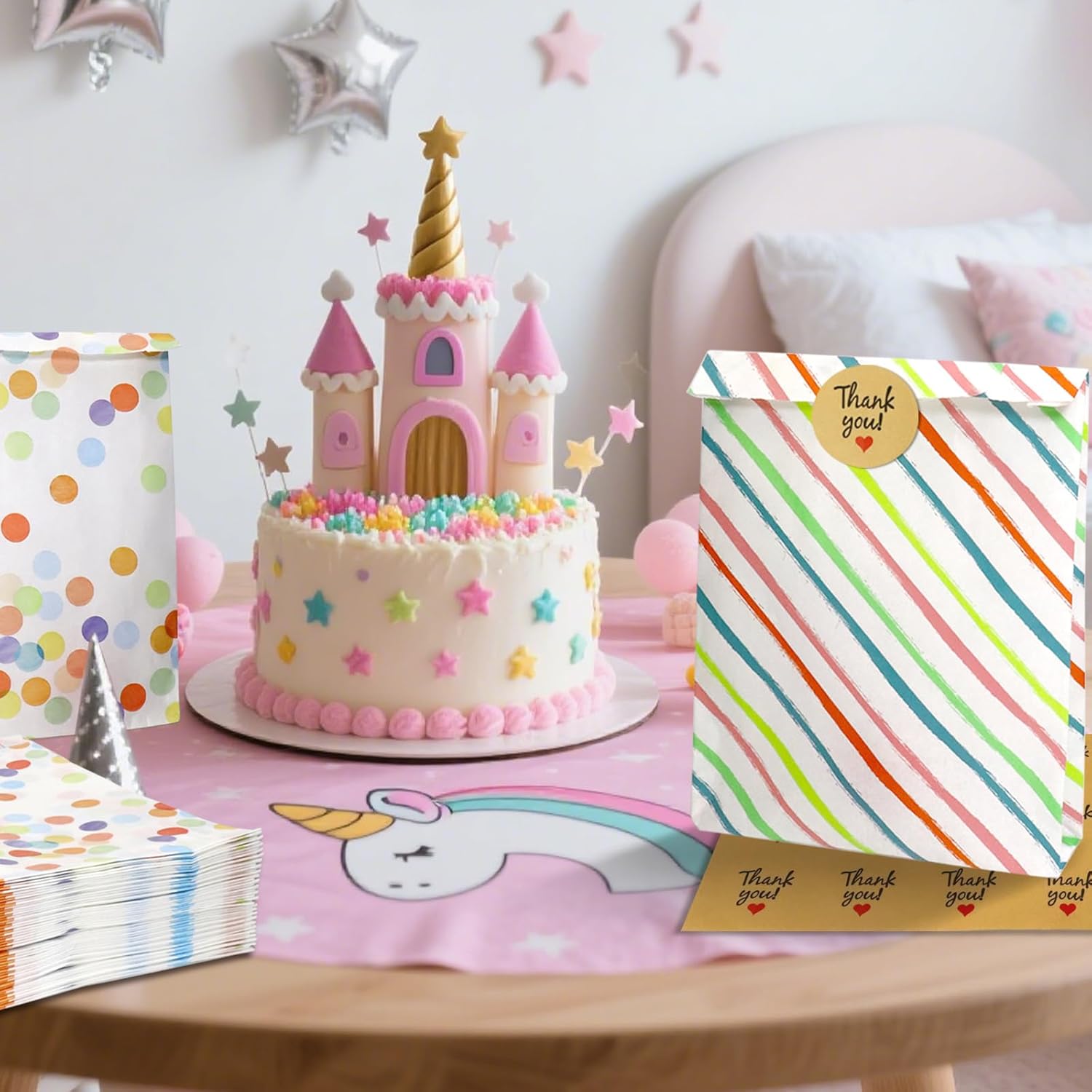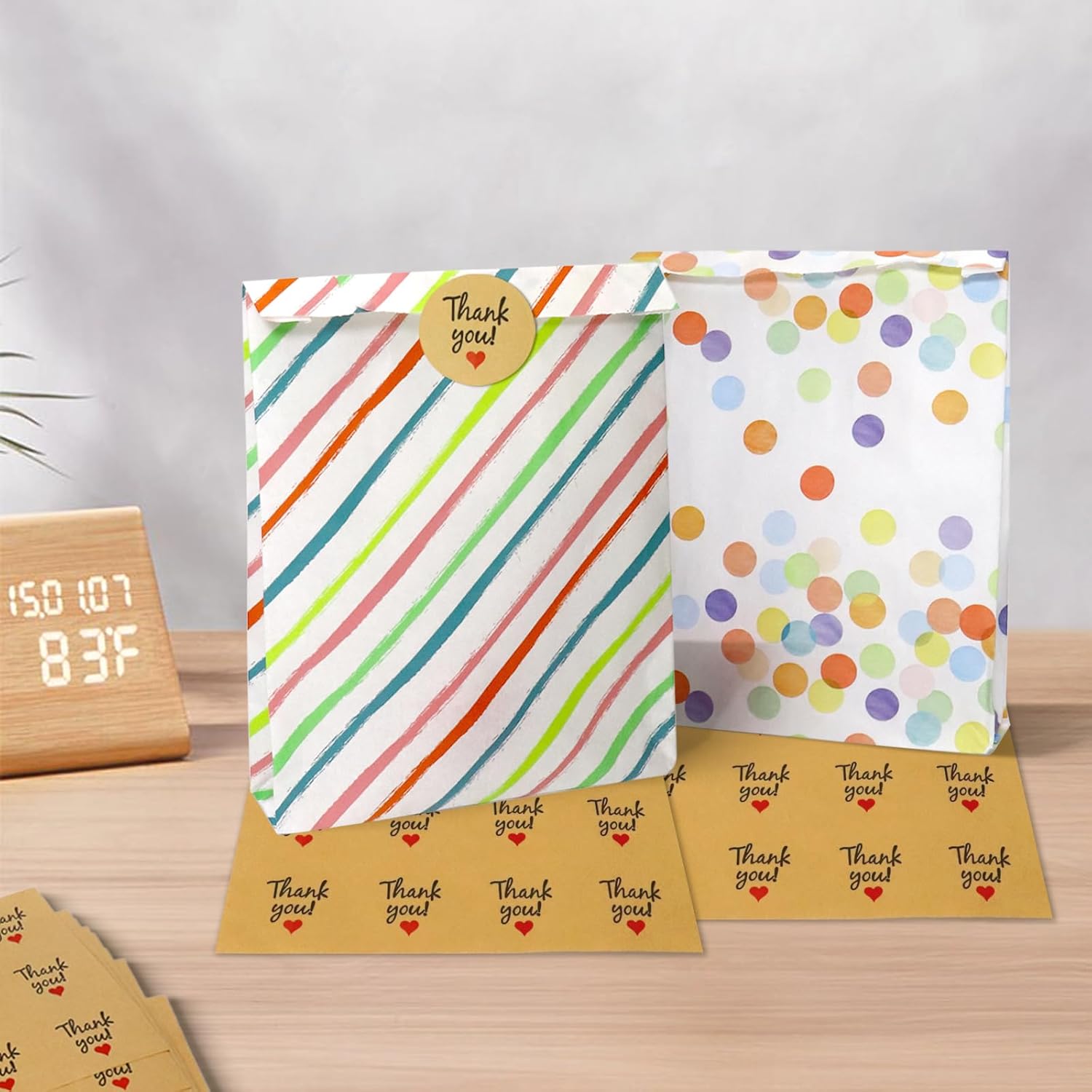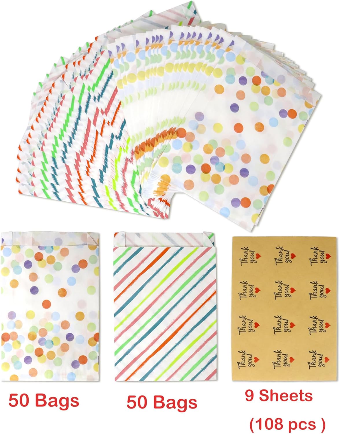 Cosa ottieni: la confezione contiene 100 sacchetti regalo con 2 diversi design carini e 108 adesivi. Misura adatta: ogni borsa da festa misura 13x19 cm, appropriata e comoda da usare, né troppo grande né troppo piccola. Qualità: Realizzati in materiale cartaceo, i nostri sacchetti per barrette di cioccolato sono progettati per essere più resistenti agli strappi rispetto ad altri sacchetti di carta, facili da aprire e da riempire e possono essere riutilizzati. Design carino: le nostre borse per compleanno sono multicolori e hanno 2 diversi design carini (a pois e strisce) che attireranno l'attenzione dei tuoi amici e clienti. Ampia applicazione: i nostri sacchetti regalo possono essere utilizzati come caramelle, dolcetti, sacchetti regalo o altro, ideali per feste di compleanno, matrimoni, Natale, Ringraziamento, ecc.