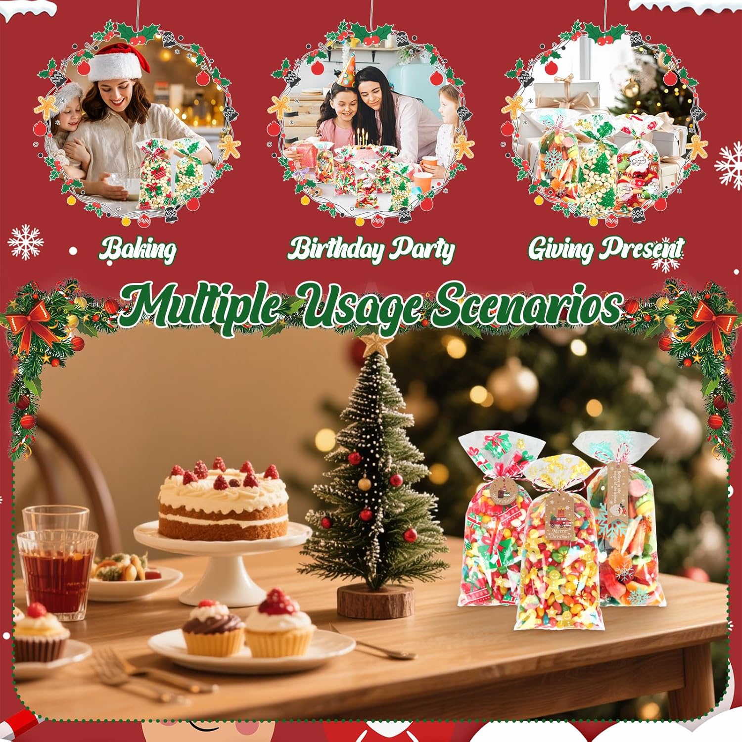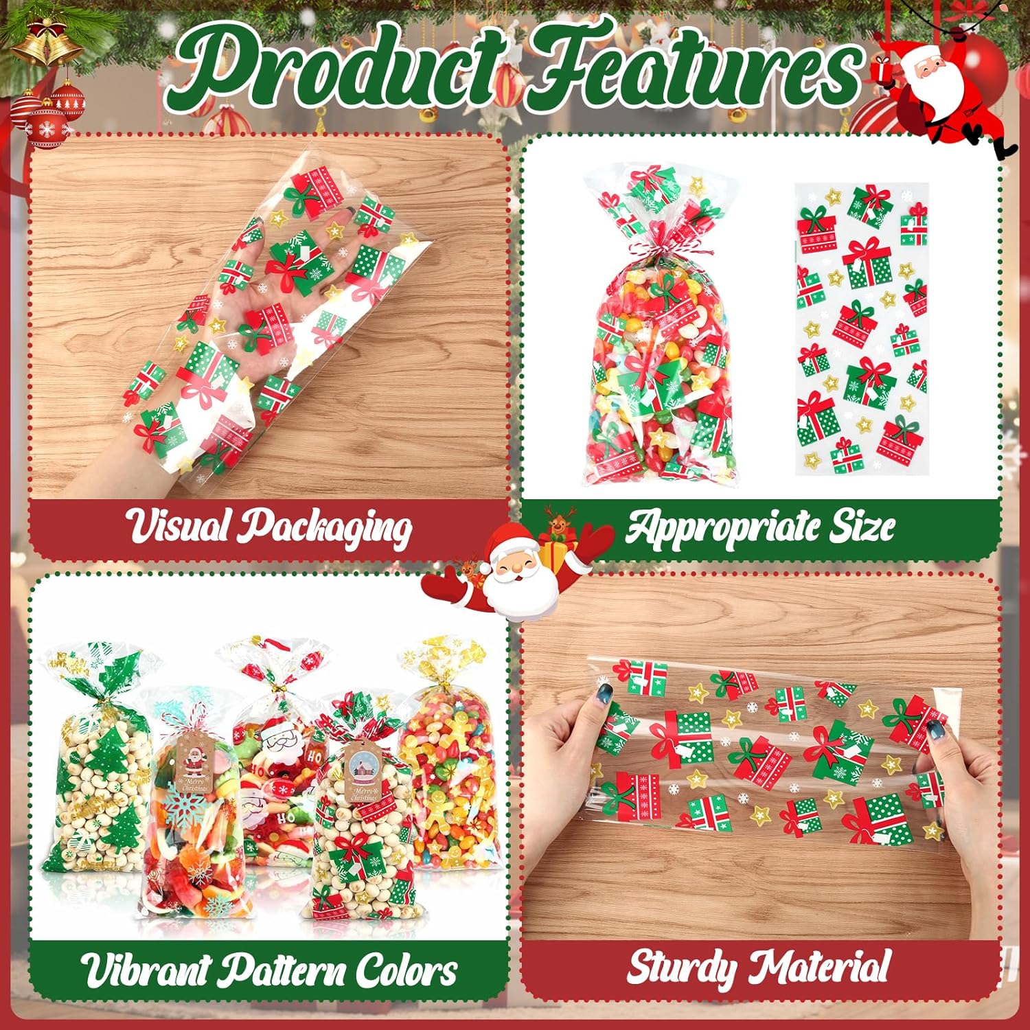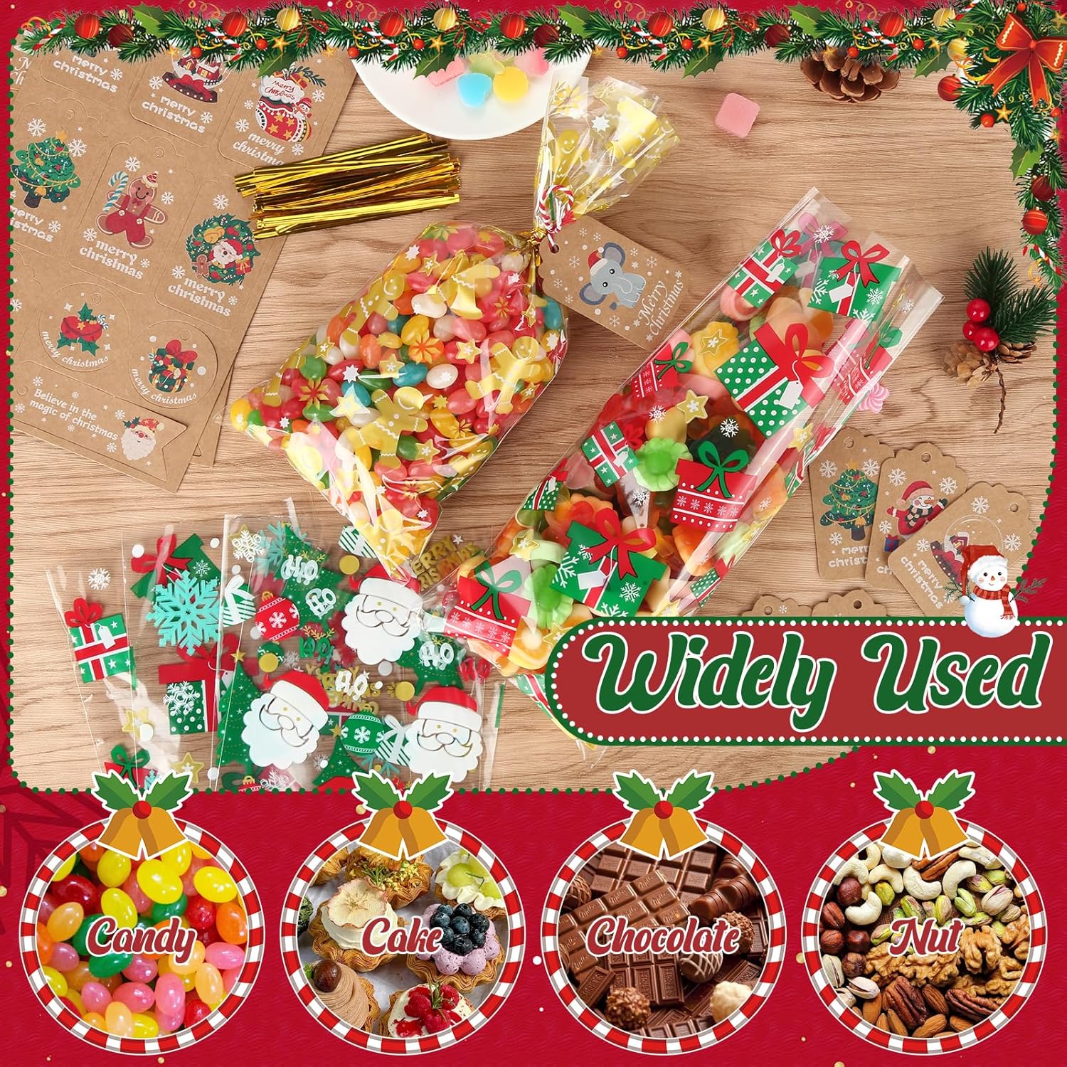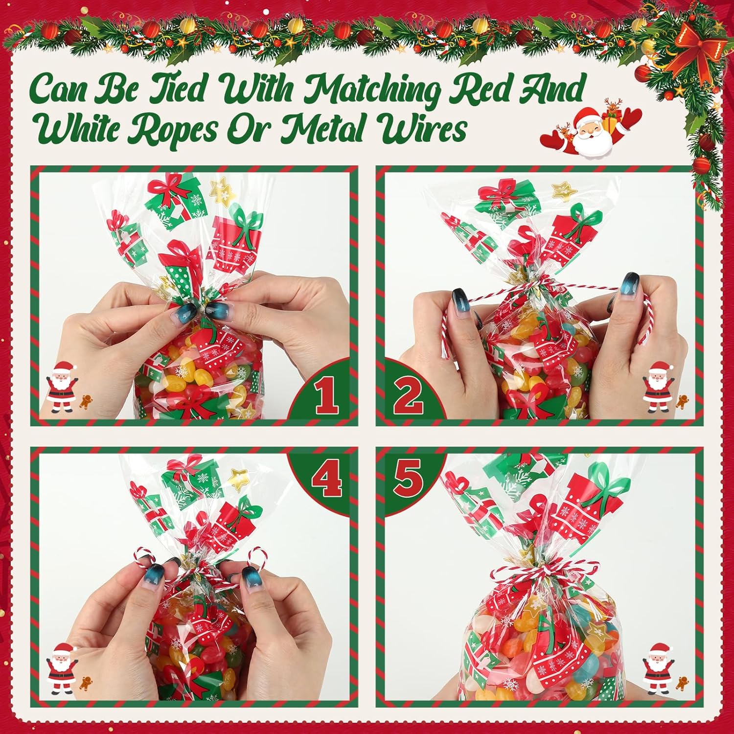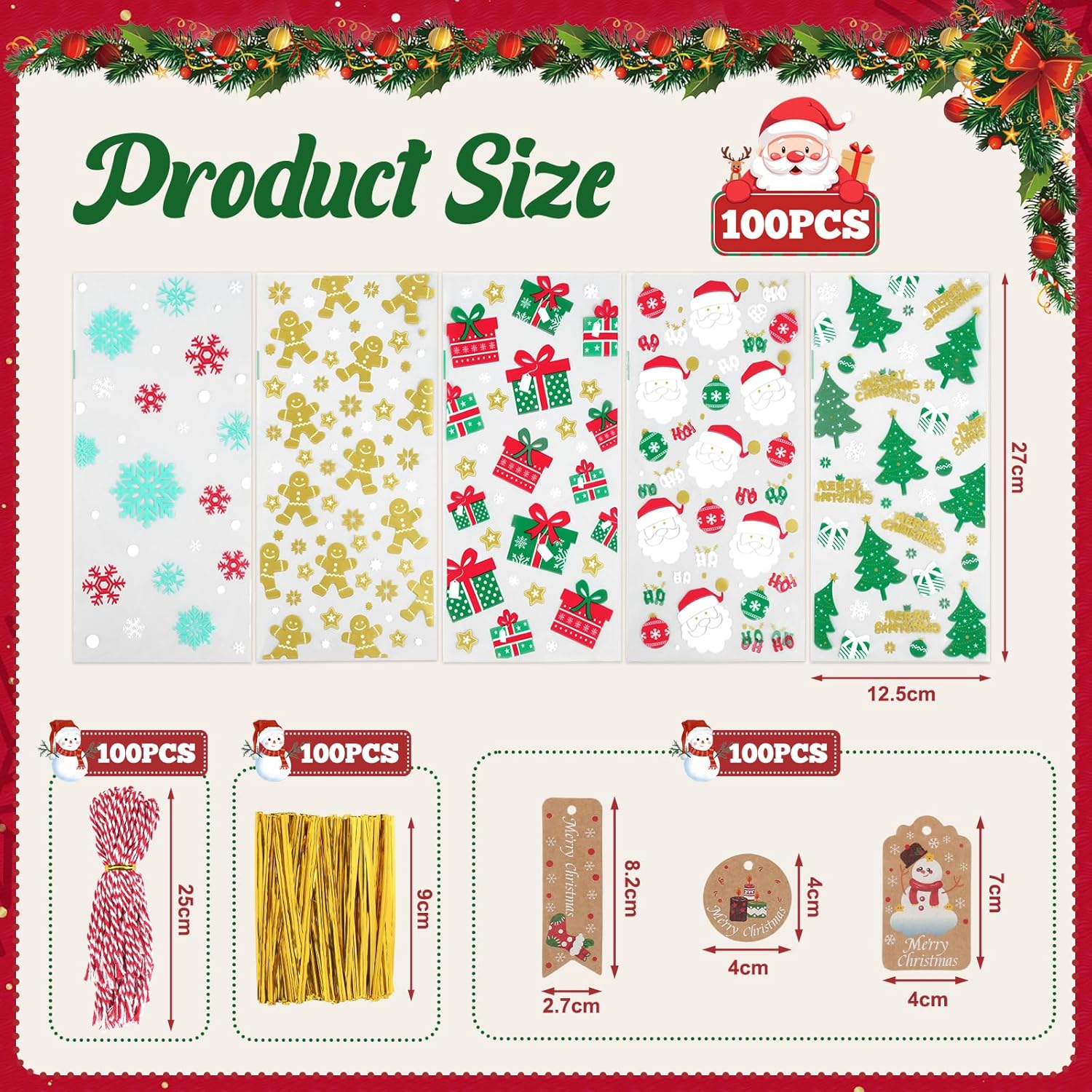 LA CONFEZIONE COMPRENDE: Questo set contiene 100 sacchetti regalo di Natale, con 100 cartoline di Natale, 100 fili bianchi rossi e 100 corde intrecciate dorate. Ideale per confezionare biscotti, caramelle, cioccolatini o piccoli regali. Grazie ai sacchetti trasparenti, i dolcetti sono immediatamente visibili, rendendoli la scelta ideale per qualsiasi festa di Natale o come confezione regalo. LA DIMENSIONE GIUSTA: Questi piccoli sacchetti natalizi misurano 12,5 x 27 cm e offrono spazio sufficiente per una varietà di oggetti da cucina come biscotti, cioccolata o noci. Questi sacchetti natalizi di dimensioni riempitive sono ideali per imballare in modo sicuro gli alimenti garantendo allo stesso tempo un'esposizione attraente, ideale per dolci fatti in casa o piccoli regali. MATERIALE PLASTICO DI ALTA QUALITÀ: I sacchetti per biscotti natalizi sono realizzati in materiale plastico trasparente, inodore e particolarmente robusto. I materiali assicurano che i tuoi dolci e regali siano mantenuti freschi e al sicuro senza che i sacchetti si strappino facilmente o siano permeabili. FACILE DA USARE E SIGILLATURA RAPIDA: Con i 100 fili dorati inclusi puoi sigillare i sacchetti di Natale in modo sicuro e veloce. Il design pratico consente una manipolazione semplice, così puoi mettere i tuoi pasticcini o dolciumi in questi sacchetti di cellophane natalizi. ATMOSFERA NATALIZIA IDEALE: Ogni sacchetto di biscotti natalizi è decorato con un motivo natalizio unico come fiocchi di neve, alberi di Natale o Babbo Natale. Questi design festivi aiutano a creare un'atmosfera allegra e calda, ideale per qualsiasi festa di Natale o evento festivo.