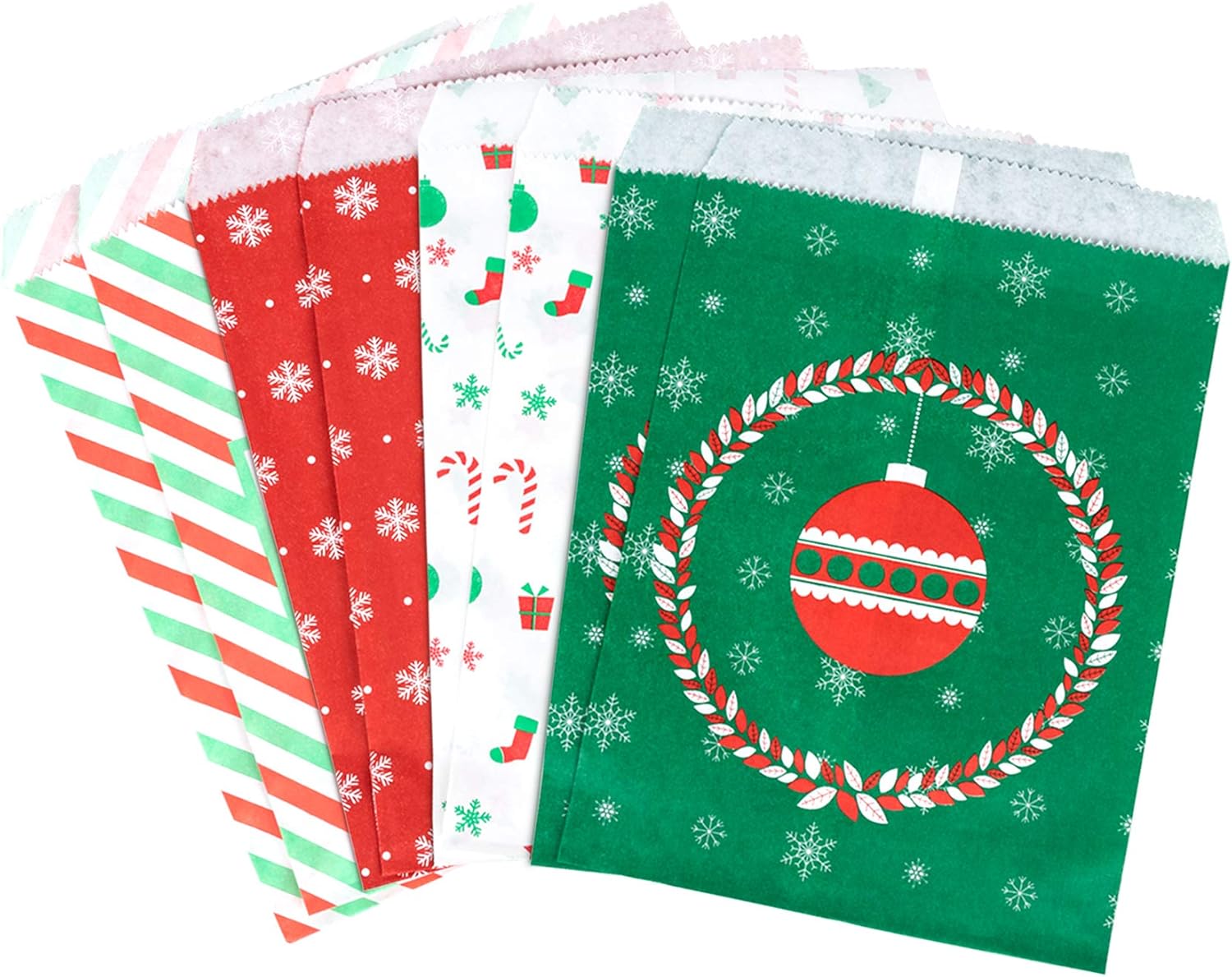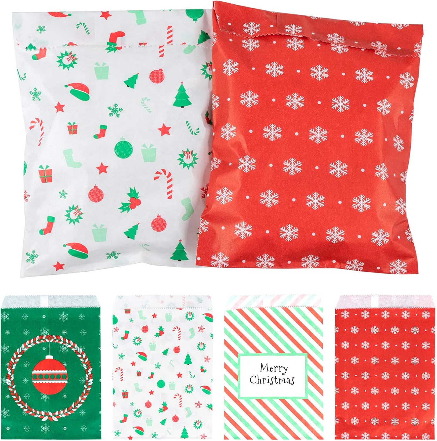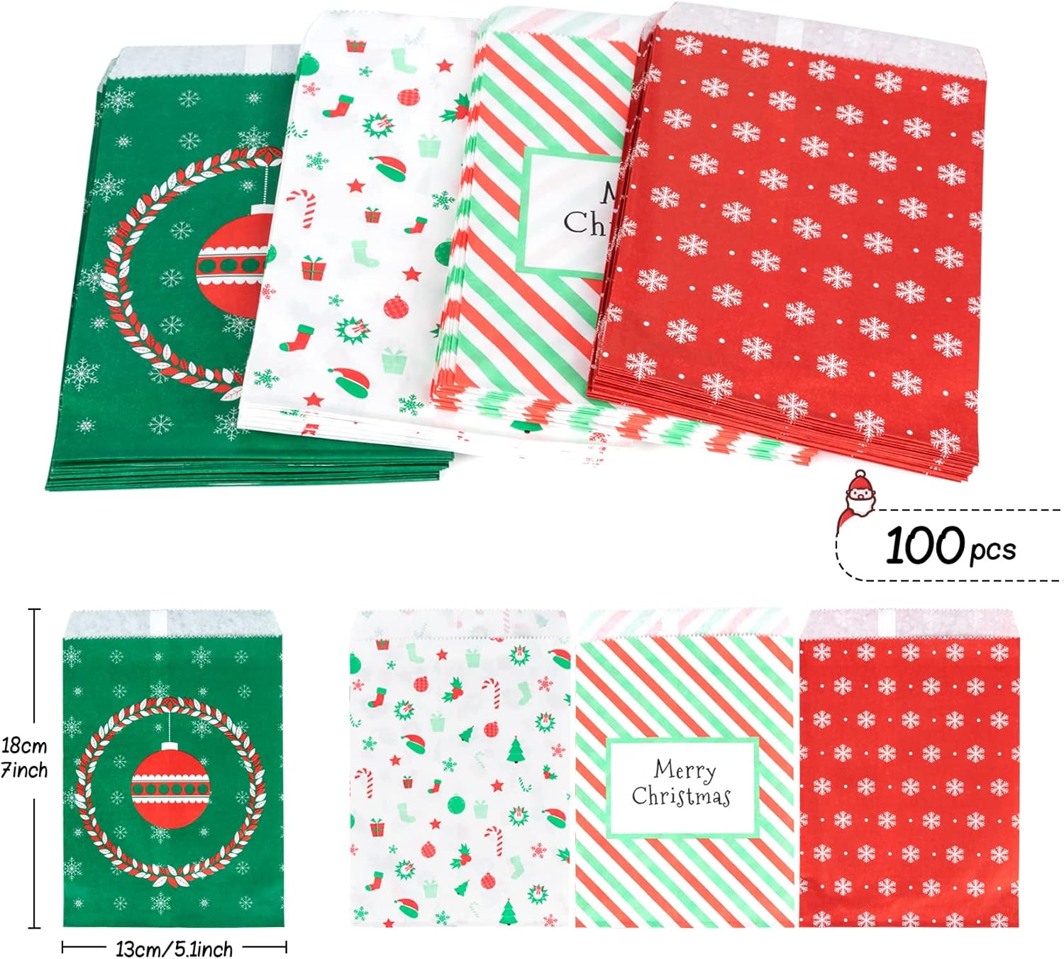 Sacchetti regalo di Natale: sacchetti per caramelle e sacchetti per dolci, 4 modelli diversi, 25 pezzi ciascuno, per un totale di 100 sacchetti nella confezione. Dimensioni: ca. 13x18 cm Per tutti i tipi di dolci come caramelle, cioccolato, biscotti, ecc. ma anche come sacchetti regalo per il calendario dell'Avvento per farsi tanti altri piccoli regali. Può essere utilizzato anche per bomboniere o piccoli regali, come bella decorazione da tavola in occasione di matrimoni e altre celebrazioni. Design natalizio: motivo natalizio classico e bellissimo, design opaco, perfetto sacchetto per riempire il calendario natalizio fai-da-te, regala alla tua famiglia una sorpresa natalizia! Materiale biodegradabile per uso alimentare: è sicuro, sano e completamente decomposto dopo l'uso e non provoca inquinamento ambientale.