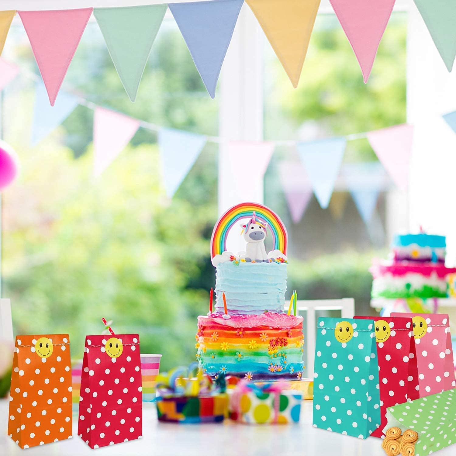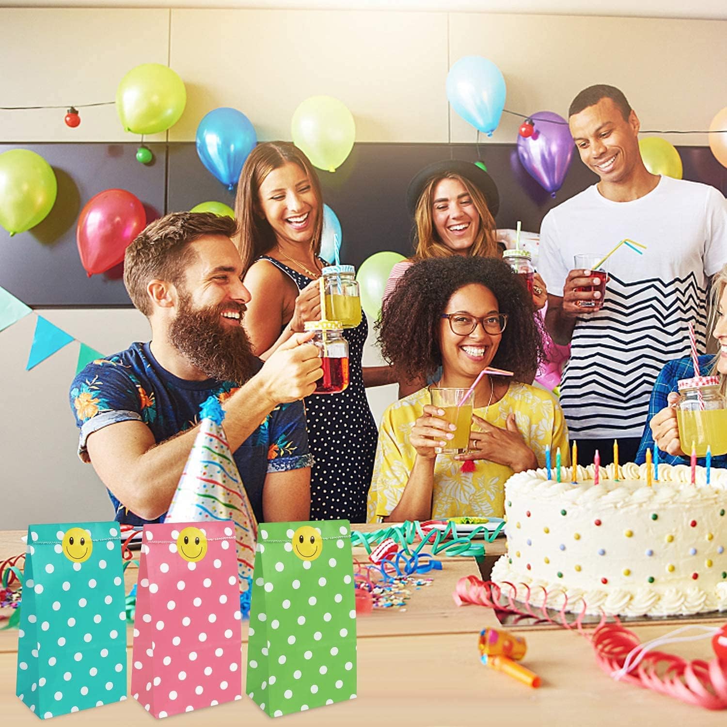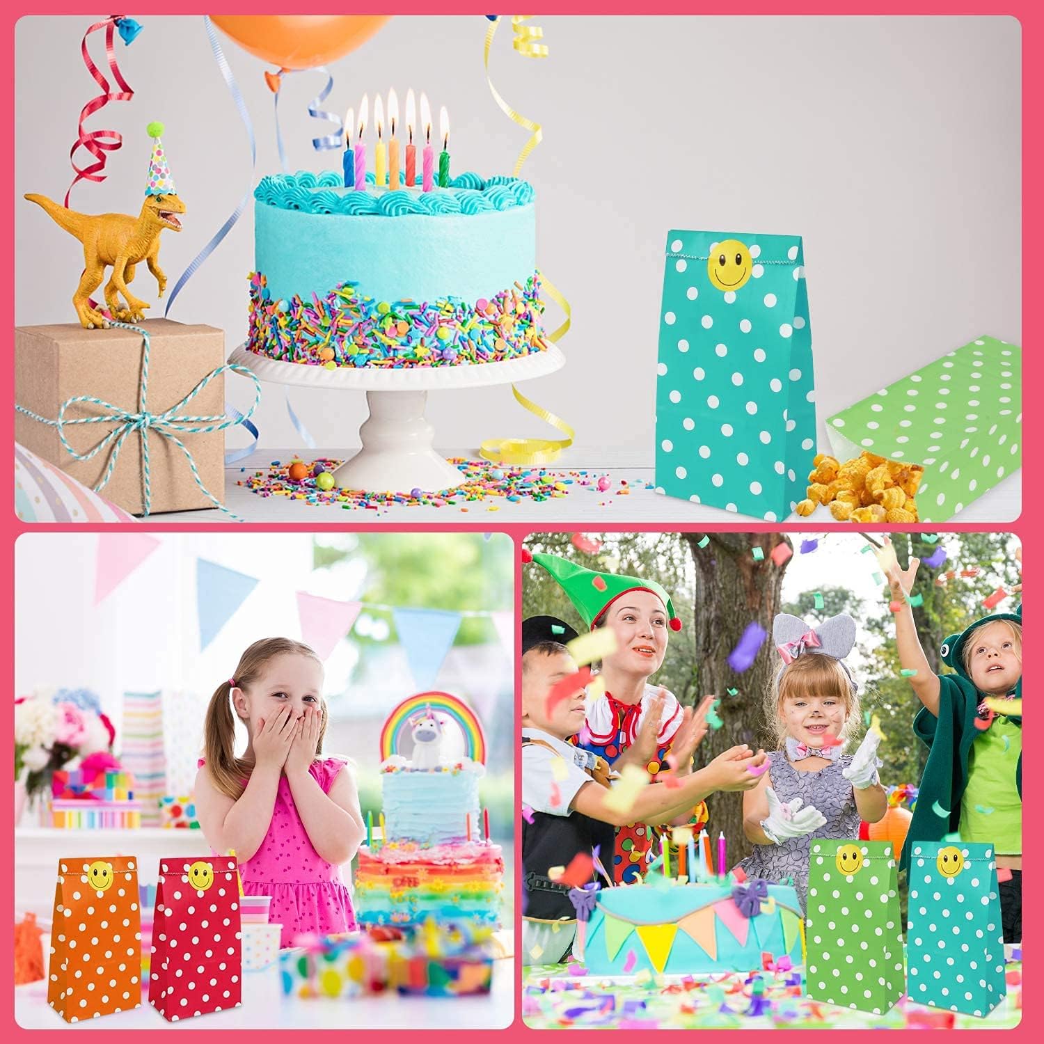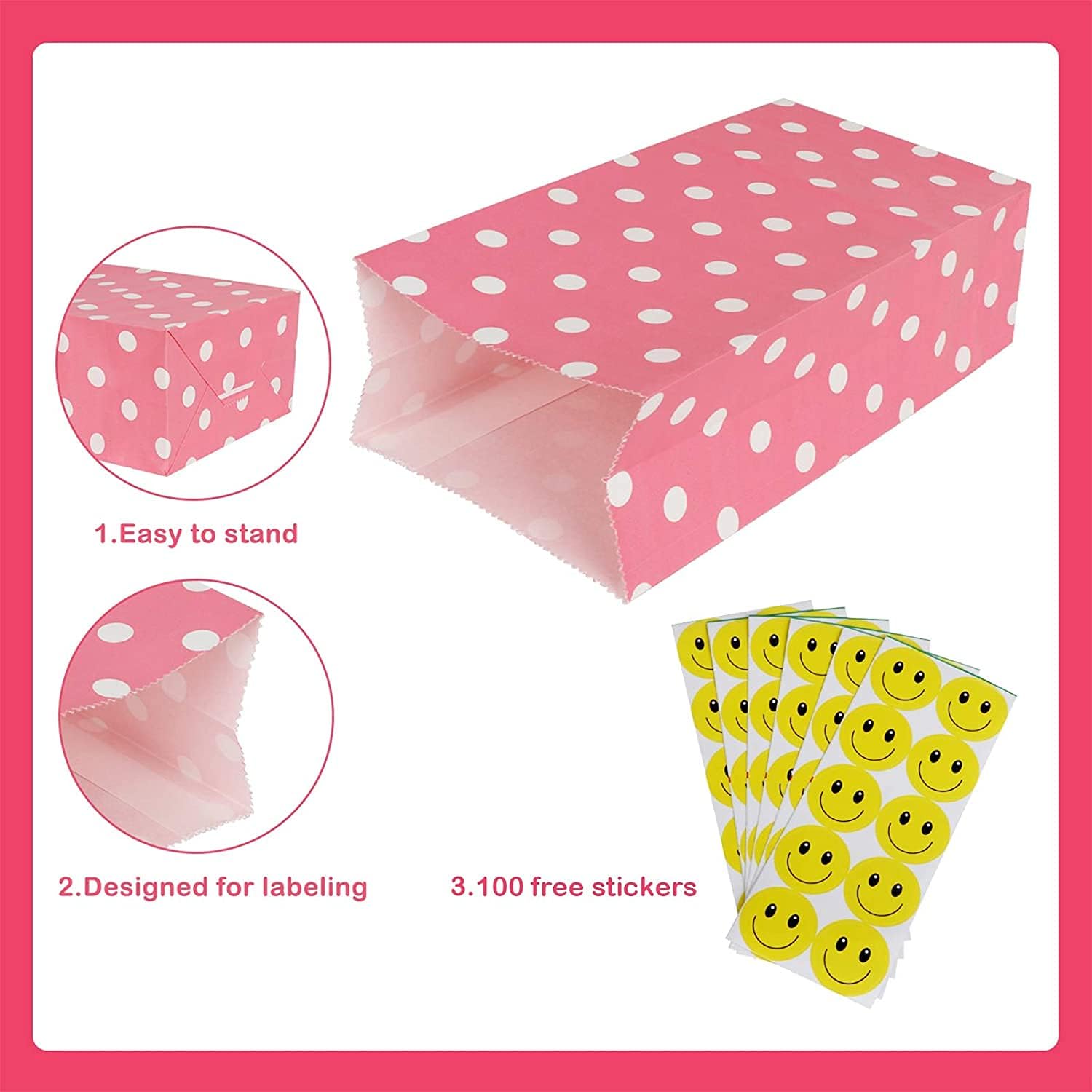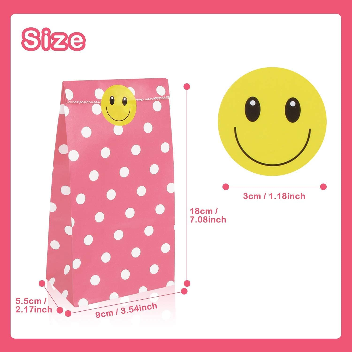 Confezione e dimensioni: 18x9x5,5 cm Ci sono 100 sacchetti per feste in carta a pois in 5 colori, tra cui rosso, verde, giallo, rosa e azzurro. Questi piccoli sacchetti regalo hanno colori vivaci e stampe chiare. Adesivi carini: riceverai 100 adesivi carini con facce sorridenti gialle. Sono autoadesivi e possono essere utilizzati per sigillare, etichettare e classificare questi sacchetti regalo di carta. Design rinforzato: questi piccoli sacchetti di carta non sono facili da dividere e strappare e possono essere riutilizzati. Facile da usare: questi piccoli sacchetti di carta sono pieghevoli. Puoi piegare i sacchetti di carta per riporli. Può essere posizionato separatamente, facile da imballare e fai da te e aggiungere un po' di creatività. Sacchetti di carta multiuso: sacchetti regalo semplici e raffinati, adatti per feste di compleanno, matrimoni, festa dei bambini e Natale, Ringraziamento e Halloween. Può essere utilizzato anche come piccola borsa per la conservazione quotidiana.