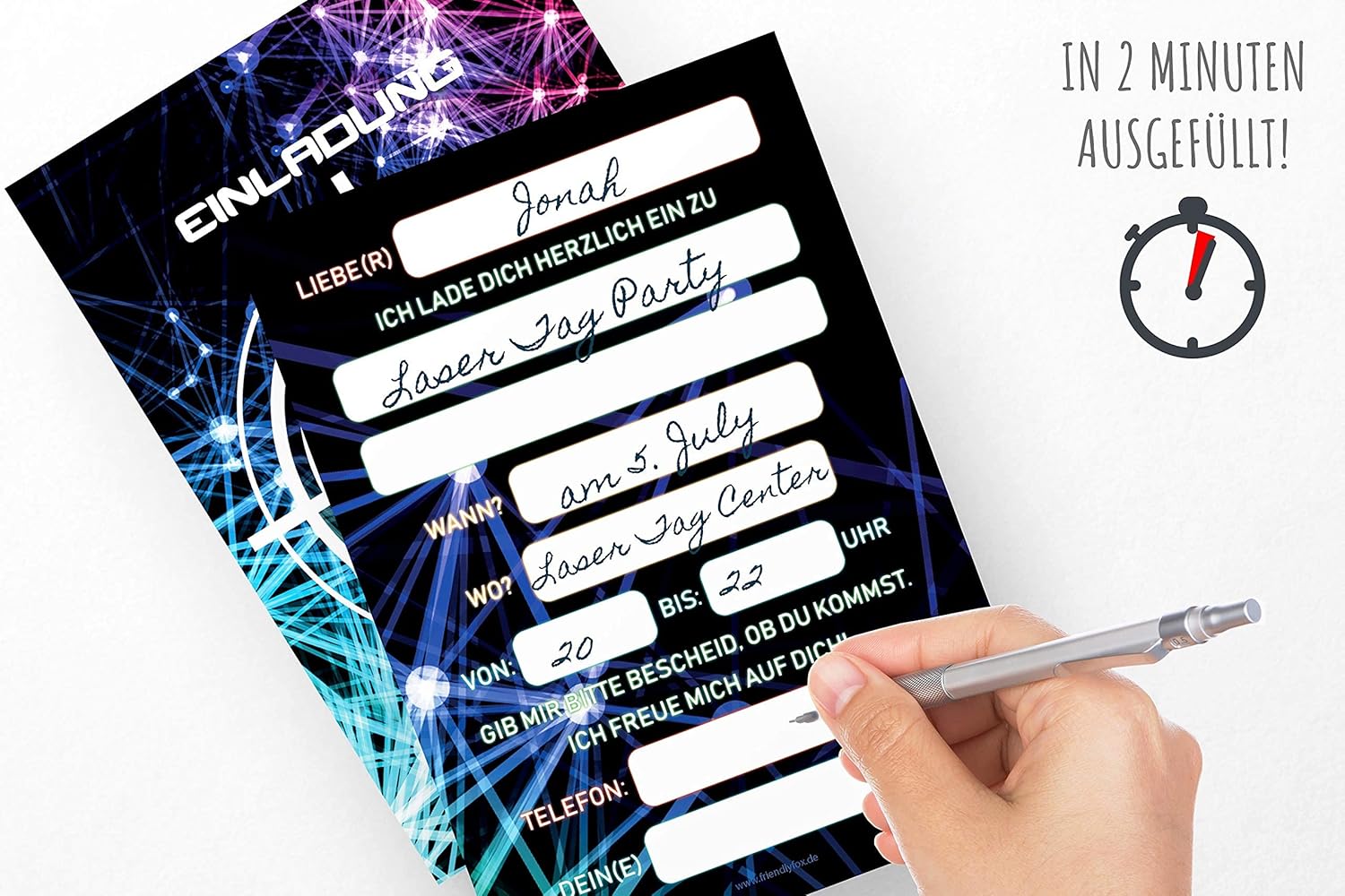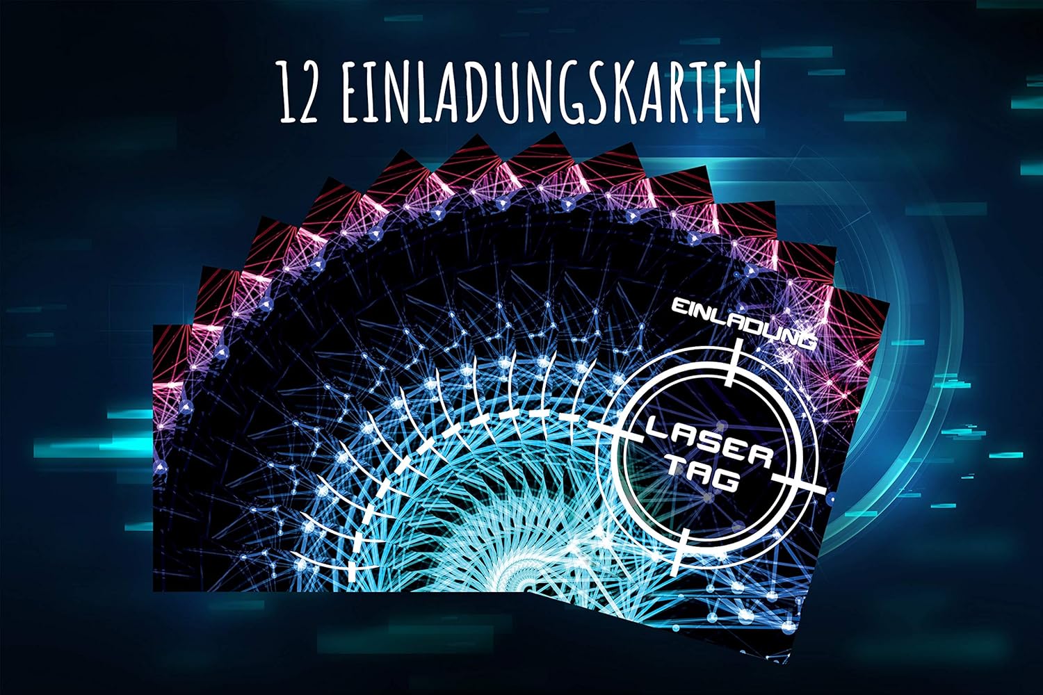 GIOCO SU – Affinché la tua festa laser possa iniziare presto, abbiamo raccolto 12 carte laser alla moda nel nostro set di biglietti d'invito. Con questi biglietti d'invito di compleanno casual per bambini, puoi invitare i tuoi amici alla velocità della luce ed entrare subito in modalità gioco. Lazertag Party – Con le 12 carte Lazertag alla moda puoi invitare i tuoi amici alla tua festa in un batter d'occhio. I pratici inviti per feste (DIN A6) si adattano a qualsiasi zaino o borsa. Biglietti d'invito già pronti: nessun noioso fai da te e la creazione di inviti. Nessun errore di ortografia. Grazie al retro già predisposto non dovrai fare altro che inserire i dati chiave di base. Sempre adatti: i fantastici biglietti per feste con laser tag sono adatti a ragazzi, ragazze e giovani adulti che festeggiano un compleanno a tema in un centro laser tag. Altissima qualità: i nostri biglietti d'invito sono stampati al laser su cartone da 300 g/m² e sono quindi molto stabili. Gli inviti di compleanno arrivano senza buste.
