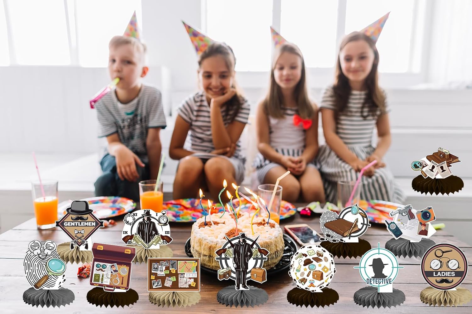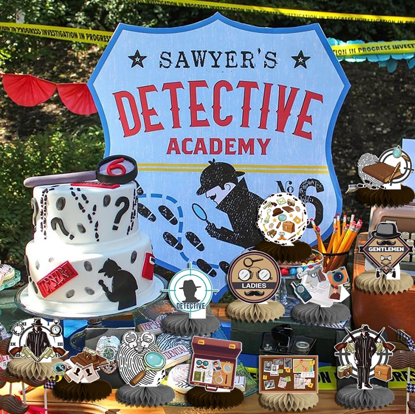 Decorazioni per feste da detective: riceverai 12 pezzi di centrotavola da detective a nido d'ape, contiene 12 carte fantasia e 12 celle di carta. Decorazione ideale per feste a tema detective e feste a tema misterioso. Alta qualità: i centri di rilevamento a nido d'ape sono realizzati in cartone resistente e durevole e carta sottile di alta qualità, non facile da piegare e strappare, stampa trasparente, leggero, facile da riporre e trasportare. Modelli a tema spia misteriosa: la nostra festa a tema detective è stata attentamente progettata dal designer e utilizza modelli di detective segreti, tra cui lenti d'ingrandimento, foto, manette, foto, impronte, macchine fotografiche, occhiali e modelli di barba finta, penne, quaderni, valigette, walkie-talkie, torce elettriche, cappelli da detective e altri modelli di oggetti da detective correlati. È misterioso e interessante e attirerà rapidamente l'attenzione, immergendo tutti in un fantastico mondo investigativo. Facile da montare: passaggio 1, staccare l'adesivo dal nido del detective. Passaggio 2: inserisci la carta a tema detective in un'area fissa. Passaggio 3, eseguire la stessa operazione sull'altro lato. Quindi posiziona la cella detective installata sul tavolo per decorare la tua festa a tema detective. Occasioni: le nostre forniture per feste detective sono adatte per varie occasioni, come feste a tema detective, festa di compleanno detective, festa a tema spia, festa a tema top secret, festa a tema detective anni '20, festa a tema retrò, festa sul palco, decorazioni per la casa, eventi di giochi di ruolo e altri eventi al chiuso o all'aperto.
