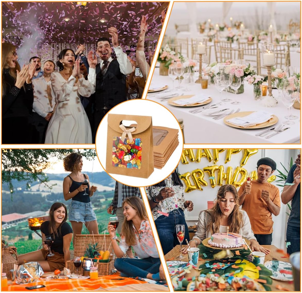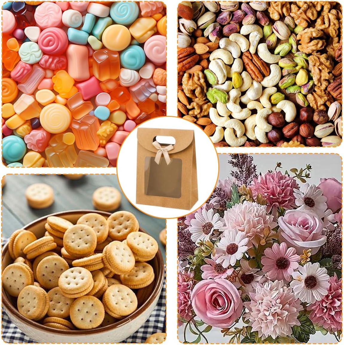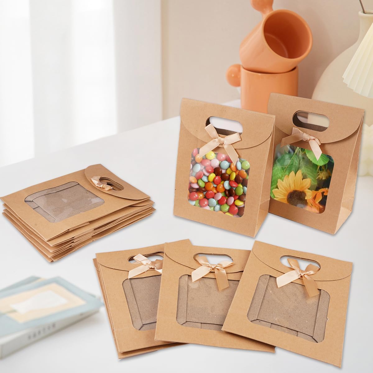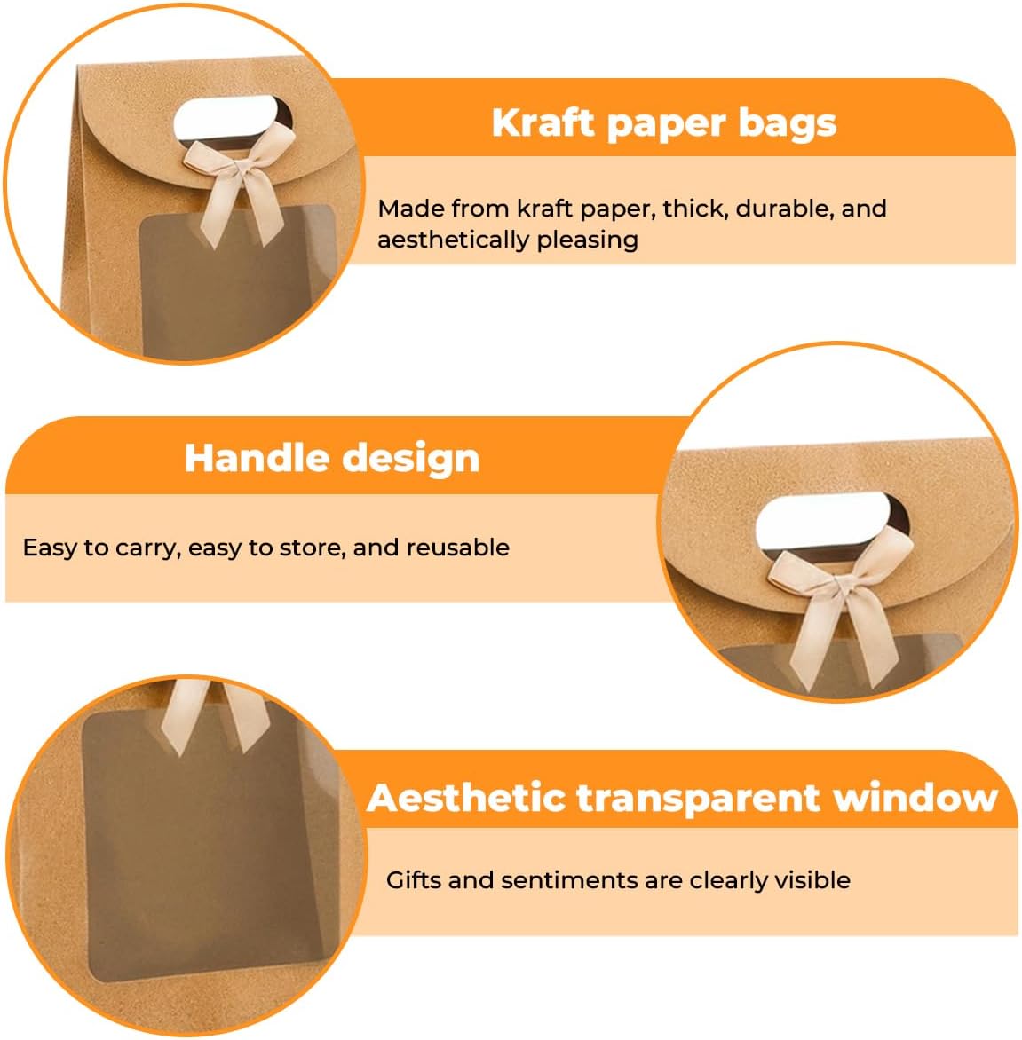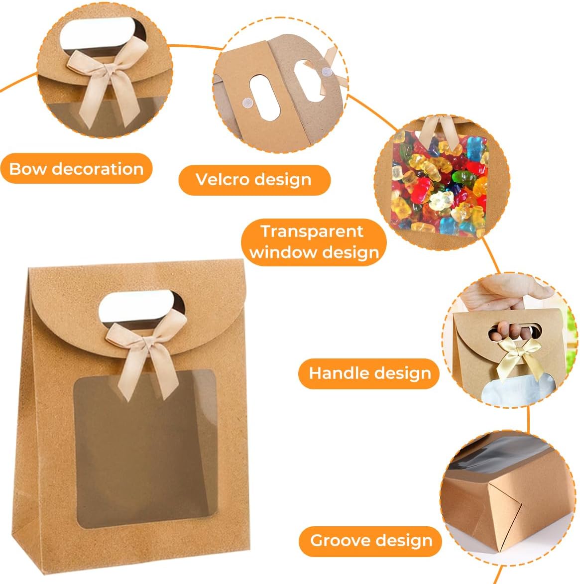 Materiale: sacchetto regalo piccolo in carta kraft marrone con finestra realizzato in carta kraft rinforzata di alta qualità, robusto e durevole, compatto ed elegante, morbido al tatto, durevole e riutilizzabile. Design pratico: sacchetti regalo marroni piccoli con finestra con maniglia per il trasporto e finestra trasparente, che non solo facilita il trasporto, ma rende anche il contenuto chiaramente visibile. La base rettangolare assicura che la borsa rimanga in posizione verticale e che il contenuto rimanga al sicuro all'interno. Pieghevole e salvaspazio: il sacchetto da imballaggio in carta kraft marrone può essere piegato o impilato per risparmiare spazio. Riutilizzabile perché, a differenza del nastro adesivo, la chiusura in velcro può essere utilizzata più volte senza perdere la sua forza adesiva. Ampia gamma di usi: il sacchetto regalo marrone con finestra può essere utilizzato per confezionare caramelle nuziali, noci, biscotti, accessori e piccoli regali, adatto per feste, compleanni, matrimoni, Natale, Ringraziamento e altre festività. Il miglior sacchetto regalo: sacchetti regalo piccoli con finestra. Ideale per confezionare regali o doni principali, ad esempio regali, dolci, snack, ecc., che potrete regalare ai vostri cari e che sorprenderanno i vostri cari.
