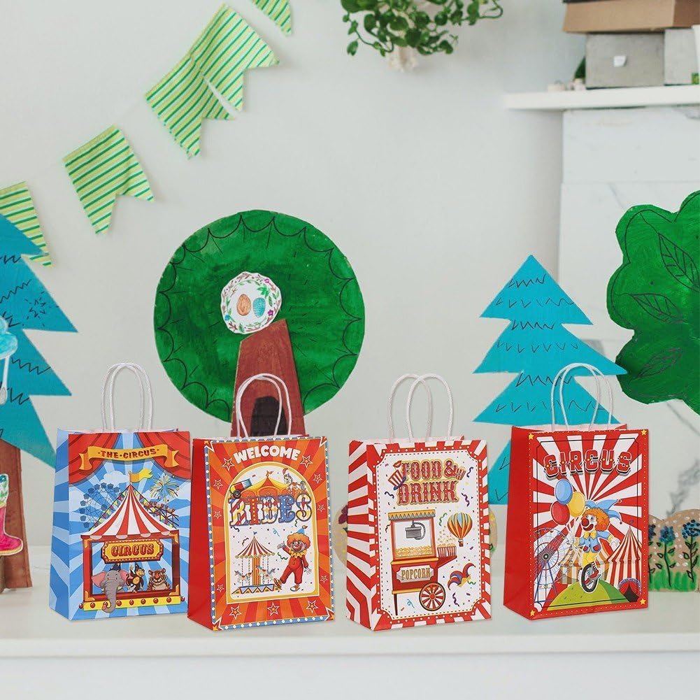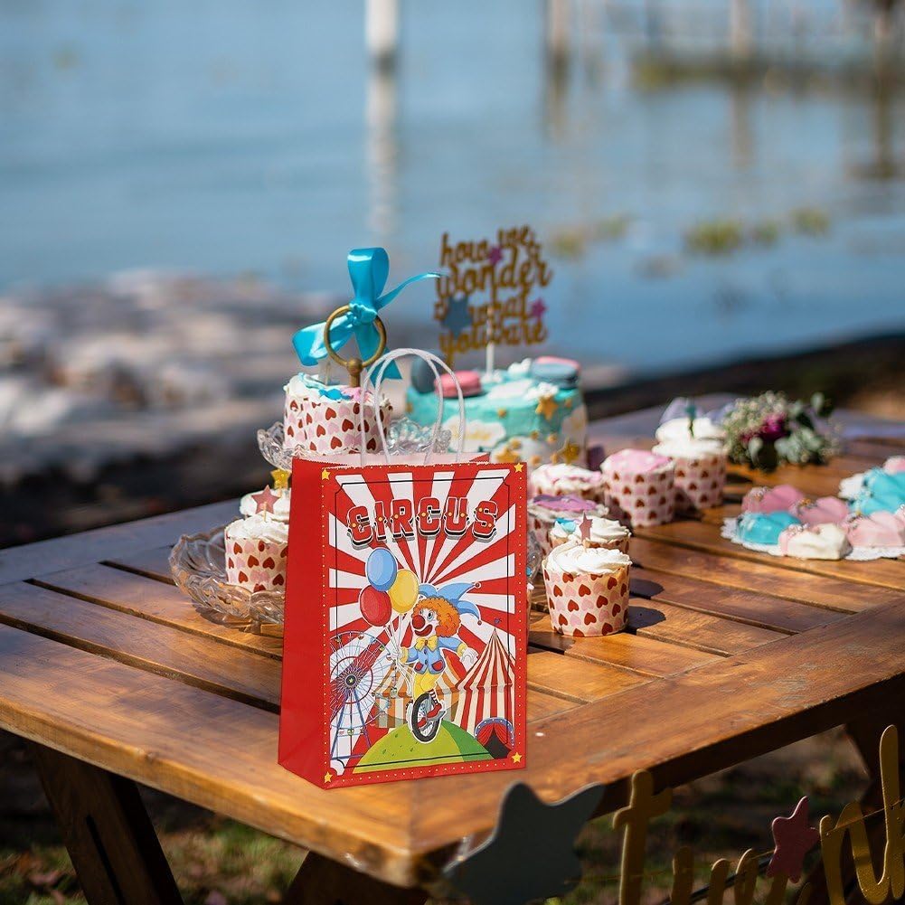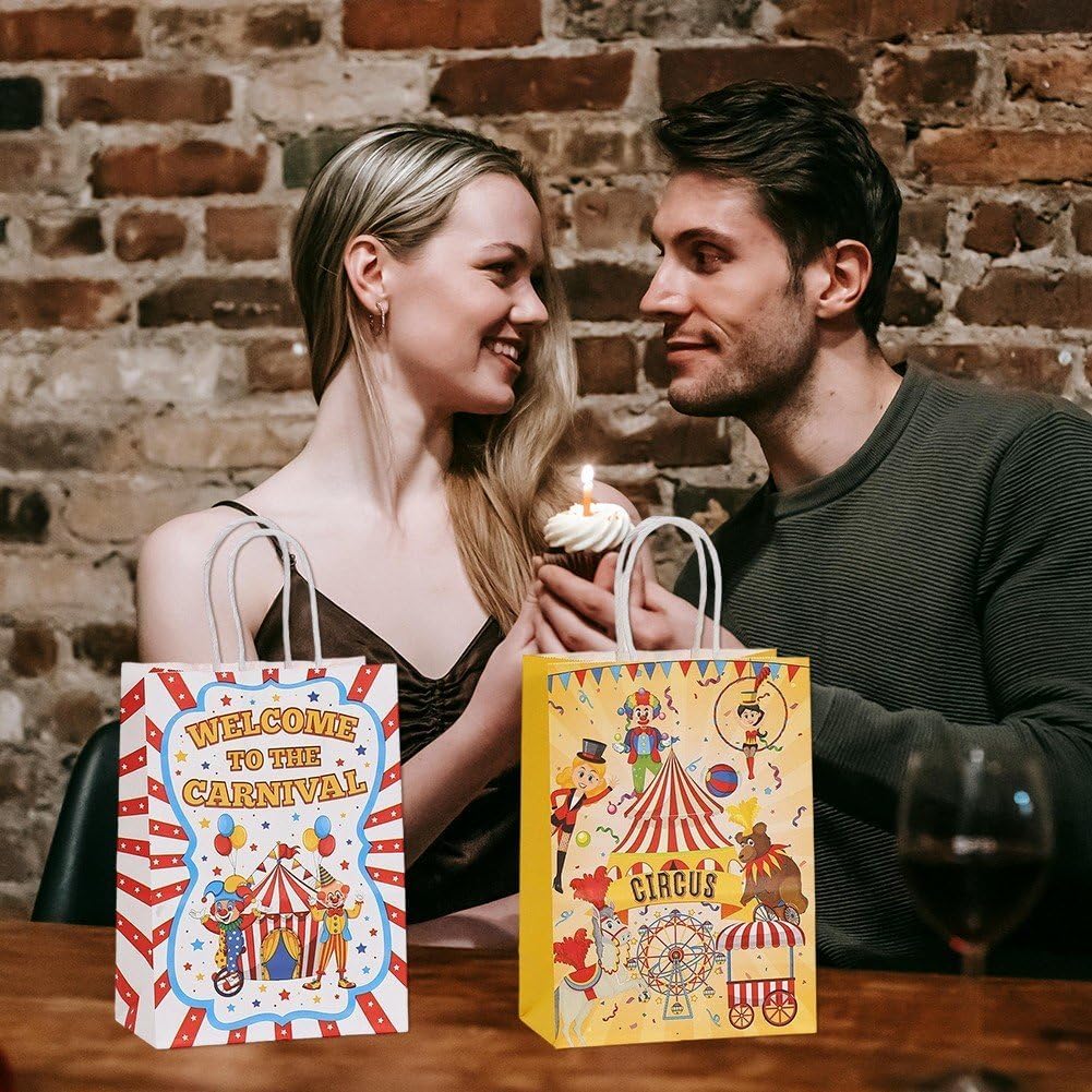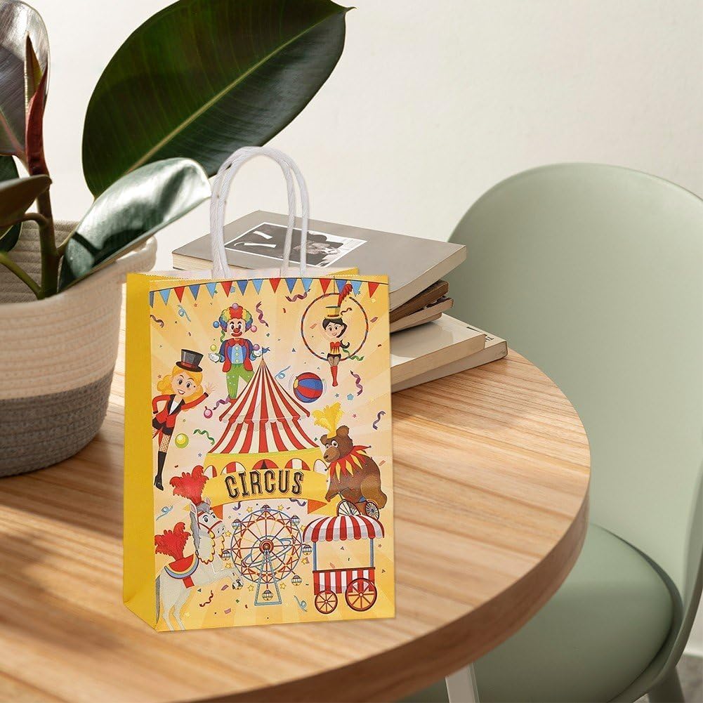 【Perfetto per ogni occasione】 Ideale per compleanni, baby shower, regali di festa, sacchetti regalo per feste o confezioni per negozi. Ideale anche per decorazioni fai da te o per il branding di piccole imprese. 【Divertente design circense】: presenta una stampa circense colorata e stravagante che aggiunge un tocco giocoso a ogni occasione. Perfetto per feste per bambini, eventi di carnevale o celebrazioni a tema circense. 【Carta Kraft ecologica】: realizzata con carta kraft riciclabile di alta qualità, robusta, biodegradabile e rispettosa dell'ambiente. Un'alternativa sostenibile ai sacchetti regalo in plastica. 【Maniglie Resistenti e Base Rinforzata】: Dotato di robuste maniglie in carta attorcigliata e una base rinforzata per riporre in sicurezza piccoli regali, bomboniere, snack o souvenir. 【Look vintage e creativo】Il design retrò del circo combina carta kraft marrone naturale per fornire un'estetica elegante e accattivante, ideale per dare un tocco creativo.