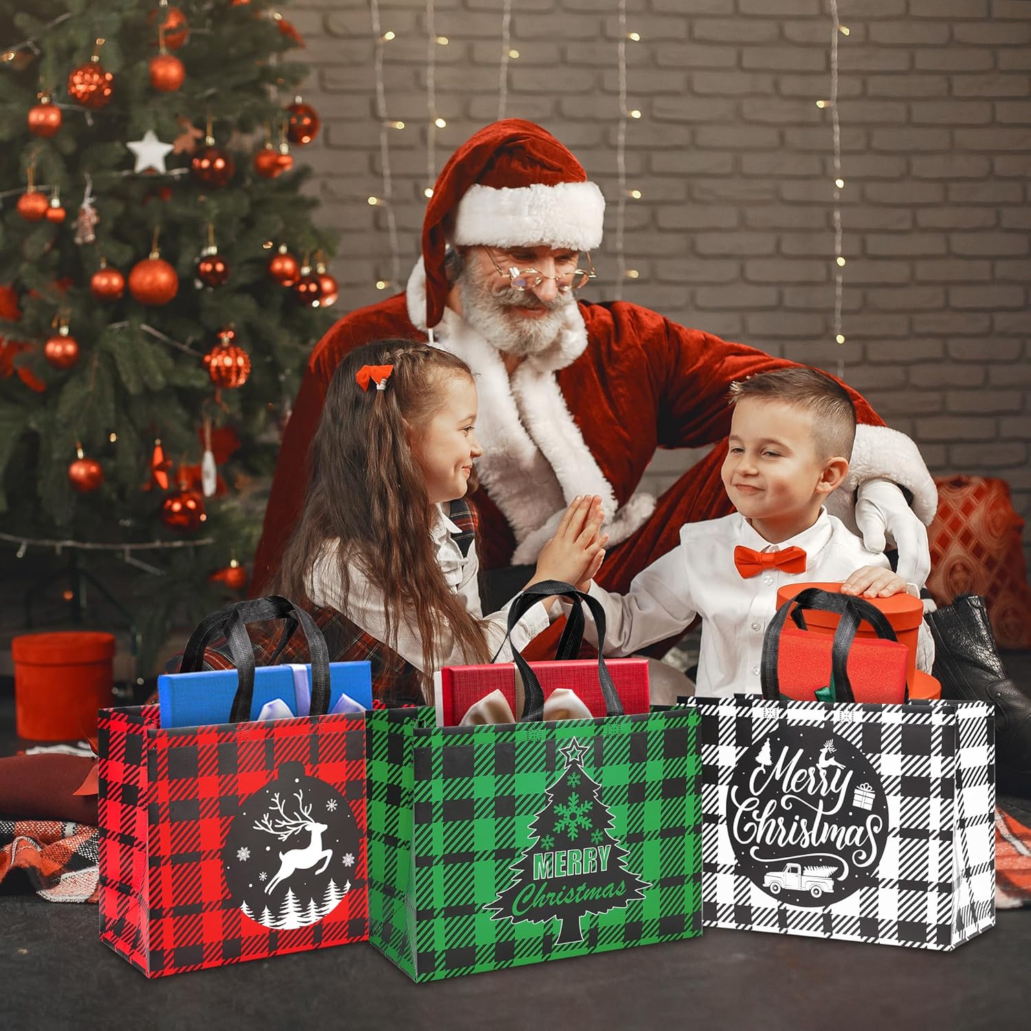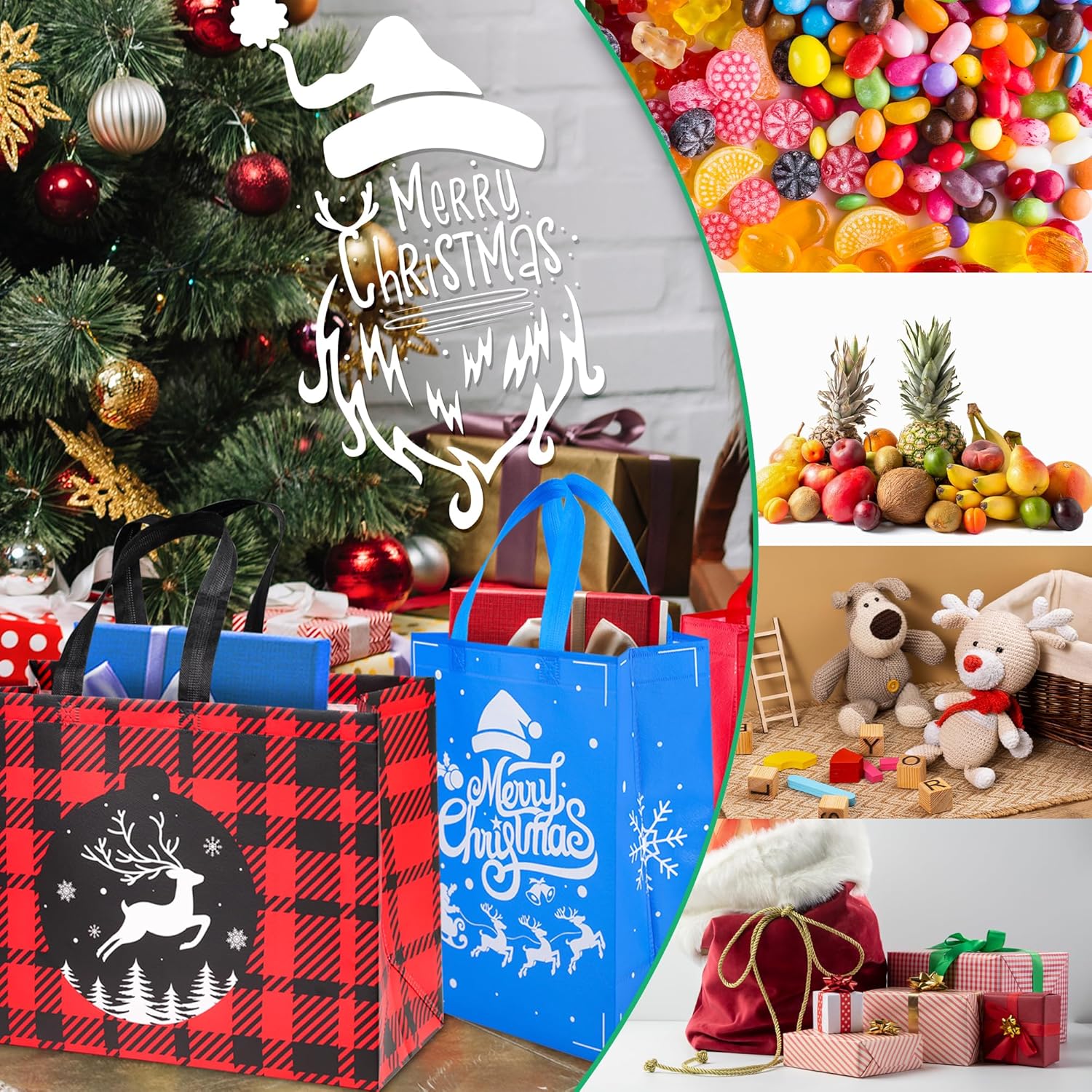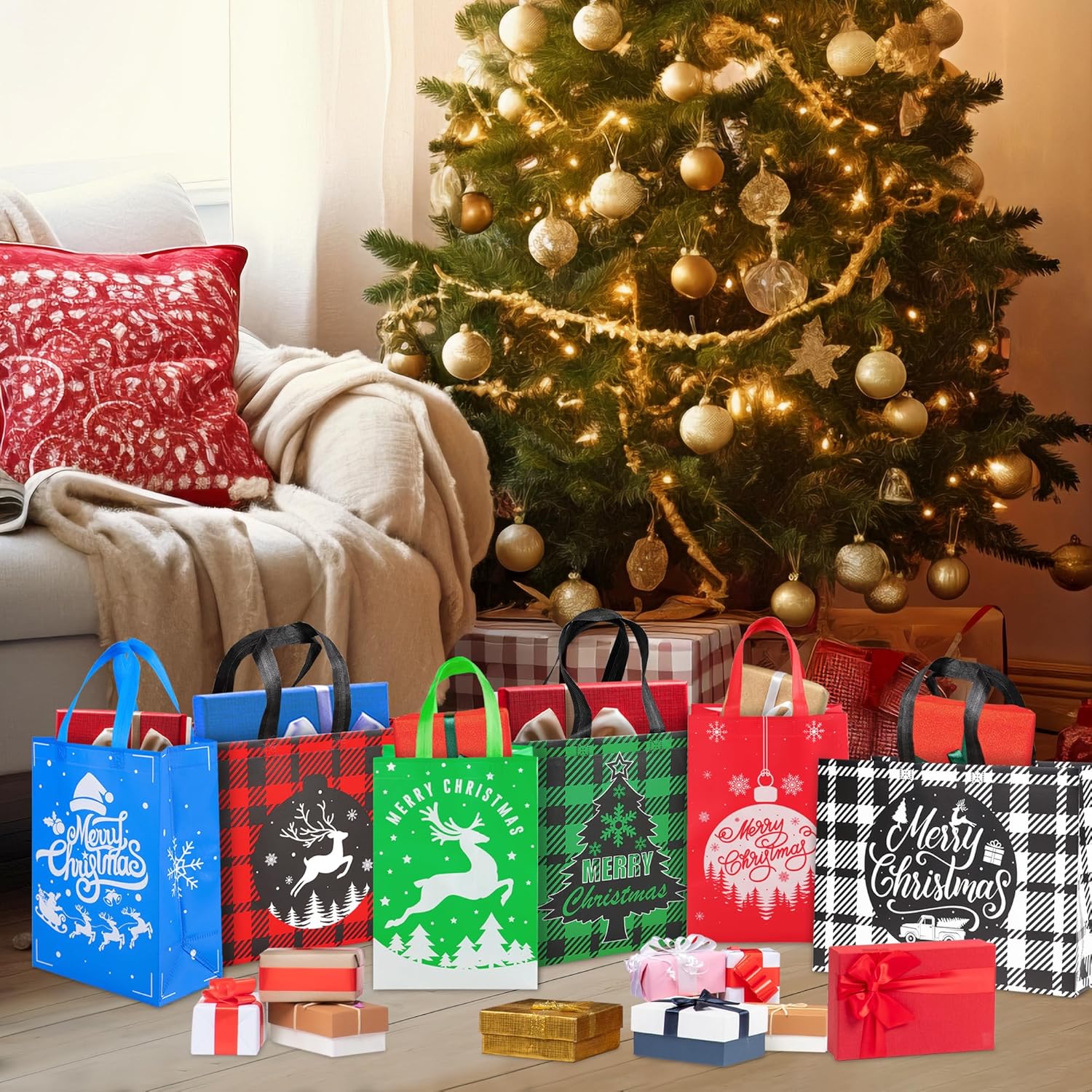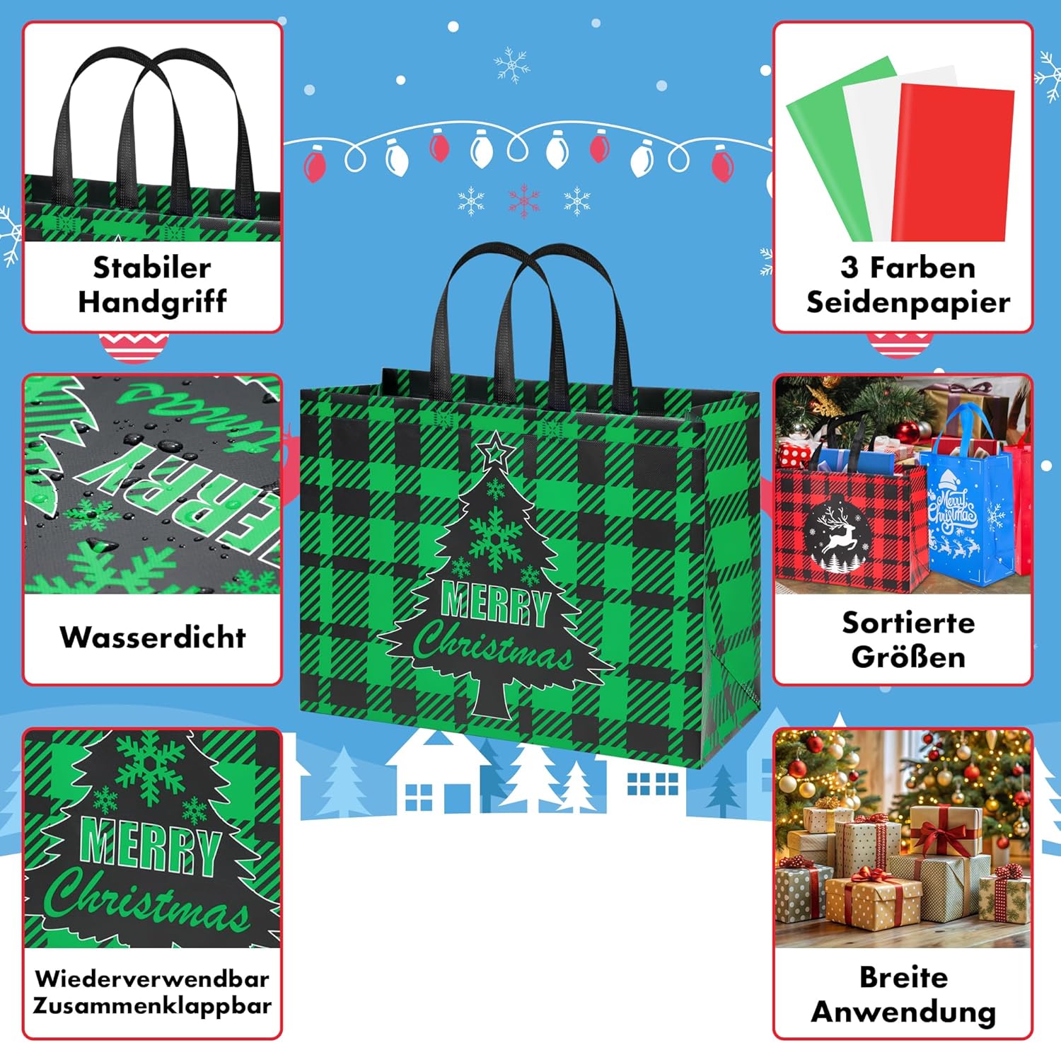 Contenuto della confezione: 12 confezioni di sacchetti natalizi riutilizzabili di diverse dimensioni: 6 medie (35 x 24,4 x 14,2 cm) e 6 extra grandi (31,75 x 41,4 x 18,3 cm) con carta velina. Abbastanza per Natale, ideale per confezionare piccoli regali di Natale e conservare molti regali o altri oggetti a Natale. Materiale di alta qualità: questi sacchetti natalizi per regali sono realizzati in tessuto non tessuto di alta qualità, questi sacchetti regalo natalizi sono impermeabili, robusti, pieghevoli e riutilizzabili. Ogni borsa natalizia viene fornita con carta velina per un tocco extra di eleganza e comfort. Design raffinato: le nostre borse natalizie utilizzano elementi come renne, cappelli di Babbo Natale, lettere e così via, che sono inseparabili dal Natale, e utilizzano colori vivaci per creare una migliore atmosfera natalizia per organizzare feste di Natale. Occasione applicabile: le nostre borse natalizie sono adatte a varie occasioni. Sono ideali per riunioni di famiglia, regali di Natale, decorazioni natalizie e molto altro ancora. Questi sacchetti regalo di Natale sono versatili e adatti a tutte le età, ideali per bambini e adulti. Servizio eccellente: se ci sono problemi con i sacchetti regalo di Natale, fatecelo sapere in qualsiasi momento. Il nostro servizio clienti è sempre pronto a rispondere alle vostre domande o dubbi e fare del nostro meglio per fornirvi la soluzione ottimale