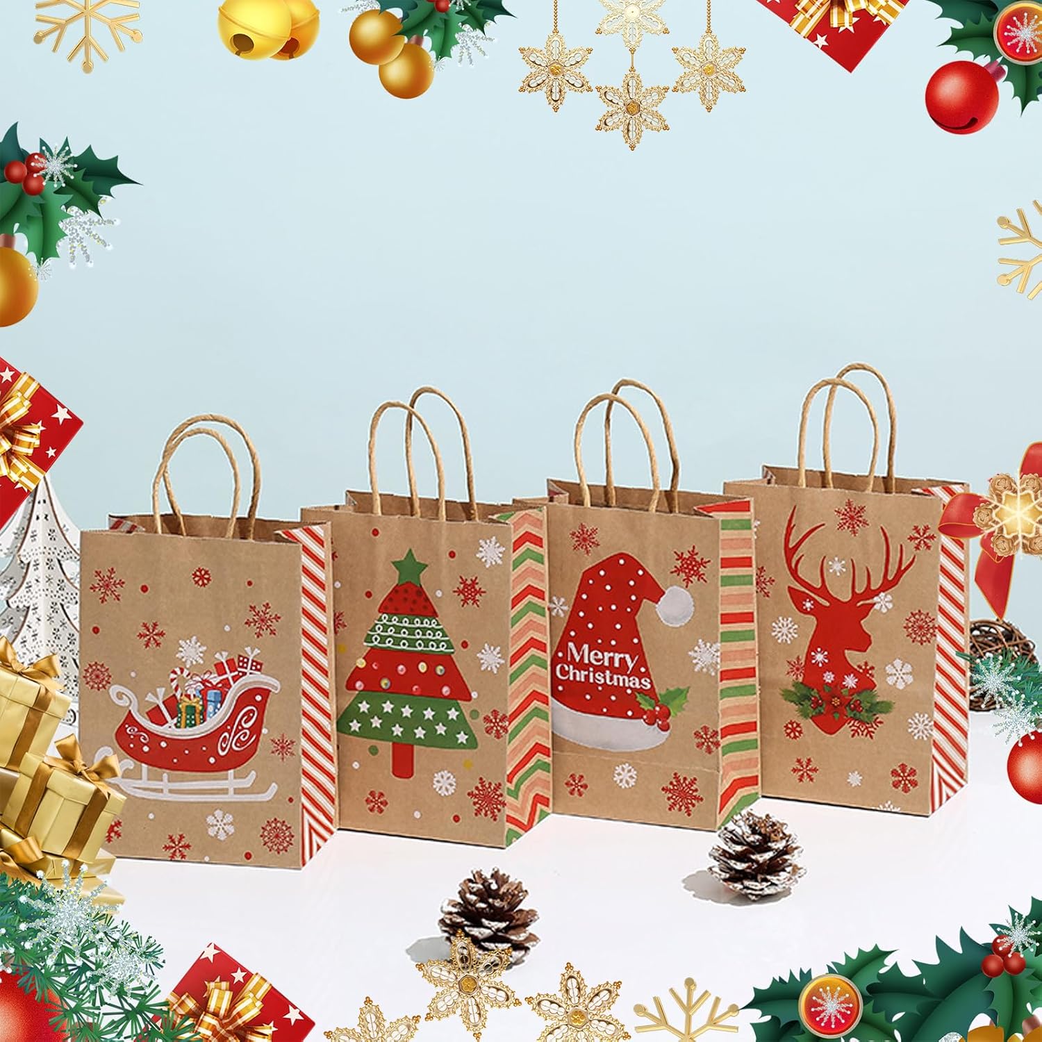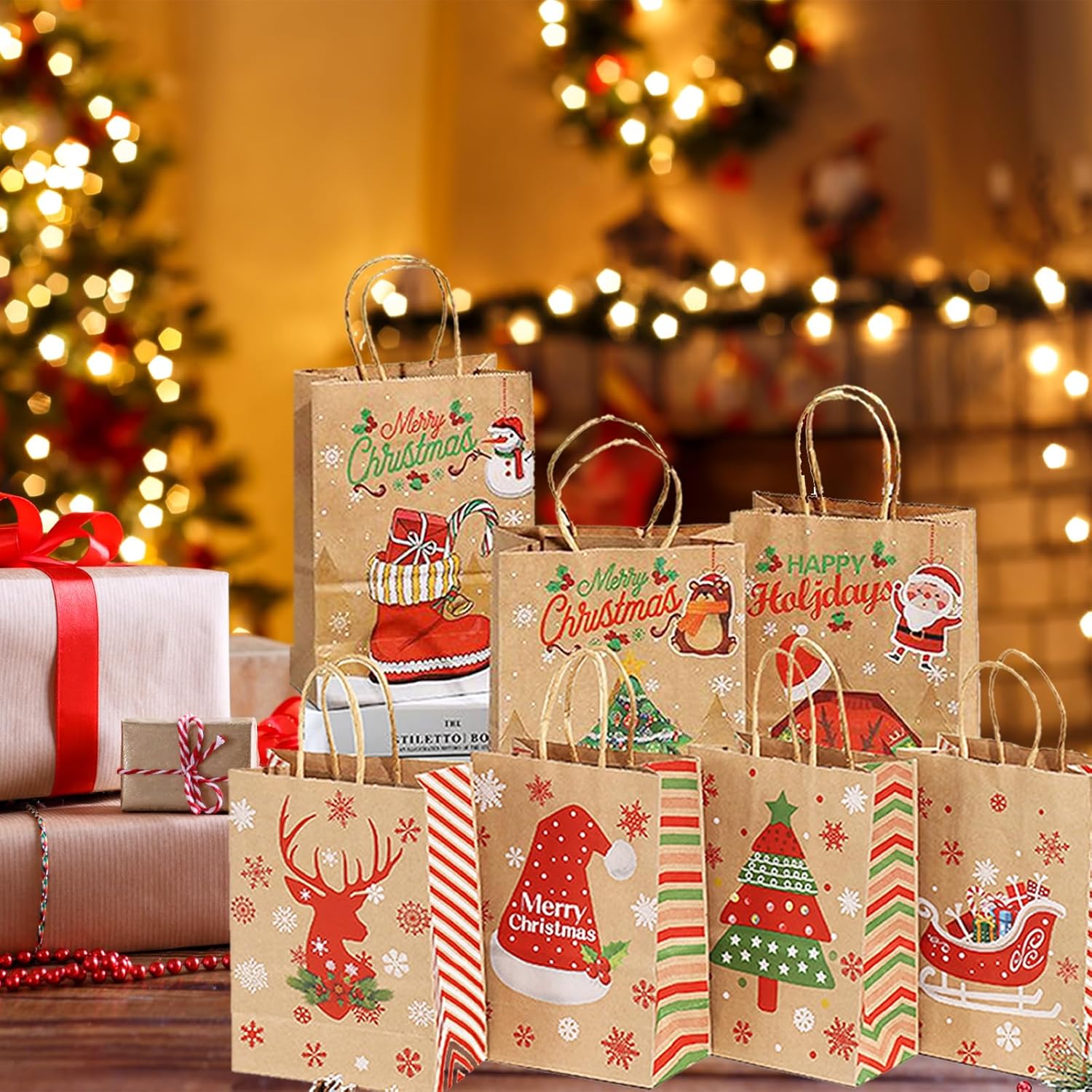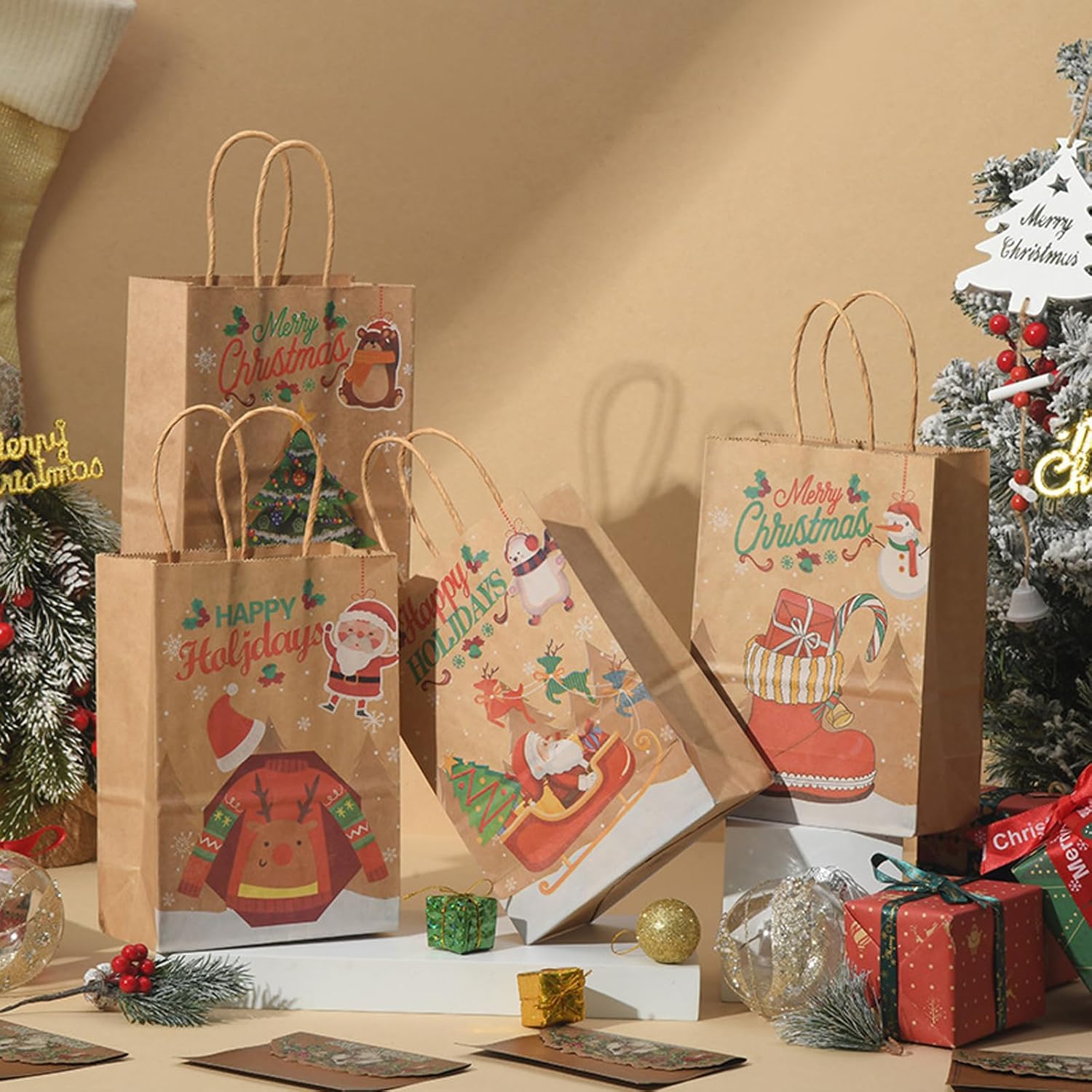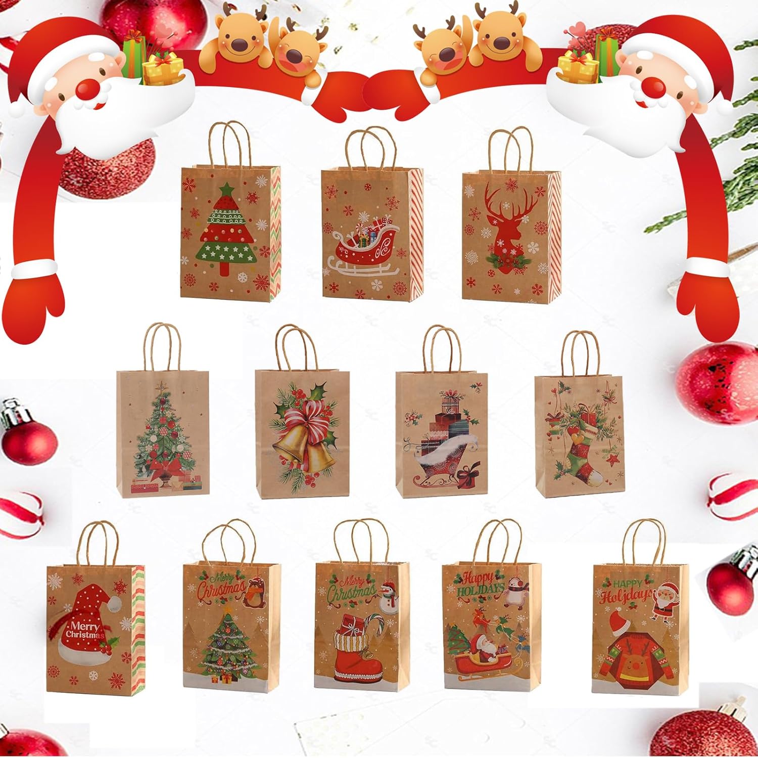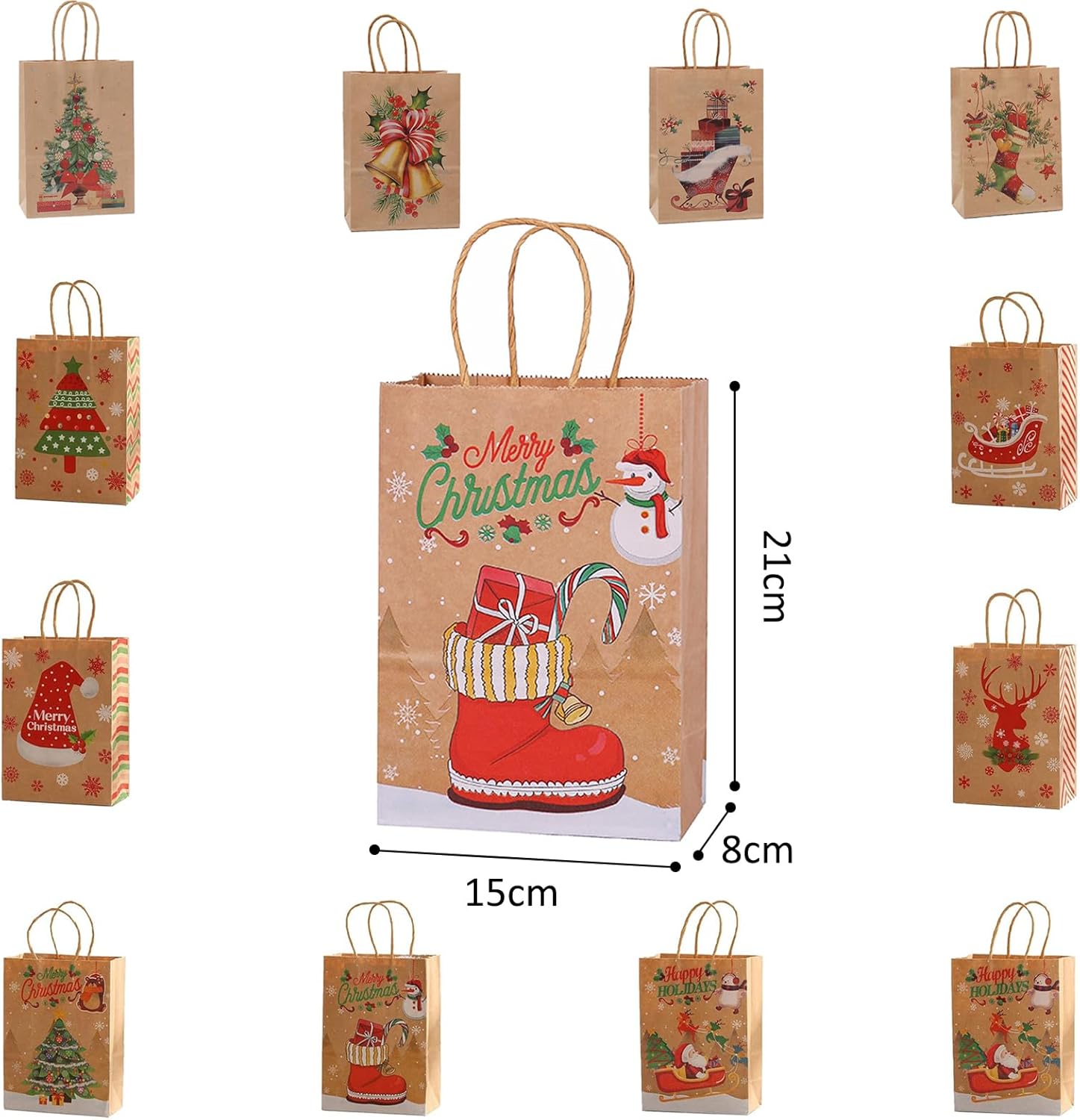 【Sacchetto di carta natalizia】 Questo sacchetto di carta kraft ha 12 tasche con manici, stampati con 12 stili diversi, con elementi classici natalizi, fiocchi di neve, omini di pan di zenzero, alberi di Natale e Babbo Natale, ecc. In colori vivaci e pieni. Ogni sacchetto regalo ha un motivo natalizio unico che rende il tuo regalo più speciale e interessante.,Materiale di qualità: i sacchetti regalo per le feste di Natale sono realizzati in carta kraft bianca di alta qualità e i manici sono incollati con colla di alta qualità. Questi sacchetti regalo di Natale sono durevoli, affidabili e riutilizzabili per fare regali, misurano 15 x 8 x 21 cm. 【Per un'atmosfera festosa】 Il design natalizio è perfetto per le celebrazioni di Capodanno e le decorazioni per le feste di Natale. I sacchetti regalo di Natale possono migliorare il tuo spirito natalizio,Vari modelli attraenti: i sacchetti di Natale sono colorati e ricchi di motivi natalizi, come: Babbo Natale, alberi di Natale, regali di Natale, sfere di cristallo, slitte, alci, ecc., perfetti come contenitori regalo o caramelle. I bellissimi motivi sui sacchetti natalizi di carta sono tutti elementi natalizi che creano un'atmosfera festosa. 【Ampia applicazione】 I sacchetti di carta natalizi sono adatti a tutti i tipi di feste natalizie e riunioni festive, che aiutano a creare un'atmosfera natalizia. Con questi sacchetti regalo di Natale potrai portare ancora più sorprese ai tuoi bambini e ai tuoi amici. Sia come regalo che come decorazione, i sacchetti natalizi di carta sono l'ideale