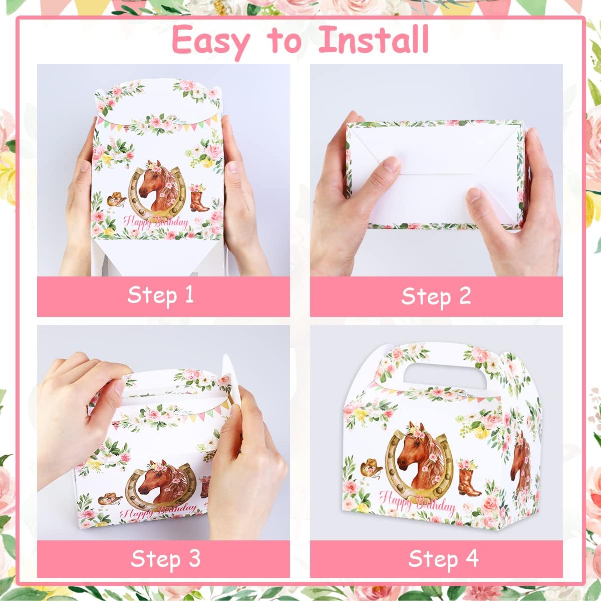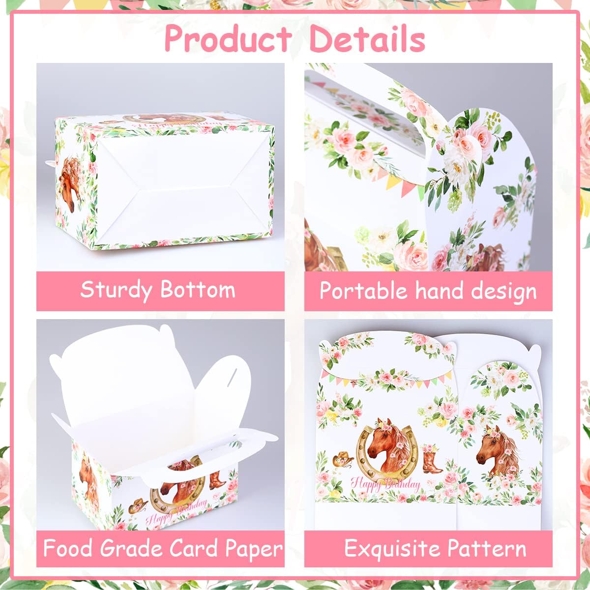 【Riceverai】Le decorazioni per la festa di compleanno di cavalli con doppia stampa includono 12 sacchetti di carta di cavalli rosa. L'altezza delle borse da festa è di 22,1 cm e larga 16 cm. 【Scatole regalo per feste a cavallo】: i sacchetti di caramelle di compleanno rosa cowgirl fai-da-te con doppio motivo di stampa sono molto belli. I modelli unici e la quantità sufficiente renderanno sicuramente la tua festa attraente e regaleranno alla tua dolce metà una meravigliosa festa di compleanno. 【Regalo speciale】 La nostra borsa regalo per ragazza occidentale ha una maniglia robusta per un facile trasporto. Il design unico renderà indimenticabili la tua famiglia e i tuoi amici. 【Ampia applicazione】: I nostri sacchetti regalo di compleanno per ragazze sono perfetti per feste di compleanno a tema cavallo, nonché perfetti per compleanni a tema cowgirl, feste di compleanno di ragazze selvagge occidentali, ecc.