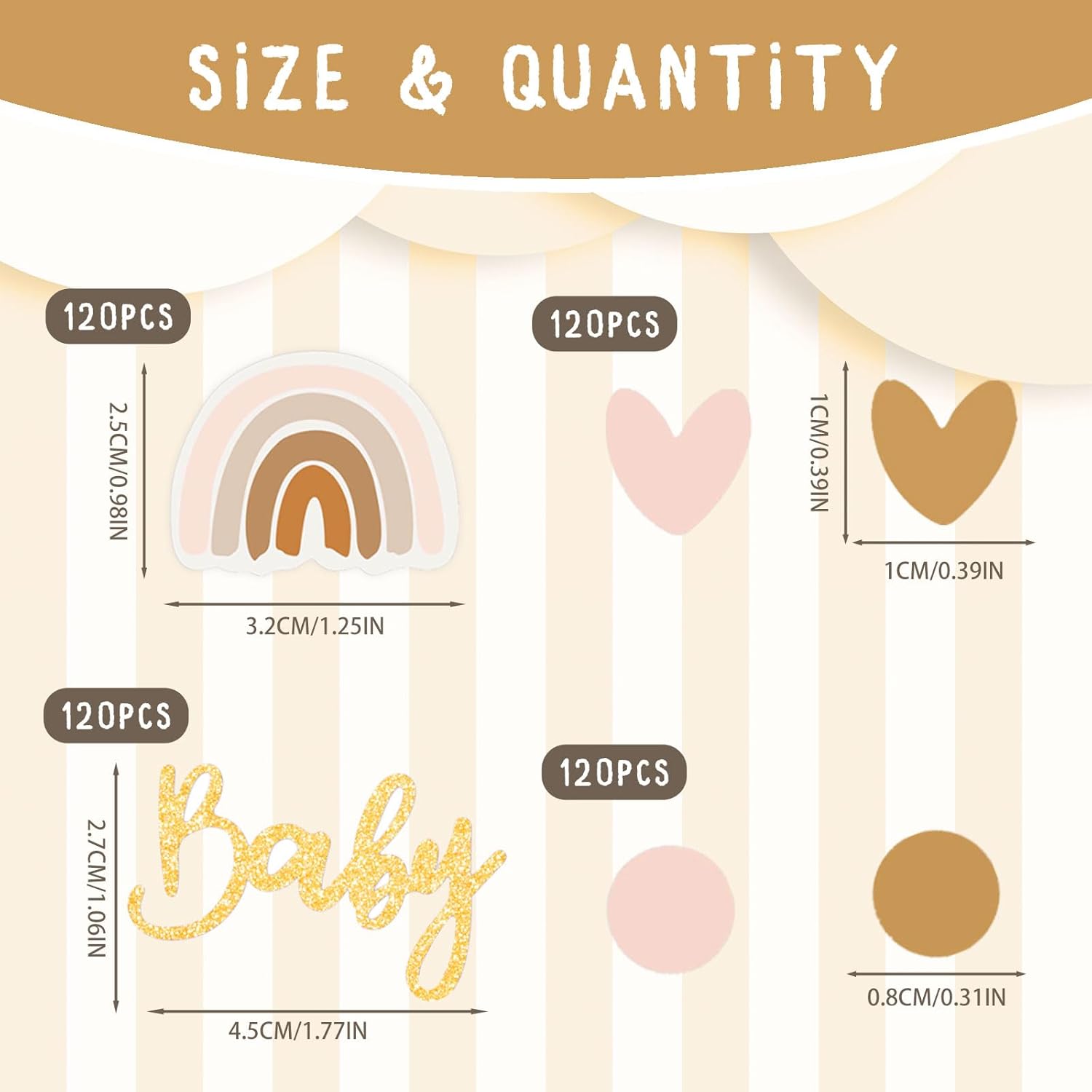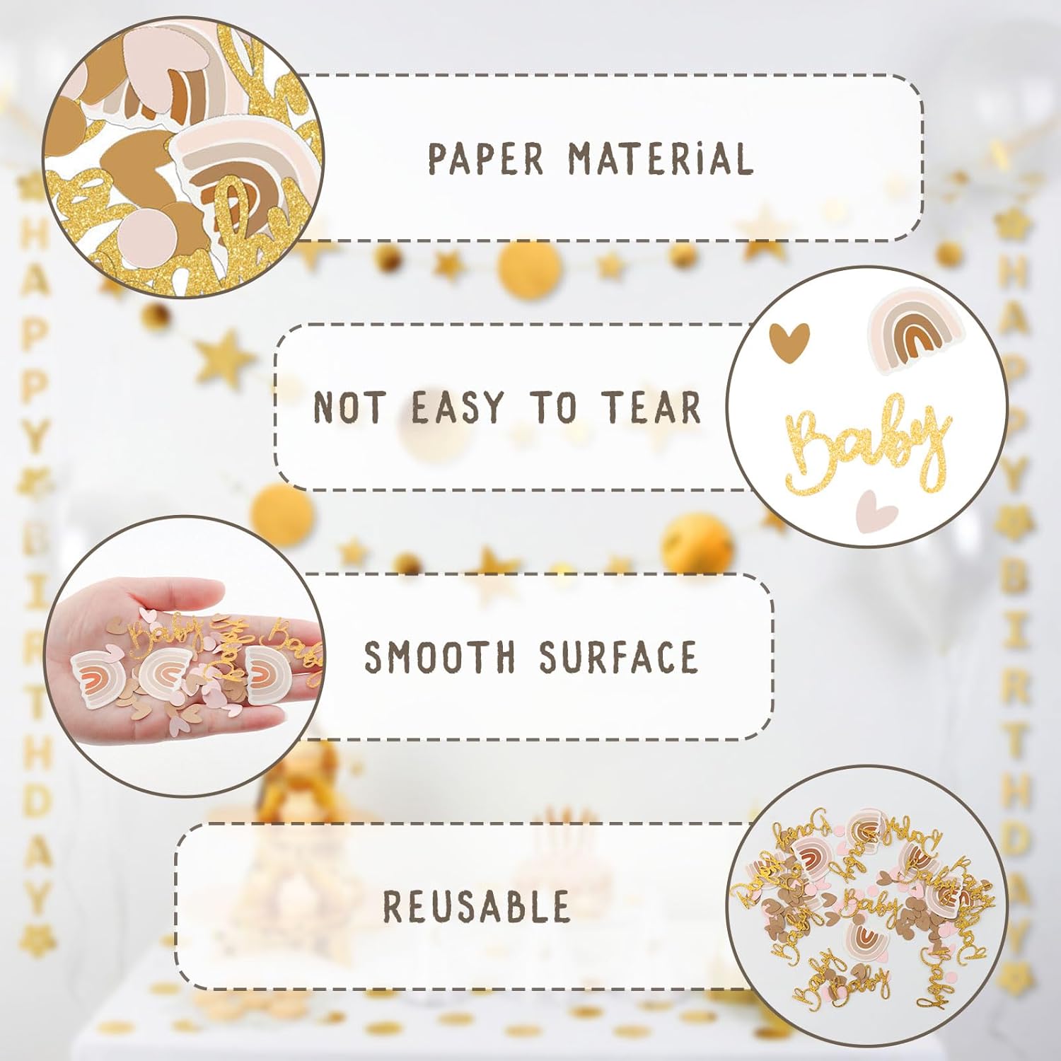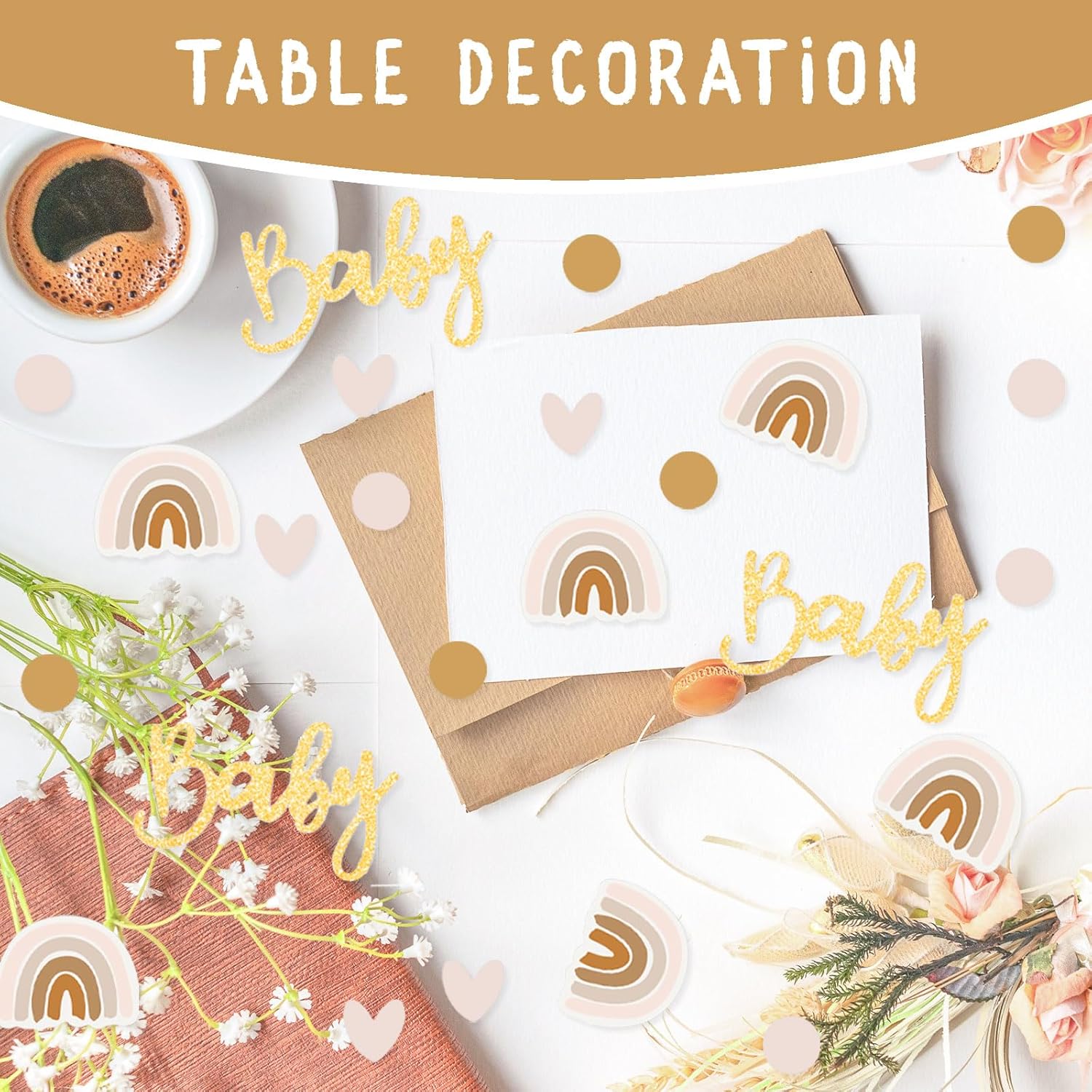 【Coriandoli】 I coriandoli per decorazioni per feste per bambini contengono 2 confezioni, ciascuna con 60 pezzi, per un totale di 120 pezzi. Il design dei coriandoli è vario e comprende forme arcobaleno, forme di cuore, coriandoli rotondi e scritte scintillanti "baby". Il design generale è carino e dona alla festa un'atmosfera calda e allegra. 【Materiali cartacei】 I coriandoli per decorazioni per feste rivelano il genere del bambino sono realizzati in materiale cartaceo, leggero, morbido ed elastico. La superficie dei coriandoli è liscia, i colori sono vividi e duraturi, non sbiadiscono facilmente. Grazie alla loro leggerezza, i coriandoli possono fluttuare nell'aria, creando un effetto visivo da sogno che si abbina perfettamente al tema del baby shower. 【Crea un'atmosfera festosa】 I coriandoli decorativi che rivelano il genere creano immediatamente un'atmosfera vacanziera vivace e felice. I coriandoli colorati, tra cui arcobaleni, cuori, cerchi e la scintillante scritta "Baby", donano alla sala delle feste un'atmosfera vivace e festosa, permettendo a tutti gli ospiti di sentire lo spirito gioioso. 【Design raffinato】 Il design della decorazione del tavolo dei coriandoli del baby shower è dettagliato e creativo, con varie forme e motivi espressivi come arcobaleni, cuori, cerchi e la scintillante scritta "Baby". Ogni combinazione di colori è vibrante e armoniosa, piena di gioia infantile ma allo stesso tempo elegante, che si abbina perfettamente alla calda atmosfera di un baby shower. Versatile: i coriandoli per baby shower e bambina non solo possono essere utilizzati per decorare la festa, ma aggiungono anche più vivacità e gioia a varie celebrazioni. Sono adatti per battesimi, feste di rivelazione del genere, feste di compleanno e altri eventi per decorare la stanza.