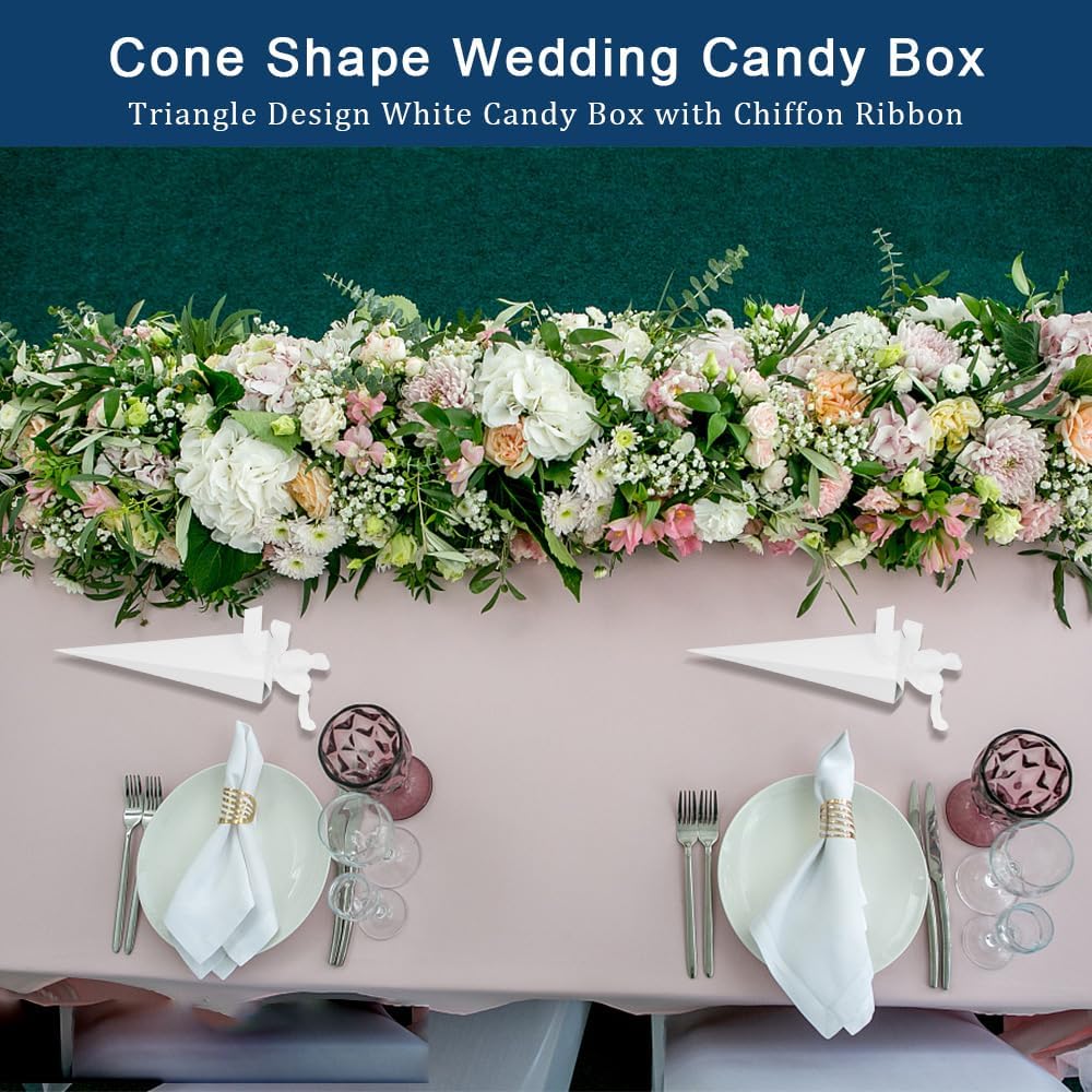 【120 Scatole Bianche a Forma di Cuore】120 Scatole bianche a forma di cono a forma di cuore con nastro di chiffon bianco. La fascia bianca sigilla meglio le scatole. Una volta assemblate, le scatole hanno la forma di coni quadrati a spillo e sembrano coni gelato, le scatole sono piene di divertimento e saranno molto attraenti per ospiti e bambini, quindi potrete utilizzarle per qualsiasi piccolo regalo. 【Ideale per piccoli regali】 Realizzata in cartone bianco, la scatola è attraente, facile da montare e ha una buona tenuta. Ideale per riso, confetti, caramelle, cioccolatini, gioielli, piccoli regali, ecc. Una volta riempita, la scatola sarà una grande sorpresa per la persona amata, la famiglia, gli amici e i colleghi. 【Perfetto per tutti i tipi di feste】 La confezione regalo è bellissima e il colore bianco solido è particolarmente adatto per feste di matrimonio romantiche. Può essere utilizzata anche come confezione regalo segnaposto per feste di compleanno, buffet, baby shower, banchetti, lauree e Natale: un connubio di eleganza e qualità perfetto per questi scenari. 【Migliore tenuta per il riempimento】 Il montaggio della scatola richiede solo un minuto e, una volta assemblato, ogni sacchetto contiene 50-60 g di riso e 10-11 marzapane (17x4x4 cm) 20,5x4x4 cm. Una volta riempita, la scatola si chiude con un anello di pellicola trasparente e si trasforma in un regalo elegante e romantico. 【Robusto e Riutilizzabile】La scatola può essere assemblata e riutilizzata più volte. Il nostro cartone è robusto e spesso in modo da poter contenere piccoli regali senza scivolare, rendendolo una decorazione e un regalo pratico e romantico per la tua festa.
