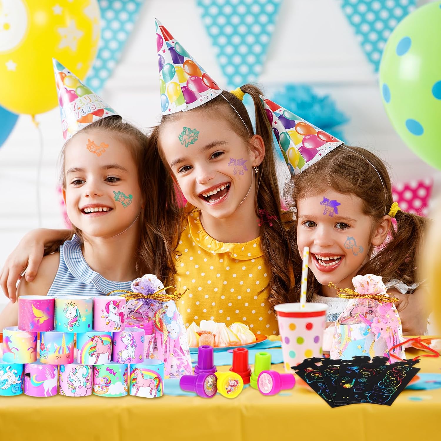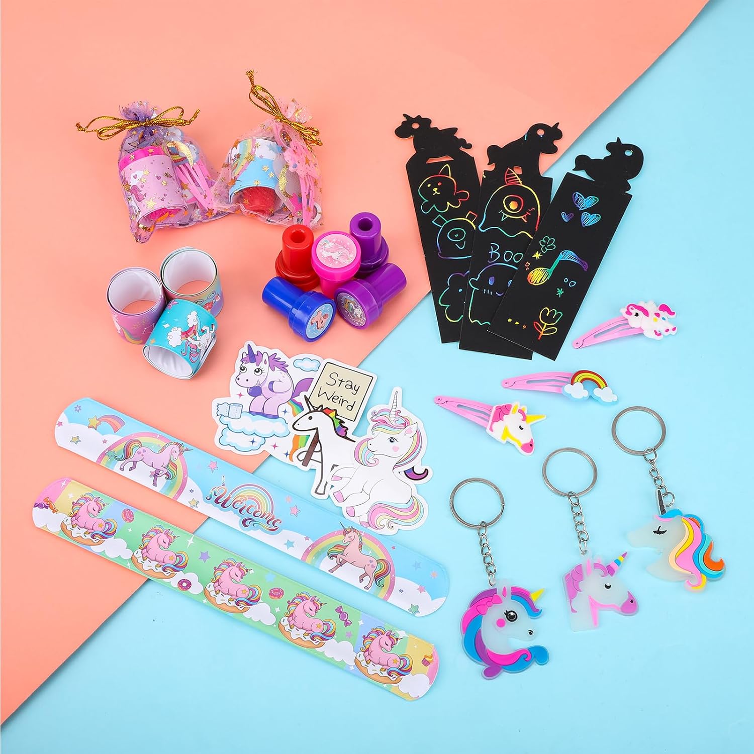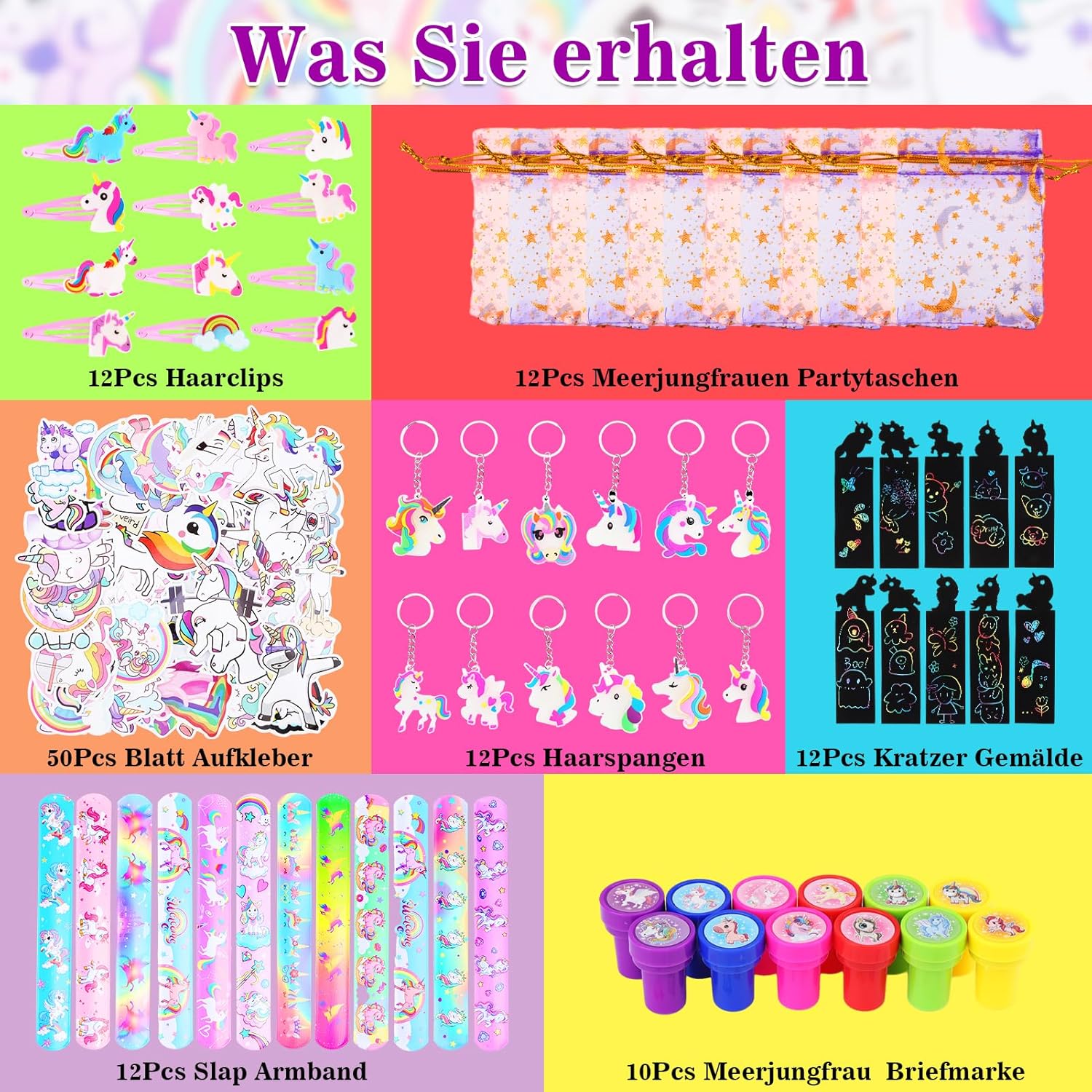 Sacchetti regalo con unicorno per il compleanno dei bambini: un totale di 122 pezzi. Sacchetti regalo con unicorno per feste di compleanno con unicorno per ragazzi e ragazze. La decorazione di compleanno per ragazze contiene graffi, anelli elastici, fermagli per capelli, portachiavi, francobolli e sacchetti per feste, è molto adatta per regali per feste, snack, ecc. e può soddisfare le esigenze di diversi bambini. I sacchetti per bomboniere per unicorno, creativi e unici, sono realizzati con materiali come colla morbida in PVC, sicuri per i bambini, tutti. Le parti del set hanno lo stesso design dell'unicorno, sono vivaci, colorate e carine. Decorazione unicorno per il compleanno dei bambini: l'unicorno è sempre popolare tra i bambini. Un portachiavi aggiunge colore allo zaino e alle chiavi di un bambino. Braccialetti con unicorno e fermagli per capelli sono ottimi accessori che possono essere utilizzati come bellissime borse da festa, ottimi ricordi per gli amici dei bambini. Facile da usare: gli adesivi per tatuaggi per bambini con unicorno sono facili da usare, basta un po' d'acqua per trasferire gli adesivi sulla pelle. I tatuaggi temporanei di unicorno sono facili da usare e rimuovere, sicuri per i bambini, possono essere rimossi con alcool o acqua calda Borse da festa di unicorno festa per bambini - Il set da festa di unicorno con adorabili accessori per feste di unicorno è un successo alla festa di compleanno per i tuoi piccoli, le decorazioni delle borse da festa di unicorno sono appositamente progettate per i sacchetti regalo di compleanno dei bambini, premi per scrigni del tesoro, premi di classe, regali per feste di unicorno, accessori per feste di compleanno, feste di Natale