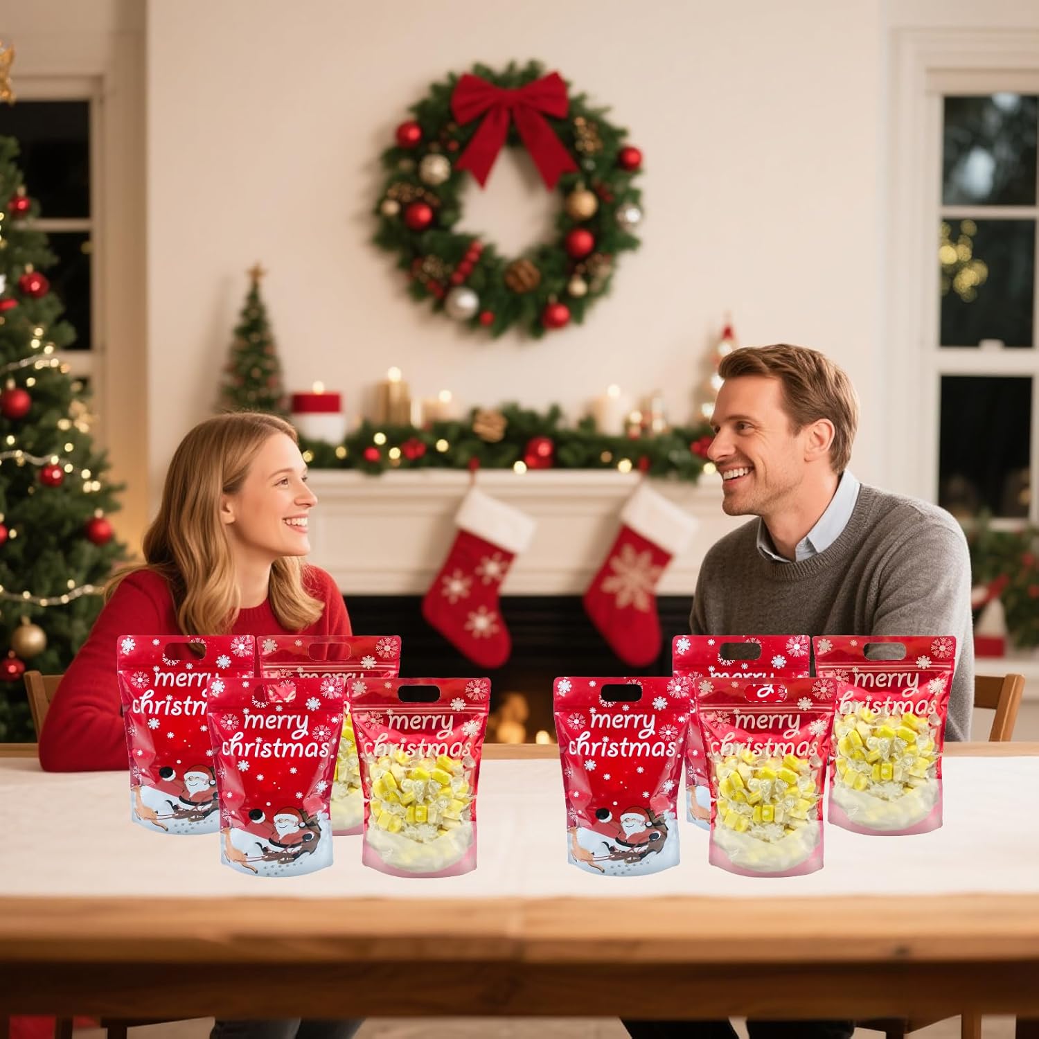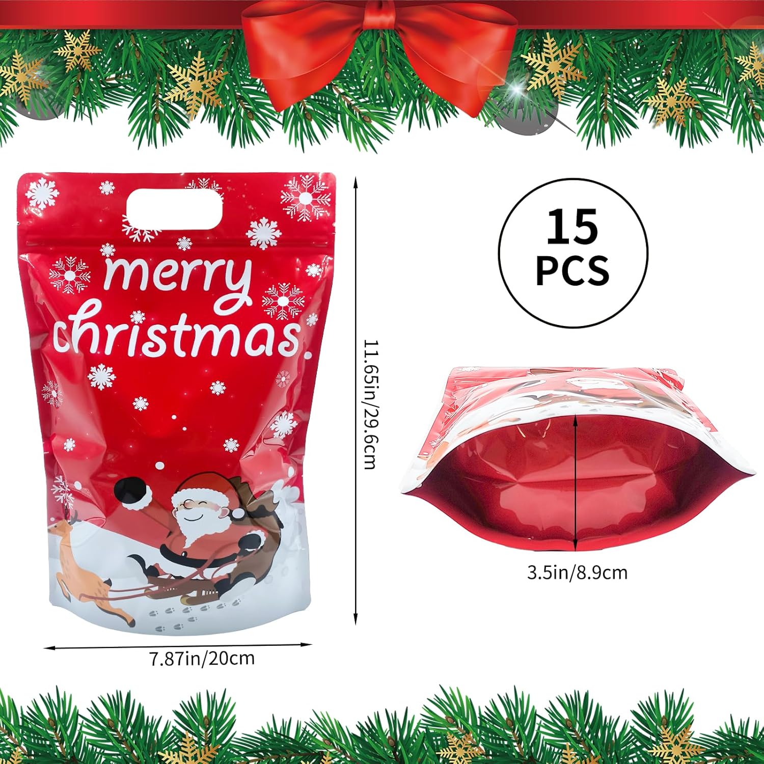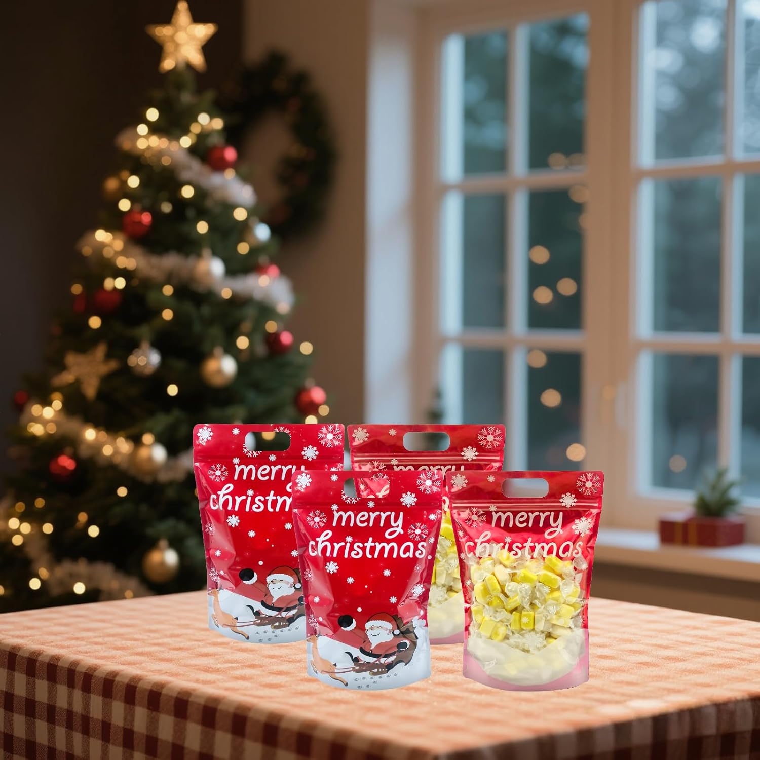 Le dimensioni complessive di questi sacchetti natalizi con chiusura lampo sono di circa 29,6 x 20 x 6 cm. Offrono una grande capacità e sono facili da trasportare. Questi sacchetti regalo in plastica sono adatti per riporre diversi piccoli regali di Natale e possono essere utilizzati anche come sacchetti natalizi per dolci, biscotti, giocattoli e molto altro ancora. Realizzate in plastica di alta qualità, queste borse sono ben realizzate, atossiche, inodore e sicure da usare. Sono durevoli, resistenti agli strappi e riutilizzabili Colore: rosso Il sacchetto di caramelle natalizio è decorato con motivi di pupazzi di neve, Babbo Natale, renne, slitta, ecc. E la parte superiore del sacchetto dice "Buon Natale". Questi sacchetti regalo di Natale sono meravigliose decorazioni per feste di Natale, riunioni di famiglia e altre occasioni festive. Sono perfetti per la vetrina, la tavola di Natale o sotto l'albero di Natale