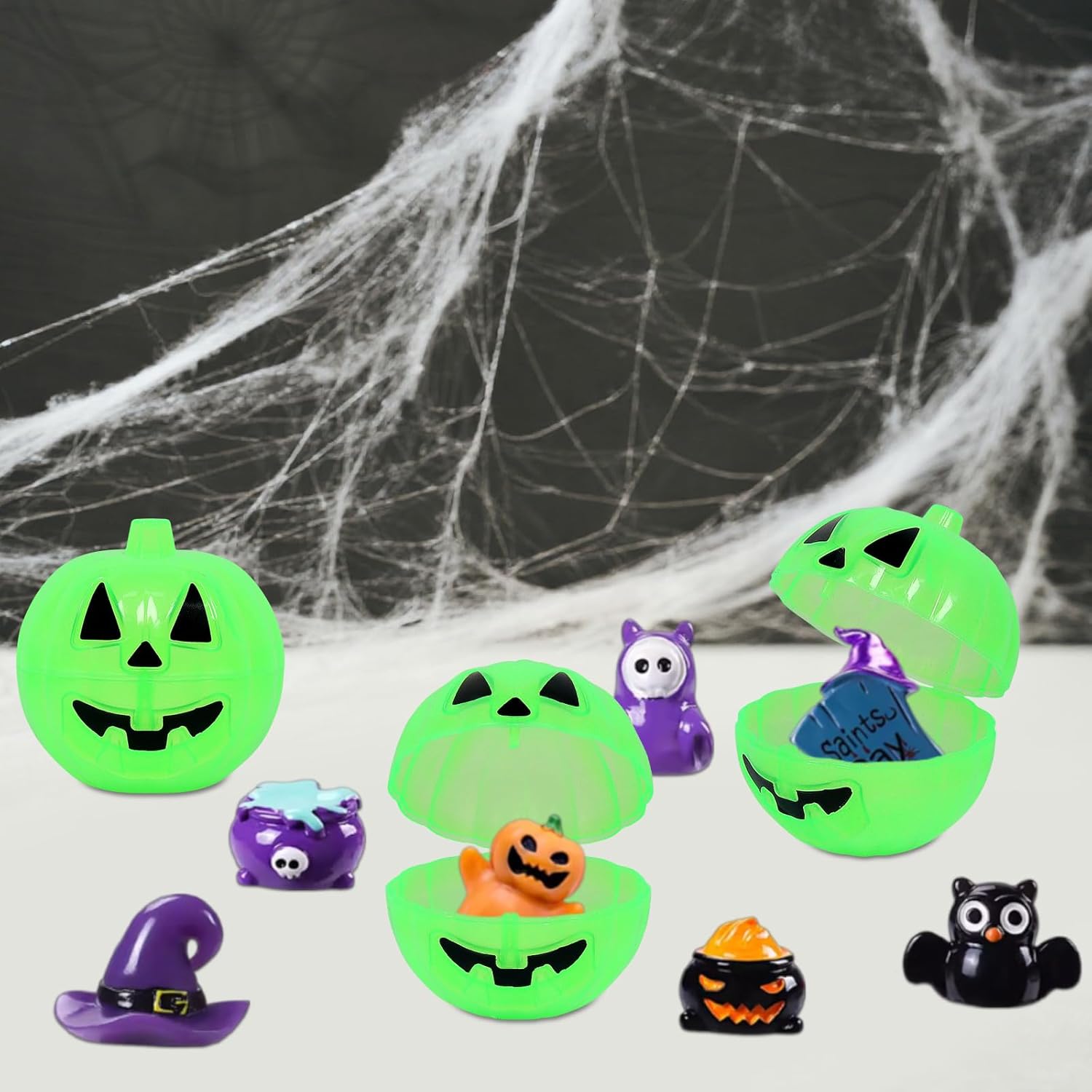 Scatola cieca contenitore per zucca di Halloween: questa scatola cieca per contenitore per zucca di Halloween contiene 18 scatole cieche in miniatura, ciascuna contenente un diverso personaggio a tema Halloween, come lapidi, fantasmi, candele e molto altro ancora. Materiali di alta qualità: realizzata in resina di alta qualità, questa scatola cieca per contenitore per zucca di Halloween è caratterizzata dalla sua durata e solidità del colore. La sua superficie liscia, le dimensioni compatte e la struttura leggera lo rendono ideale per far giocare i bambini. Design unico: questa scatola cieca contenitore a forma di zucca di Halloween che si illumina al buio è costituita da un guscio di zucca in plastica che emette una luce brillante di notte, combinato con il suo inquietante volto sorridente, crea un effetto davvero inquietante. Il design della scatola cieca significa che non sai cosa c'è dentro finché non la apri, il che invoglia i bambini a spacchettare la sorpresa. Luoghi adatti: le borse da festa in miniatura in questo set sono squisitamente realizzate e di dimensioni compatte, il che le rende ideali da posizionare su una scrivania, davanzale o corridoio per migliorare l'atmosfera di Halloween. Regalo ideale: questa scatola cieca contenitore zucca di Halloween con ornamenti colpisce per il suo design unico, materiali di alta qualità e alta praticità, che la rendono un regalo di Halloween ideale per i bambini