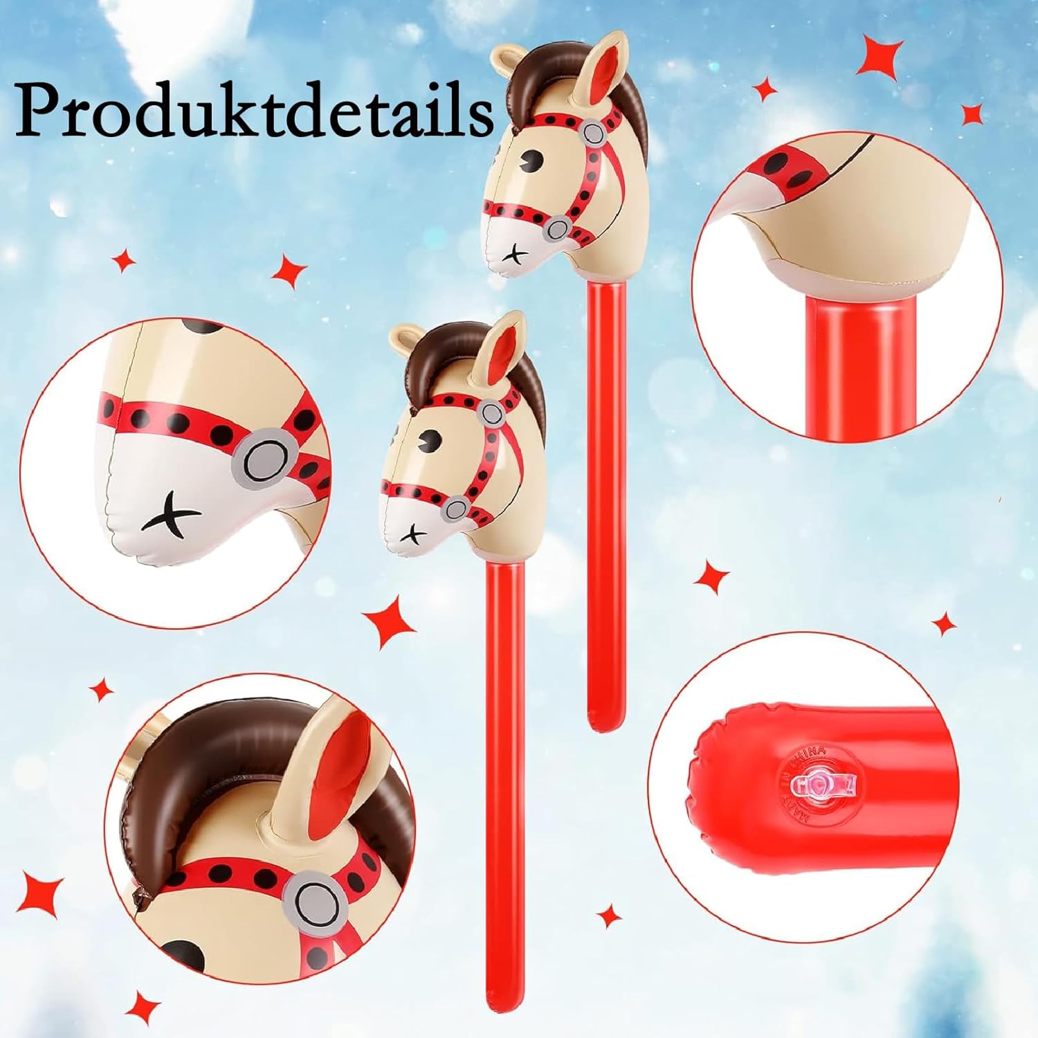 Contenuto della confezione: riceverai 2 pezzi di cavalli gonfiabili rossi, la dimensione dopo l'inflazione è 95 * 21 cm, due simpatici cavalli pronti a portarti energia e gioia infinite. Alta qualità: questa decorazione per cavallo di compleanno è realizzata in materiale di alta qualità. Il motivo è luminoso e vibrante, non facile da sbiadire o strappare. Durevole e riutilizzabile, può essere riempito con aria o elio. I palloncini possono essere sgonfiati lentamente per riporli più facilmente dopo il prossimo evento. Oggetti di scena interessanti: questo palloncino a cavallo è costituito da una graziosa testa di cavallo e un bastone realistico. Puoi cavalcarlo come un vero cavallo, come un vero cavallo di una fiaba. L'aspetto rosso è più entusiasta e disinibito, permettendo ai bambini di dare libero sfogo alla loro natura e godersi gioia e allegria. Facile da usare: il bastone a testa di cavallo è progettato semplicemente. Prima dell'uso, tutto ciò che devi fare è aprire la valvola di gonfiaggio e riempire d'aria il giocattolo gonfiabile del cavallo utilizzando la pompa ad aria. Può essere gonfiato e modellato rapidamente, risparmiando tempo e fatica. Ampiamente usato: il cavallo gonfiabile per decorazioni per feste è ideale per varie occasioni, come feste a tema cavallo, feste con pony, carnevale, Natale, feste di compleanno.