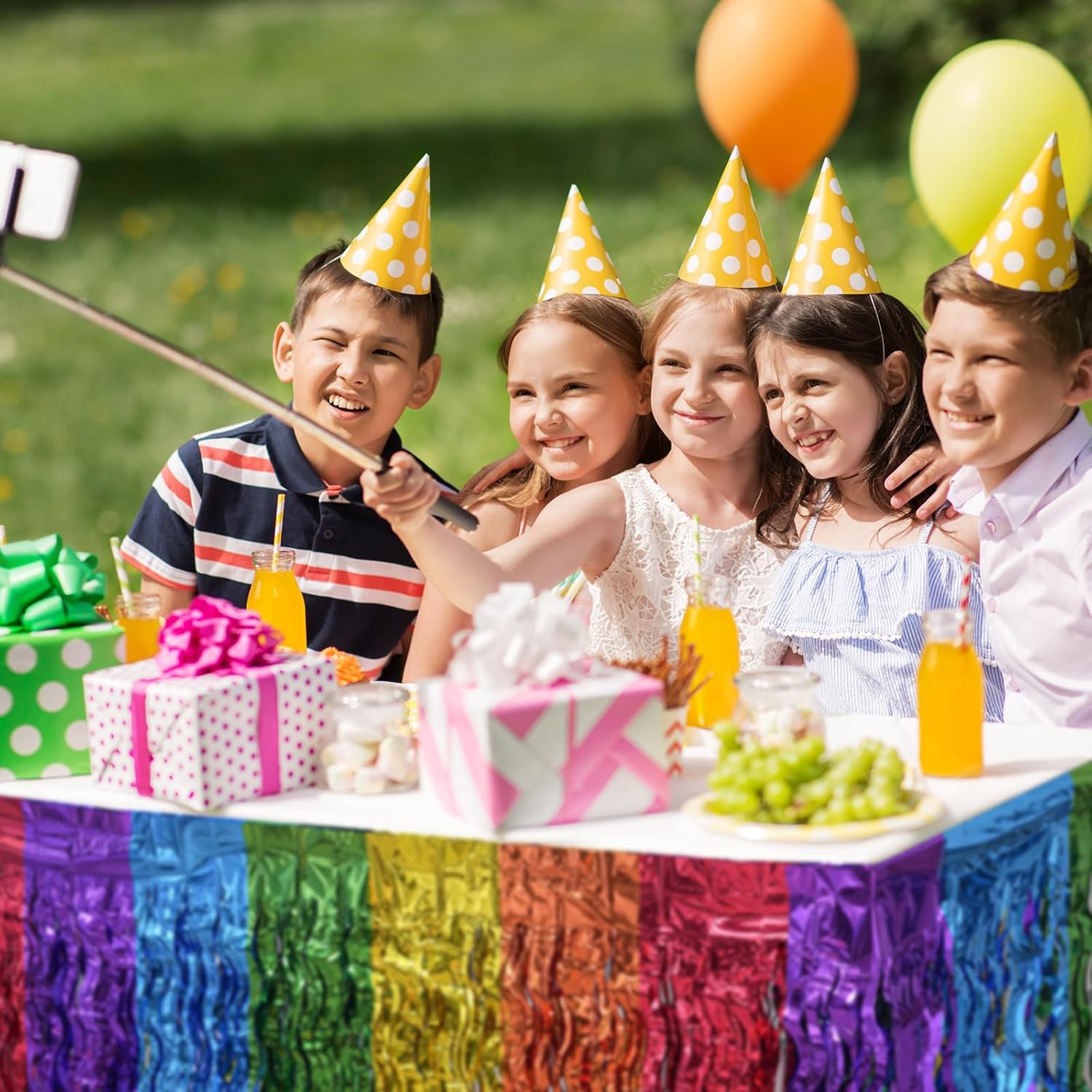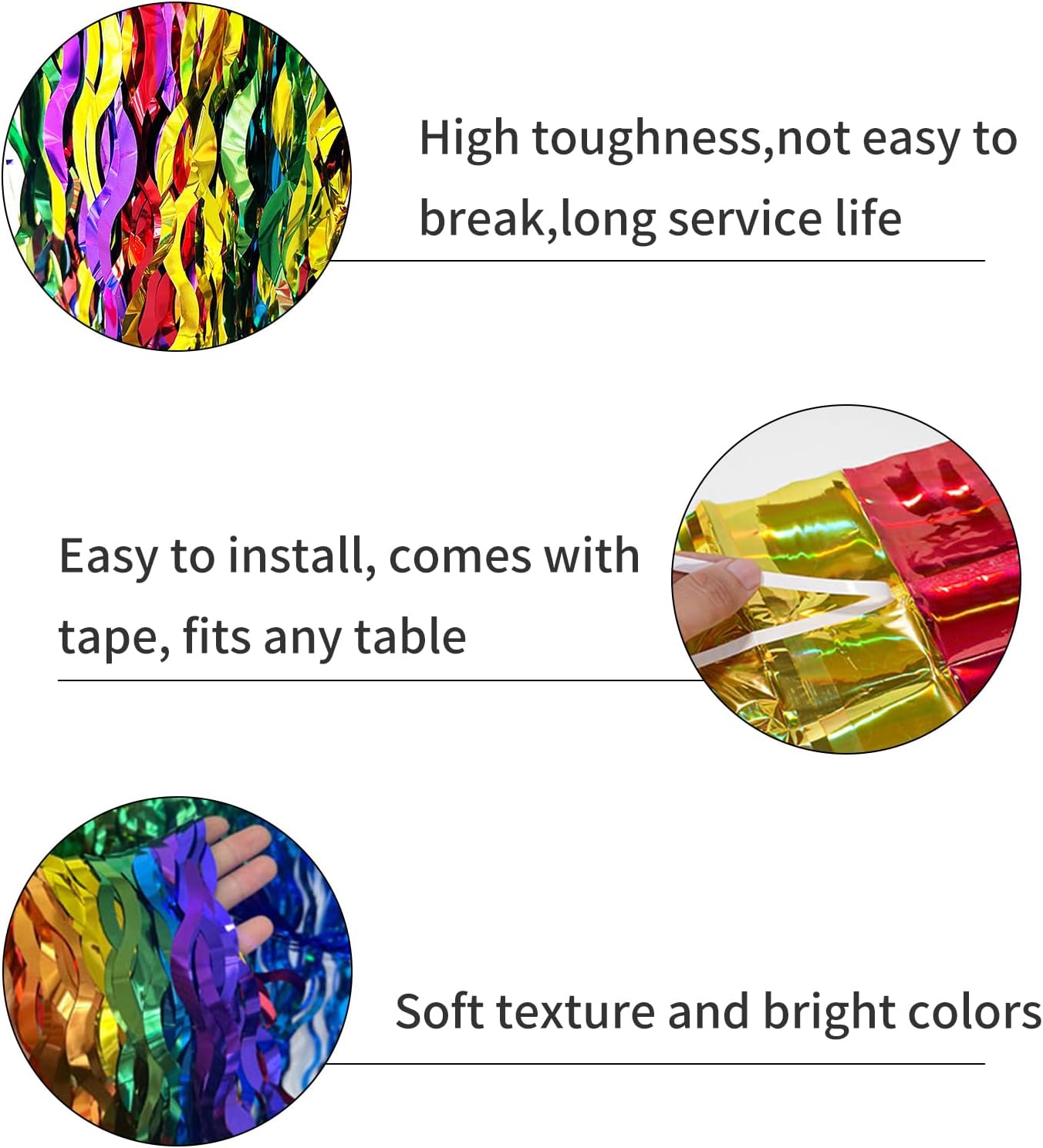 Eccellente materiale in foglio di alluminio: questa decorazione arcobaleno è realizzata in materiale in foglio di alluminio di alta qualità, che non solo ha un'eccellente lucentezza ma ha anche un'eccellente durata. Aggiunge un tocco di colore al tuo tavolo da pranzo e rende l'intero ambiente da pranzo più invitante e piacevole. Vivace e dettagliata: questa tovaglia arcobaleno ha lucide nappe arcobaleno che non solo danno un senso di movimento e stratificazione, ma rendono anche la gonna del tavolo in generale più vivace e interessante. Questi dettagli aggiungono un'atmosfera speciale alla celebrazione e rendono la tua tavola il centro della riunione. Coordinazione dei colori dell'arcobaleno: questa gonna da tavolo in lamina metallica con nappe ha un design color arcobaleno, colorato e vibrante, perfetto per varie celebrazioni. Può aggiungere un effetto decorativo unico al tuo tavolo e rendere l'intero ambiente da pranzo più vivace e interessante. Installazione semplice: il processo di installazione è estremamente semplice: rimuovi prima la carta protettiva autoadesiva attaccata alla tovaglia glitterata arcobaleno, quindi avvolgi il grembiule attorno al perimetro del tavolo e premi delicatamente il grembiule con le mani per assicurarti che sia fissato nella posizione corretta. Ciò ti consente di creare facilmente l'atmosfera perfetta per la tua celebrazione. Ampia gamma di applicazioni: questa decorazione per feste è progettata per adattarsi a una varietà di celebrazioni, che si tratti di una festa di compleanno, di una festa, di un matrimonio, di una cerimonia di fidanzamento o di una festa quotidiana, può essere perfettamente integrata e aggiungere un tocco di colore brillante al tuo momento speciale