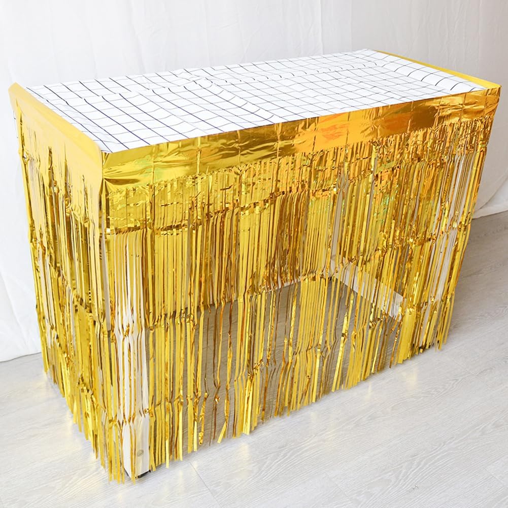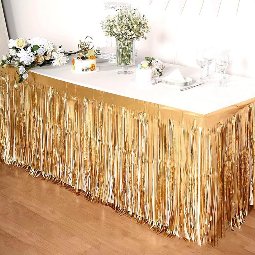 Materiale: Plastica Dimensioni: 9' x 30'' (L x P) Confezione: 2 pezzi Ogni gonna da tavolo con frange metalliche è dotata di nastro adesivo sulla parte superiore per un facile fissaggio alla parete o al tavolo Perfetto per decorare la tavola di una festa in ogni occasione come compleanno, matrimonio, addio al nubilato, baby shower,