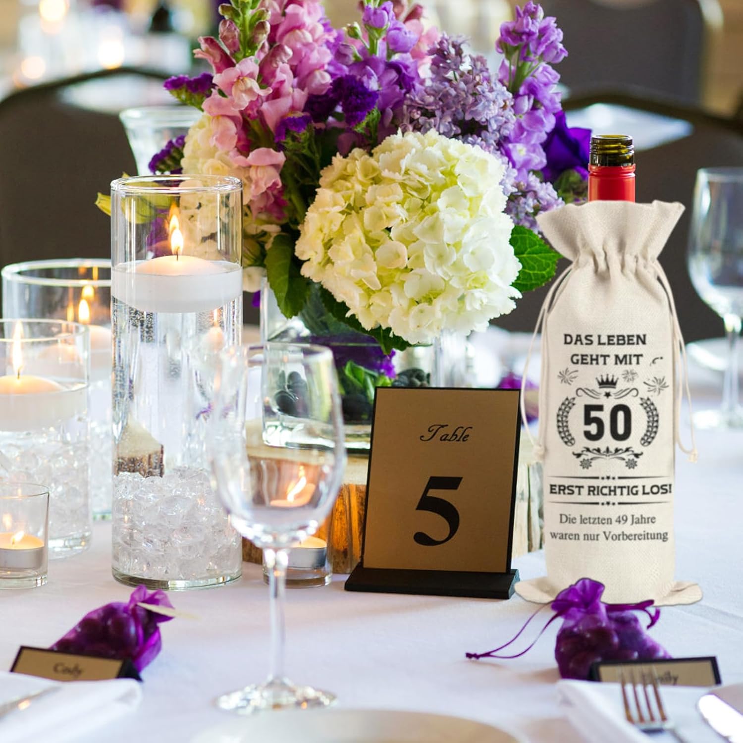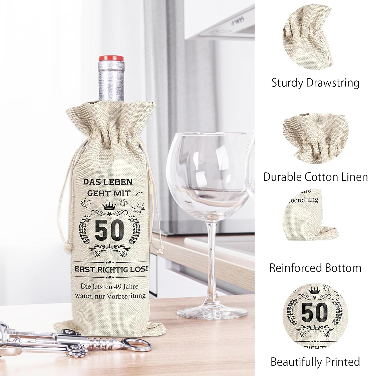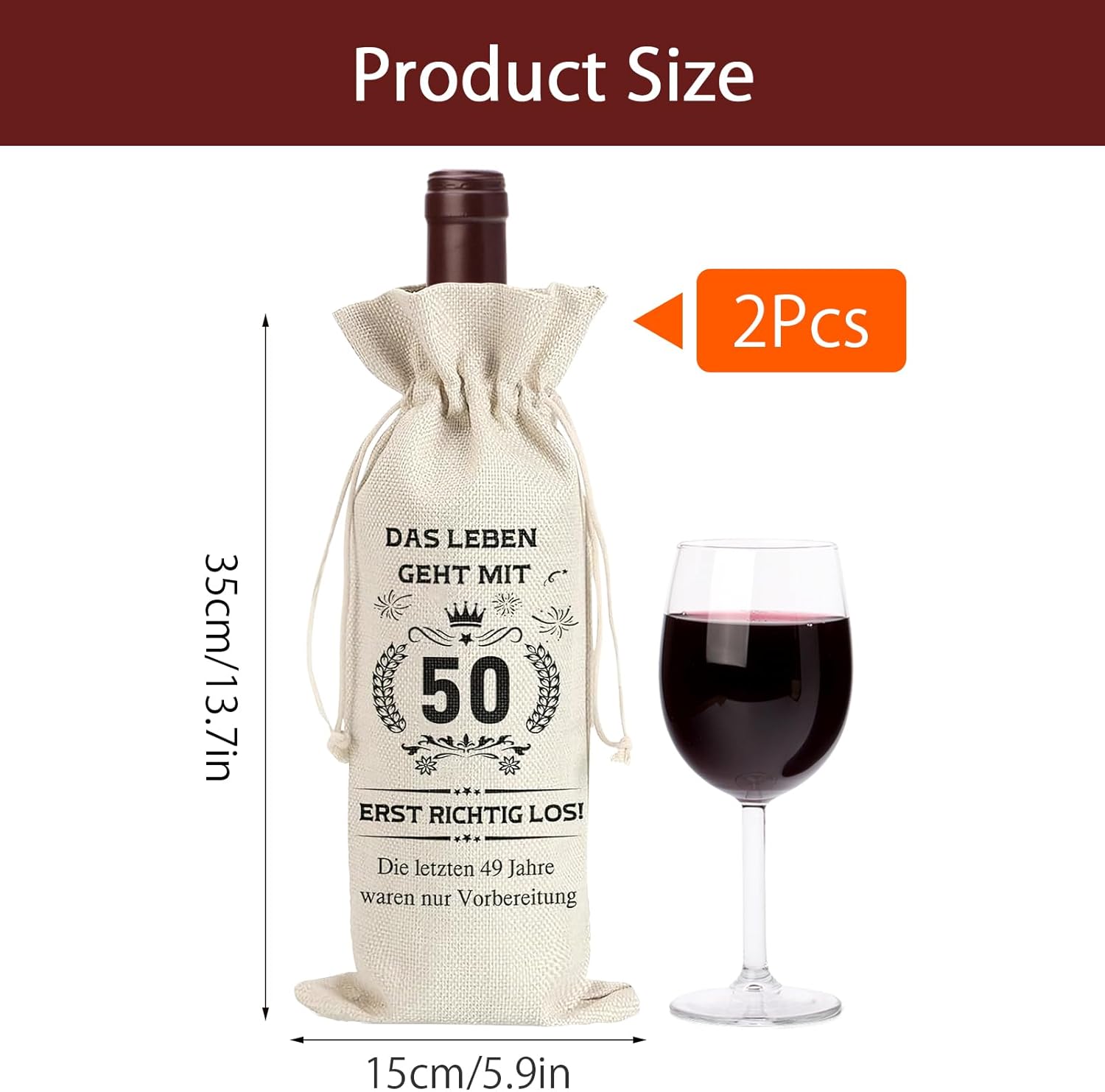 【Contenuto del prodotto】 Acquista il nostro prodotto, riceverai 2 bottiglie di sacchetti regalo, ogni sacchetto regalo è lungo 34,5 cm e largo 14,5 cm, i sacchetti regalo sono abbastanza grandi da contenere tutte le bottiglie di vino standard da 750 ml. 【Materiale eccellente】 La bottiglia del sacchetto regalo per vino è realizzata in iuta di alta qualità con design della superficie stampata, che protegge le bottiglie dai graffi, mentre il colore del puro lino naturale è più alla moda e durevole. 【Design con coulisse】 Questi sacchetti regalo per champagne di compleanno sono progettati con un cordoncino, che protegge perfettamente la bottiglia dai danni causati dal serraggio e dall'allentamento, più adatti per essere appesi e trasportati, puoi anche decorare il cordoncino con carte regalo e così via, il che rende il tuo regalo più personale e significativo. 【Riciclabile】 Questi sacchetti regalo per vino sono facili da pulire, lavare e asciugare, possono essere riutilizzati, possono essere utilizzati per lo stoccaggio e il campeggio all'aperto, molto in linea con il concetto di protezione ambientale 【50. Regalo di compleanno creativo】 Questo sacchetto regalo con benedizioni speciali sulla superficie può essere utilizzato come regalo per il 50° compleanno per donna e regalo per il 50° compleanno per uomo, e può essere utilizzato per contenere vino, champagne, birra, ecc., è il miglior regalo per le persone a cui piace bere.