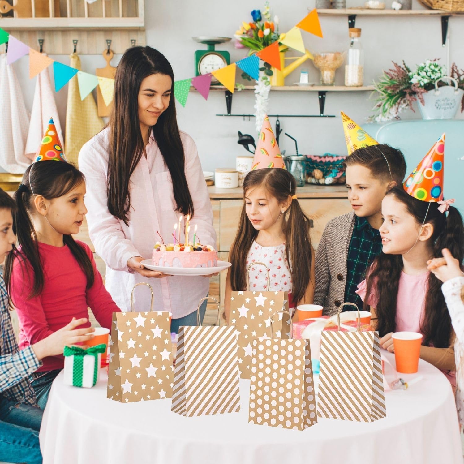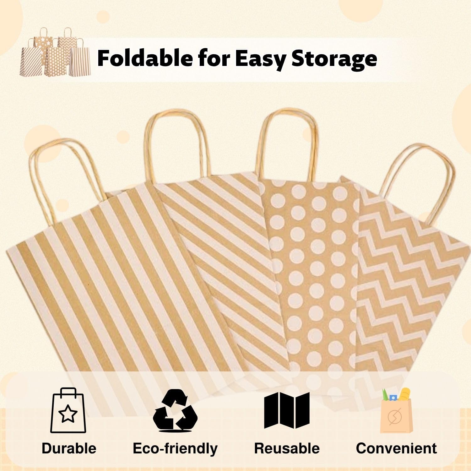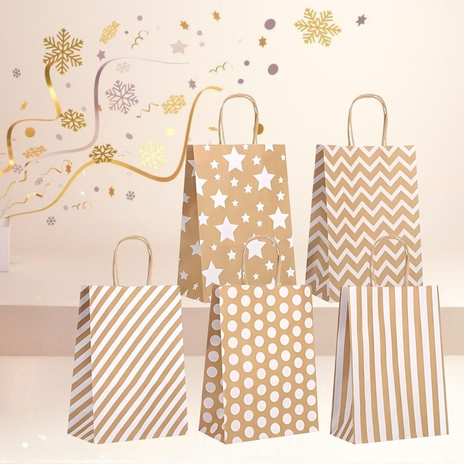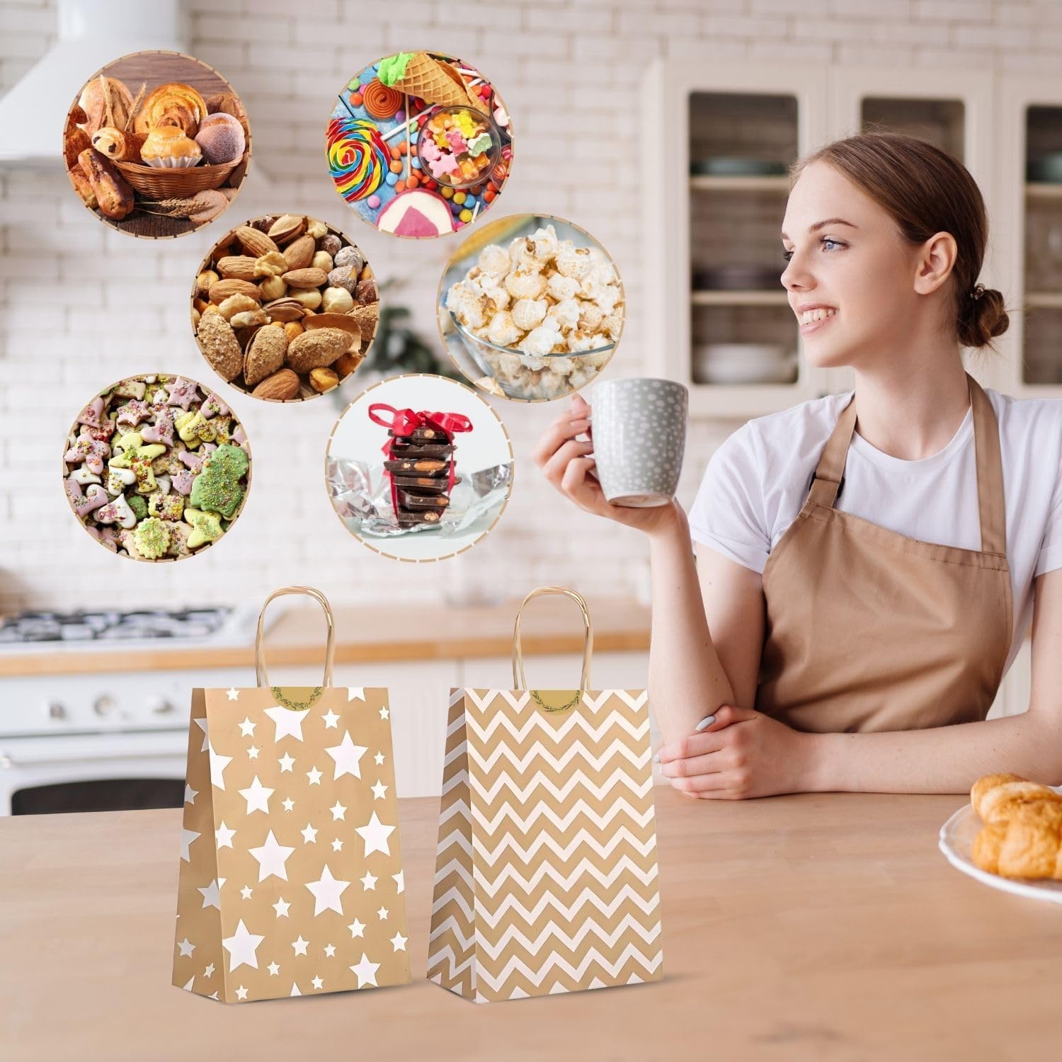Sacchetti regalo versatili in un set: questo set contiene 20 sacchetti di carta con manici in 5 motivi decorativi (4 strisce, punti, stelle, diagonali e onde ciascuno). I pratici sacchetti regalo piccoli (dimensioni: 22 x 16 x 8 cm) sono la scelta perfetta per caramelle, cioccolatini, biscotti, popcorn o altri piccoli regali. Ideale per confezionare regali in modo rapido e accattivante. Stabilità e materiale durevole: i nostri sacchetti regalo sono realizzati in carta kraft robusta e resistente agli strappi. La base solida garantisce una posizione sicura e una capacità di carico affidabile. I tuoi regali sono ben protetti in questi robusti sacchetti di carta e i sacchetti possono essere utilizzati più volte. Manici comodi e robusti: i manici di carta strettamente attorcigliati di questi sacchetti di carta con manici garantiscono una vestibilità sicura e confortevole. Sono particolarmente resistenti e non si strappano: questo rende questo sacchetto regalo sostenibile e adatto al trasporto quotidiano. Ideale anche per il cibo: i sacchetti regalo non sono adatti solo per i regali. Grazie al materiale innocuo è possibile utilizzare questi sacchetti di carta in modo sicuro anche per alimenti come panini, tramezzini, pasticcini o snack. Perfetti come pratici sacchetti per il pane o come sacchetti per snack da portare in viaggio. Perfetti per ogni occasione: che si tratti di una festa di compleanno, di Natale o di un incontro con gli amici, questi versatili sacchetti regalo sono la soluzione ideale. Usali come sacchetti regalo, sacchetti per feste, sacchetti per feste o confezioni da asporto. Rendono ogni regalo un vero e proprio eye-catcher.