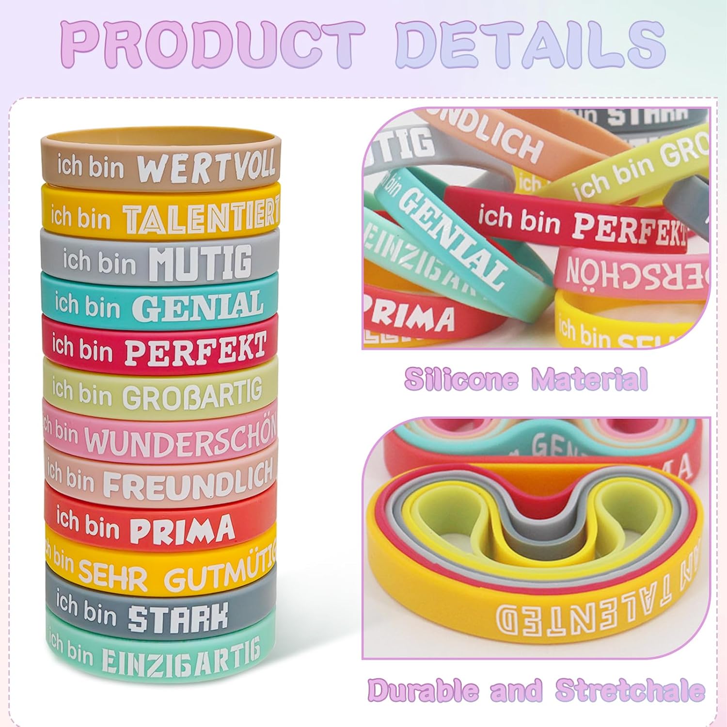 Fornisci cura e incoraggiamento: i nostri braccialetti in silicone presentano 12 diversi tipi di linguaggi motivazionali. Una varietà di metodi di incoraggiamento può davvero ispirare i tuoi figli, amici o studenti ad avere un atteggiamento positivo e una motivazione per andare avanti. Migliorerai e ti distinguerai sul lavoro o negli studi! Ricca quantità e stili: offriamo fino a 24 pezzi di braccialetti in silicone stimolanti in 12 colori di alta qualità, conferendo ai braccialetti un colore calmo e piacevole. Una quantità sufficiente ti offre una varietà di combinazioni per mostrare stili diversi. Questa serie di braccialetti in silicone può soddisfare le mutevoli esigenze emotive e le esigenze di combinazione. Materiale di alta qualità: il braccialetto in silicone personalizzato è realizzato in silicone di alta qualità, morbido e inodore, comodo da indossare. Il braccialetto ha una buona elasticità senza limitare i movimenti del polso. Ampiamente usato: i braccialetti motivazionali tedeschi possono essere indossati in diversi ambienti, al lavoro, a scuola o all'aperto. Fungono da motivatore continuo e ti accompagnano attraverso la vita in modo positivo e stimolante. Questi braccialetti sono adatti a chiunque abbia bisogno di motivazione e ispirazione. Regalo ideale: questo braccialetto per bambini è un'idea regalo unica e significativa. È adatto sia per uso personale che come regalo per un amico. Può essere utilizzato anche come souvenir o bomboniera durante le feste dei bambini.