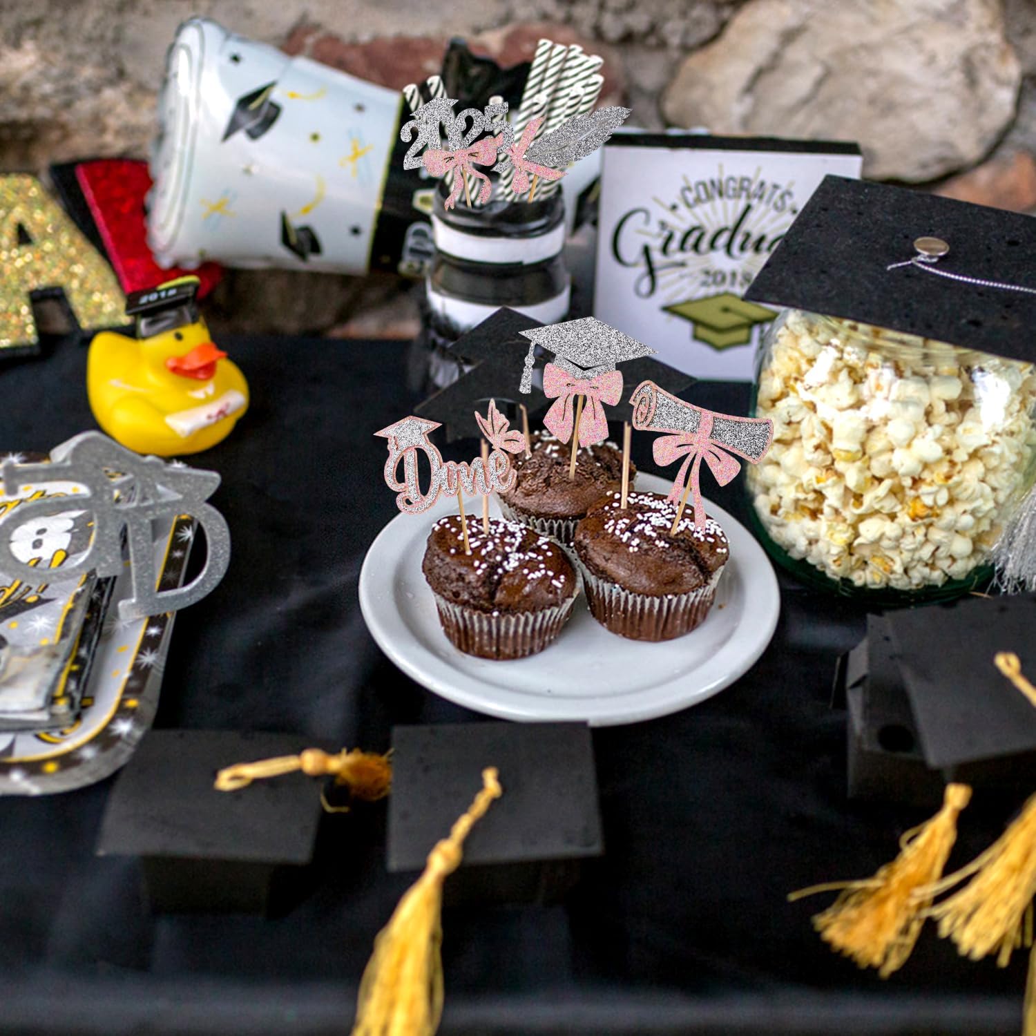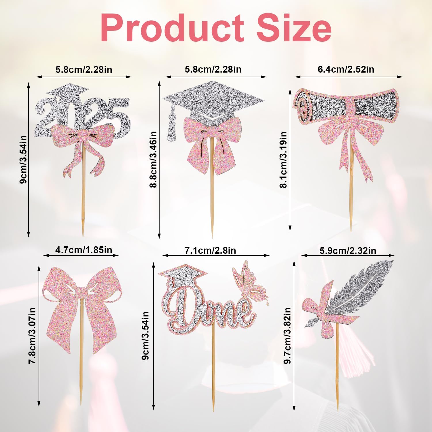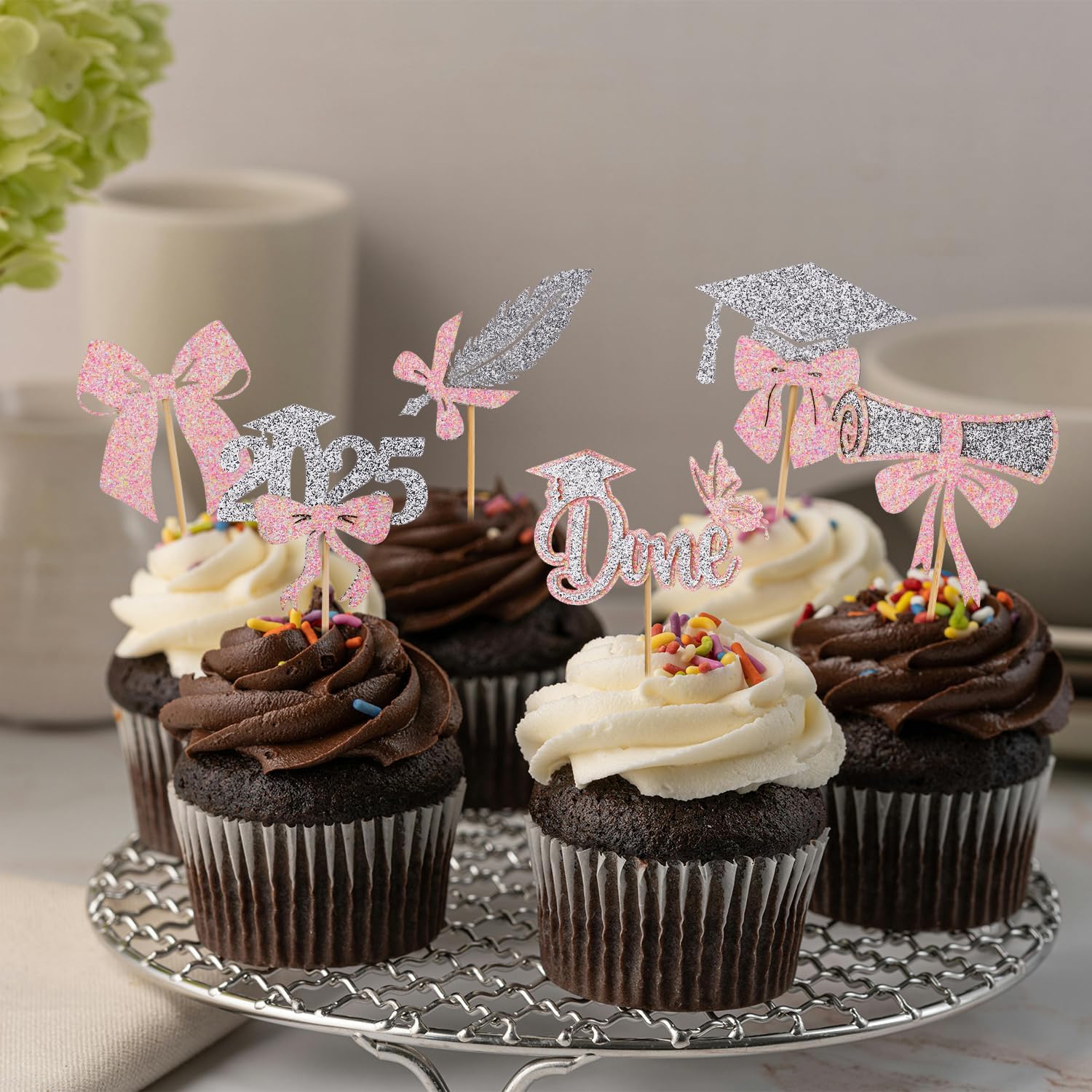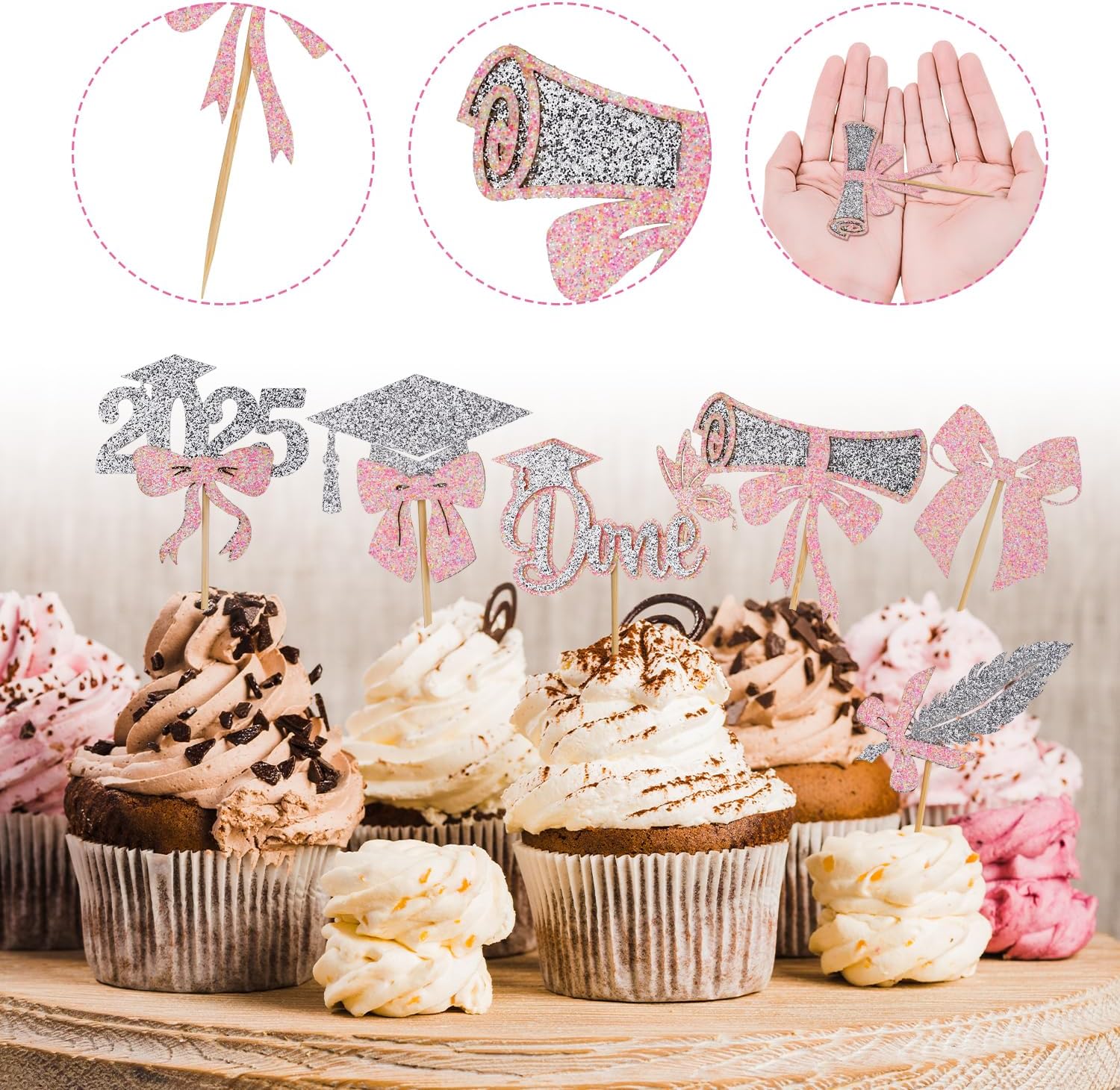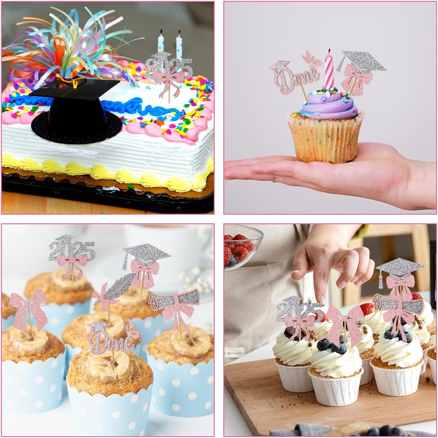 Contenuto del prodotto: riceverai 24 pezzi di toppers per cupcake con 6 stili e 4 pezzi per ogni stile. Una varietà di stili e una quantità sufficiente possono soddisfare le tue esigenze di decorazione. Materiale del prodotto: i toppers per cupcake di laurea sono realizzati in cartone di alta qualità e bastoncini di legno, spessi, con glitter fini, non facili da danneggiare. La stampa è chiara e non sbiadisce facilmente, puoi usarla con sicurezza. Design eccellente: i toppers per cupcake di laurea sono progettati per feste di laurea con motivi classici come cappelli di laurea, fiocchi, diplomi, ecc., squisiti e attraenti ed è la decorazione perfetta per i cupcake. Facile da usare: i nostri toppers per cupcake di laurea sono preassemblati e possono essere utilizzati direttamente dopo la preparazione, il che è veloce e conveniente e fa risparmiare tempo. Ampia applicazione: i toppers per cupcake di laurea possono decorare non solo cupcakes, ma anche dessert, frutta, muffin, gelati, ecc. È una decorazione ideale per le feste di laurea.