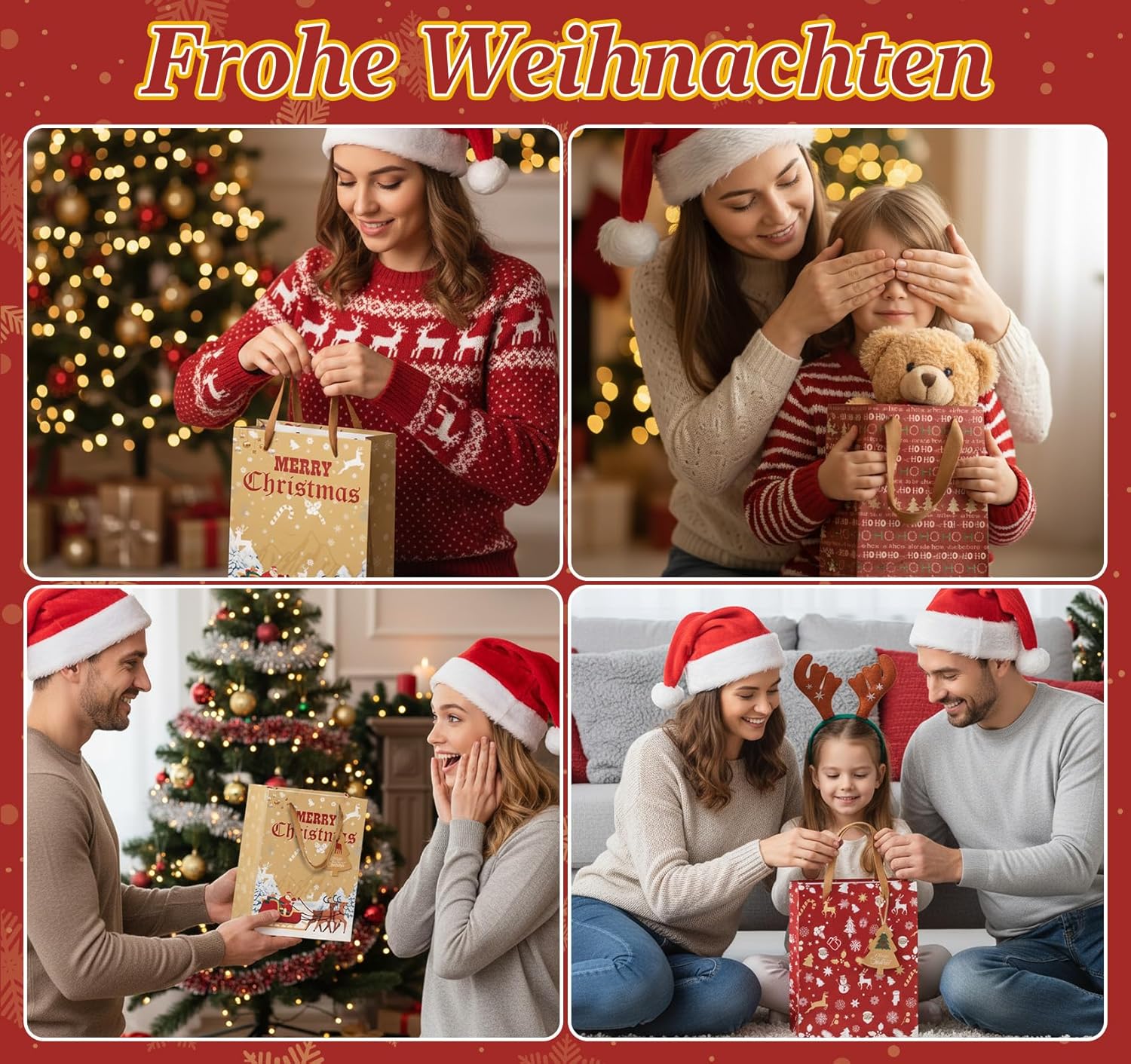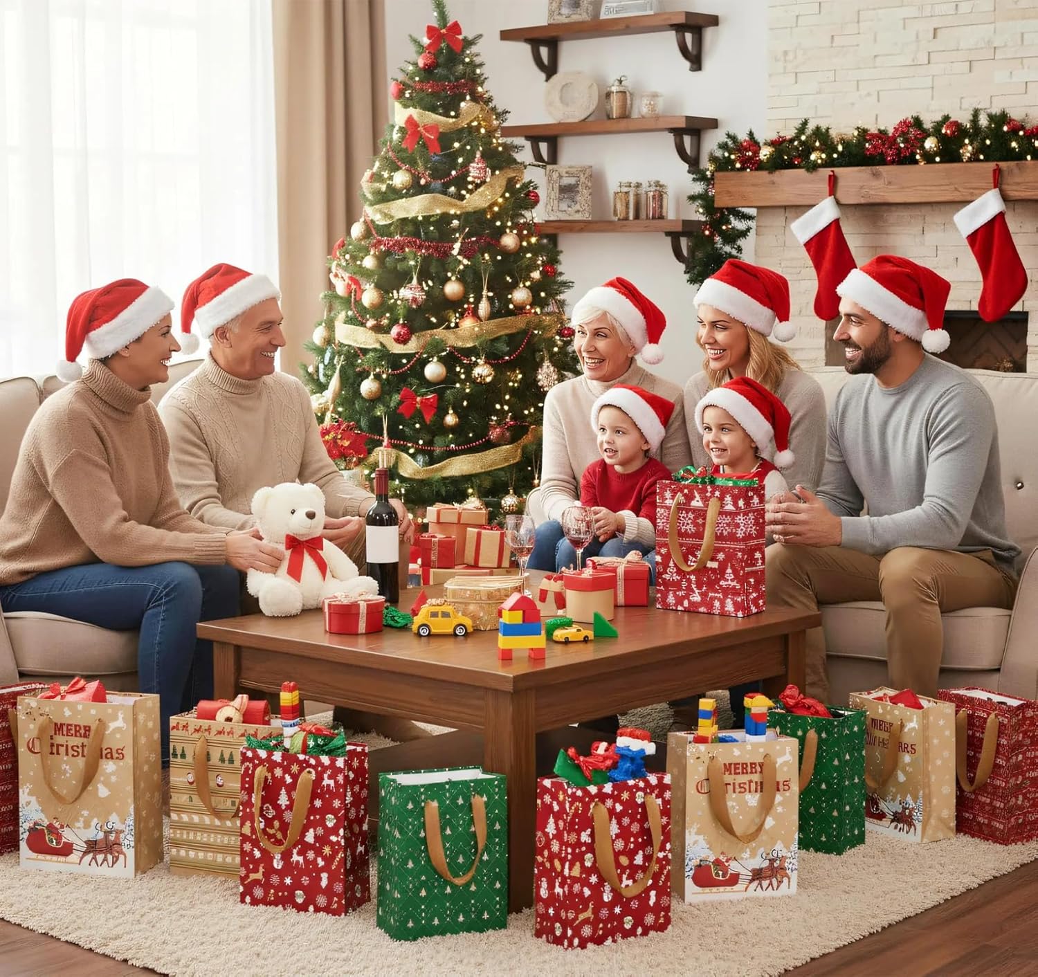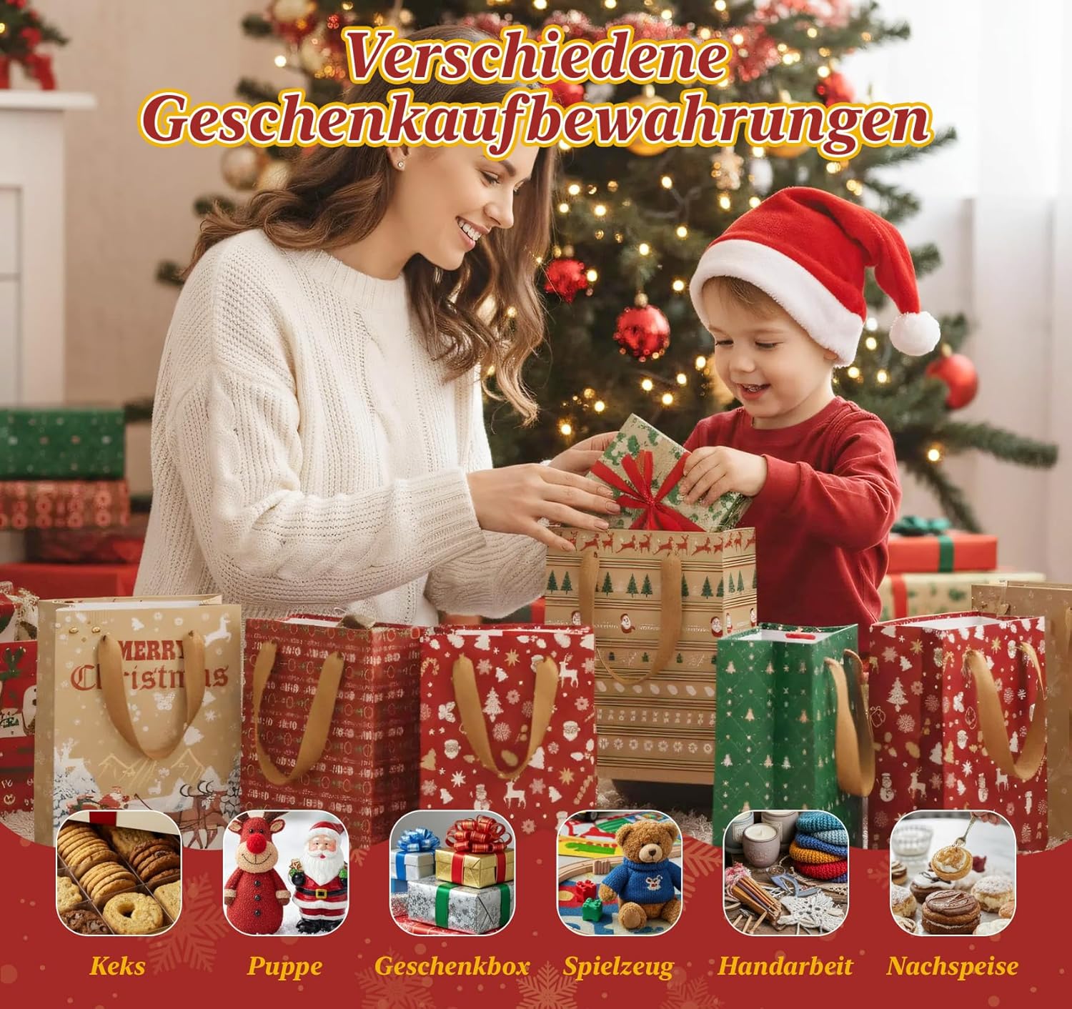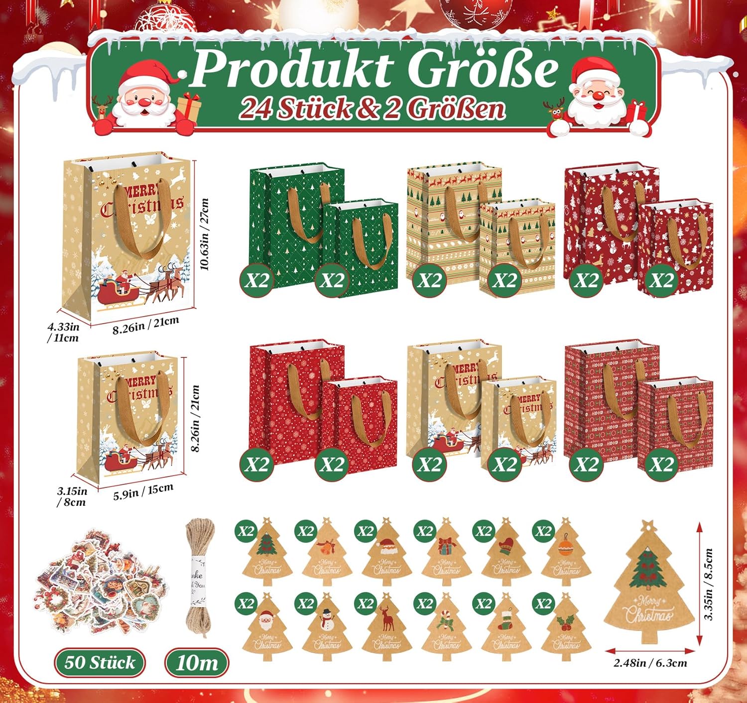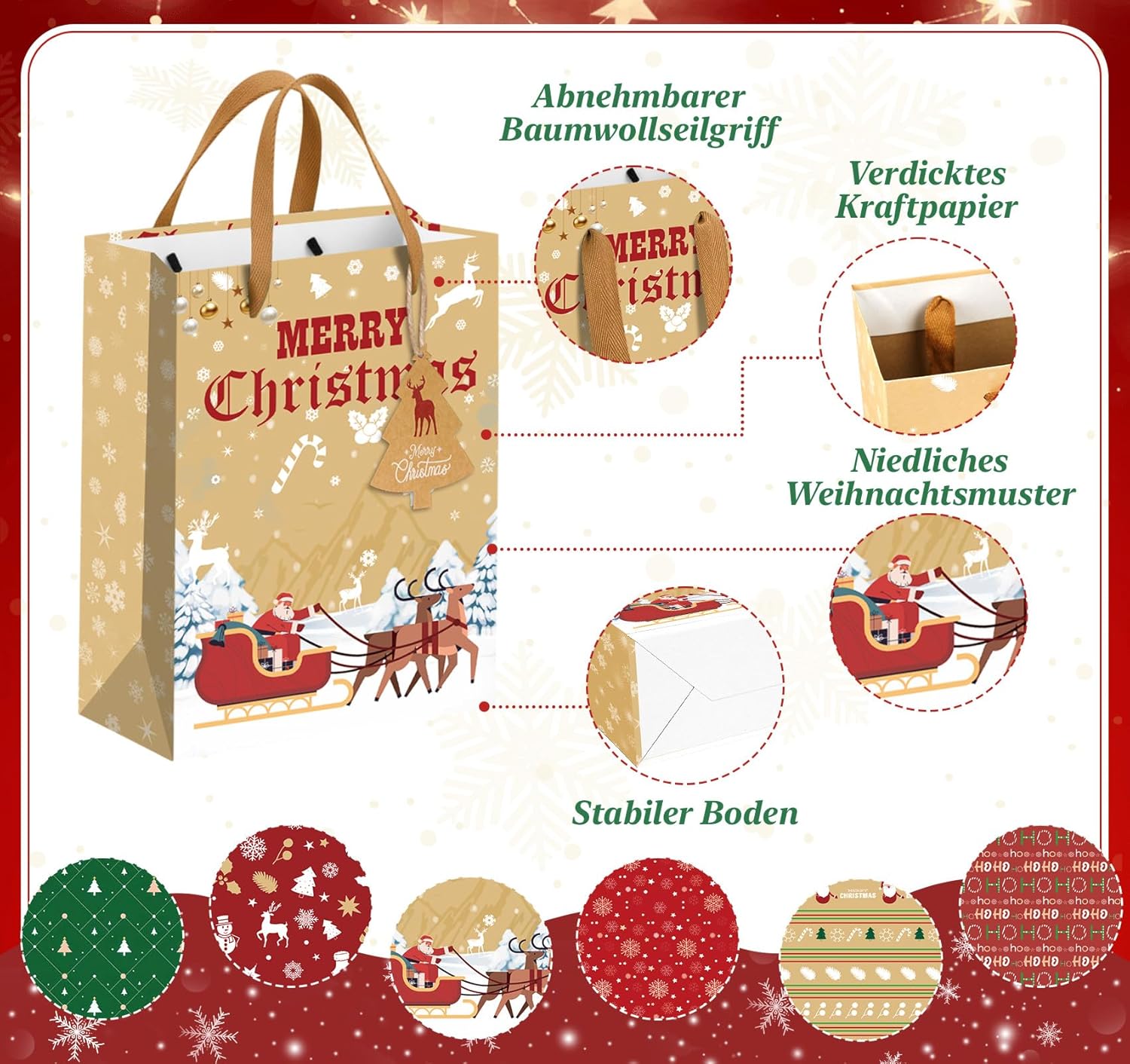 【2 misure di sacchetti regalo di Natale】 Contiene 24 sacchetti regalo di Natale con manici in 6 modelli diversi. Ogni modello è disponibile in due dimensioni: grande e piccola, con due borse per dimensione. Le dimensioni sono rispettivamente 27 x 21 x 11 cm e 21 x 15 x 8 cm, rendendoli ideali per le occasioni festive e in grado di accogliere regali di diverse dimensioni. Sono inclusi anche 50 adesivi natalizi, 24 etichette natalizie e 10 metri di spago di iuta. 【Ricchi motivi natalizi】 I sacchetti di carta natalizi sono stampati con una varietà di motivi festivi come fiocchi di neve, renne, Babbo Natale, alberi di Natale e pupazzi di neve, che diffondono un'atmosfera natalizia calda e allegra. Con i loro design affascinanti e la stampa pulita e distintiva, sono ideali per feste di Natale, riunioni di famiglia e feste festive. 【Sacchetti di carta natalizi durevoli ed ecologici】 Questi sacchetti regalo natalizi realizzati in carta kraft ecologica di alta qualità sono robusti, resistenti all'abrasione e agli strappi, garantendo la sicurezza dei regali contenuti all'interno. Una volta aperta, la borsa si apre per rivelare una base rinforzata che offre una maggiore capacità di carico rispetto ai tradizionali sacchetti regalo. Questi sacchetti regalo di Natale sono biodegradabili e possono essere riciclati. 【Maniglie robuste per un facile trasporto】Tutte le borse natalizie hanno robuste maniglie in tessuto che sostituiscono i tradizionali cordoni di carta. Le ampie maniglie riducono la pressione sui palmi durante il trasporto di carichi pesanti, garantendo un trasporto confortevole. Sono anche più resistenti e rimovibili. I colori dei manici si abbinano perfettamente alle borse natalizie. 【Sacchetti natalizi ampiamente utilizzati】 I sacchetti regalo natalizi grandi e piccoli in carta kraft sono ideali per regali di Natale, libri, giocattoli, dolci, biscotti e torte. Sono anche ottimi sacchetti regalo per vino, completi di etichette per albero di Natale abbinate per etichettare e organizzare. Regala alla tua famiglia e ai tuoi amici una sorpresa natalizia davvero unica!