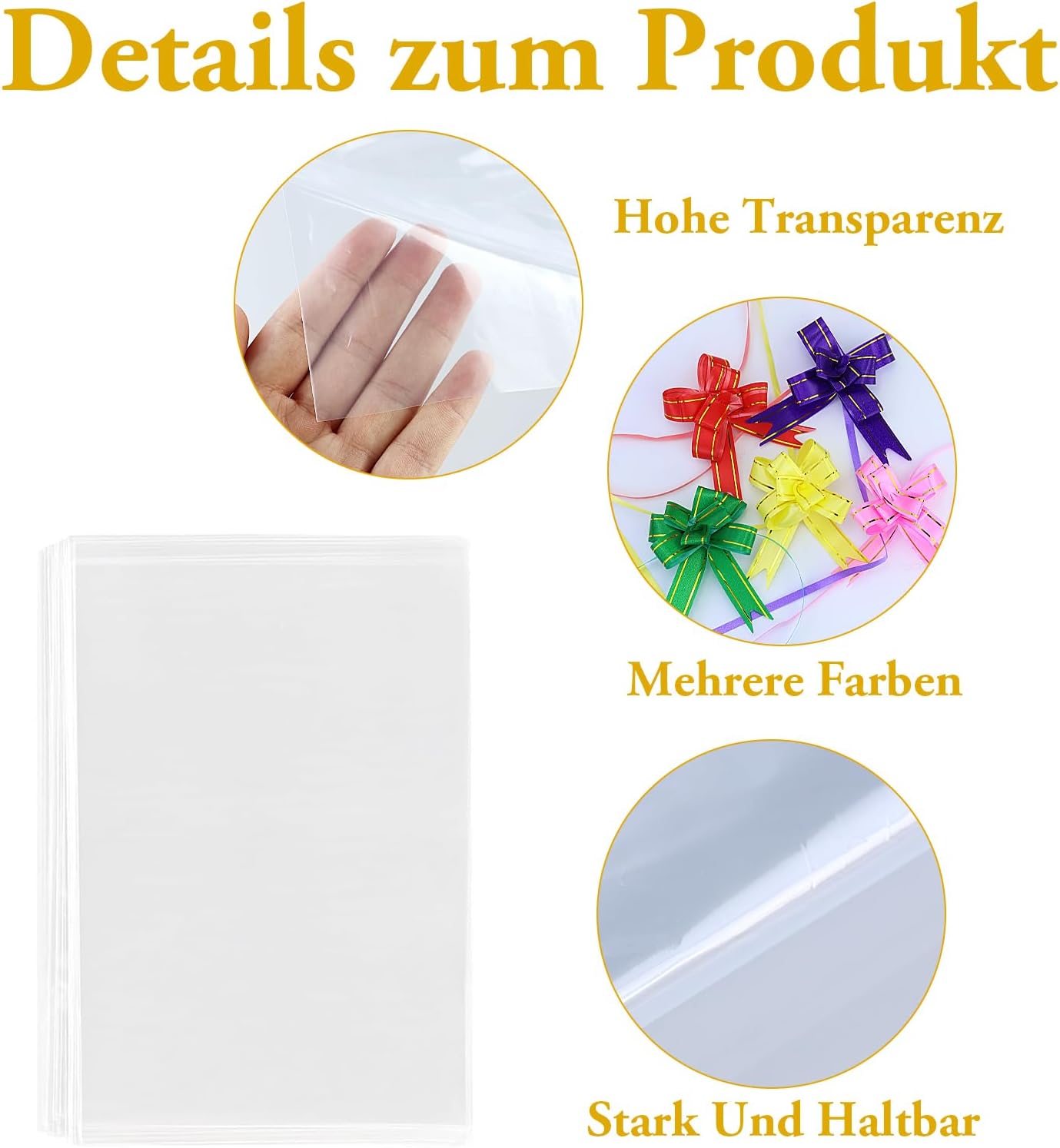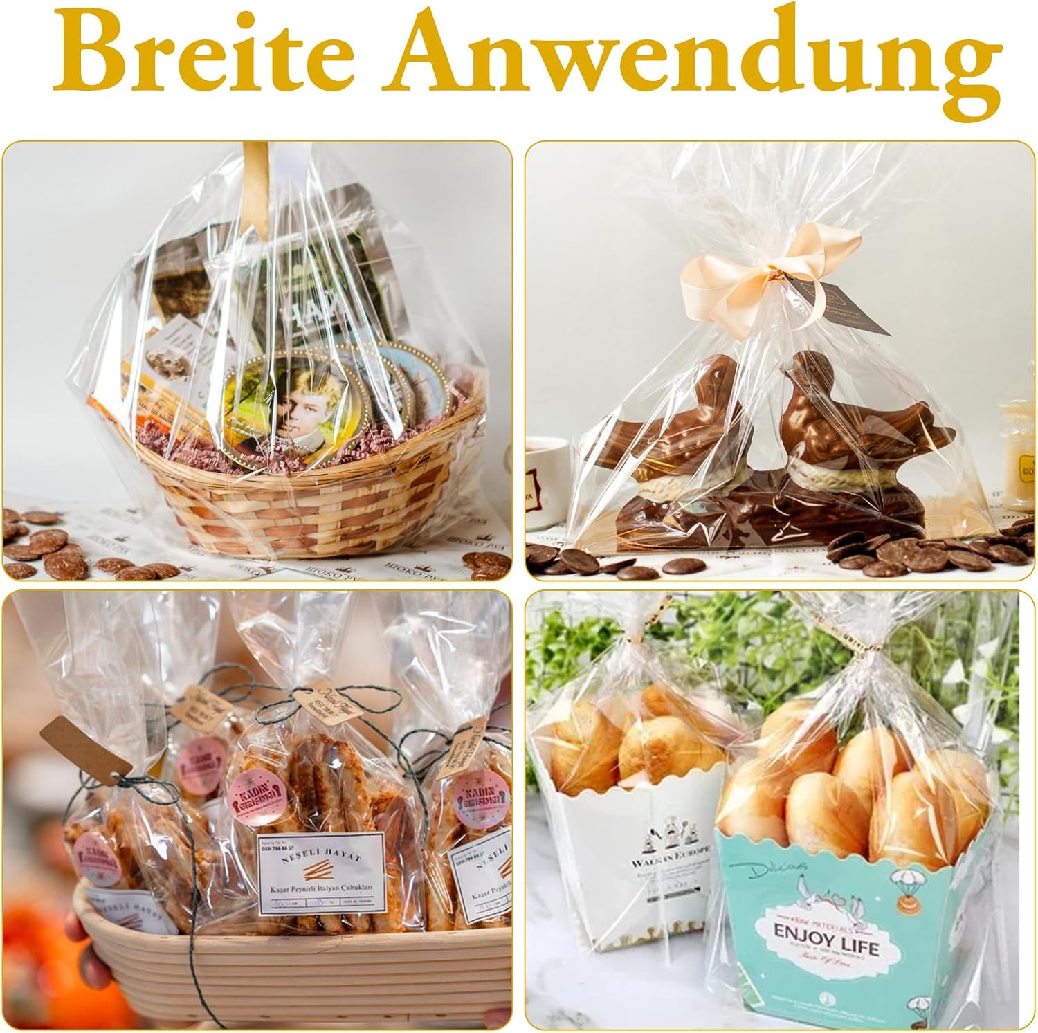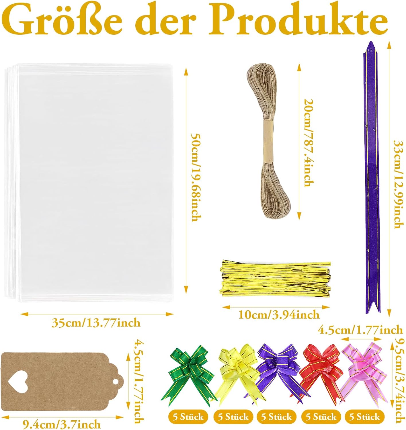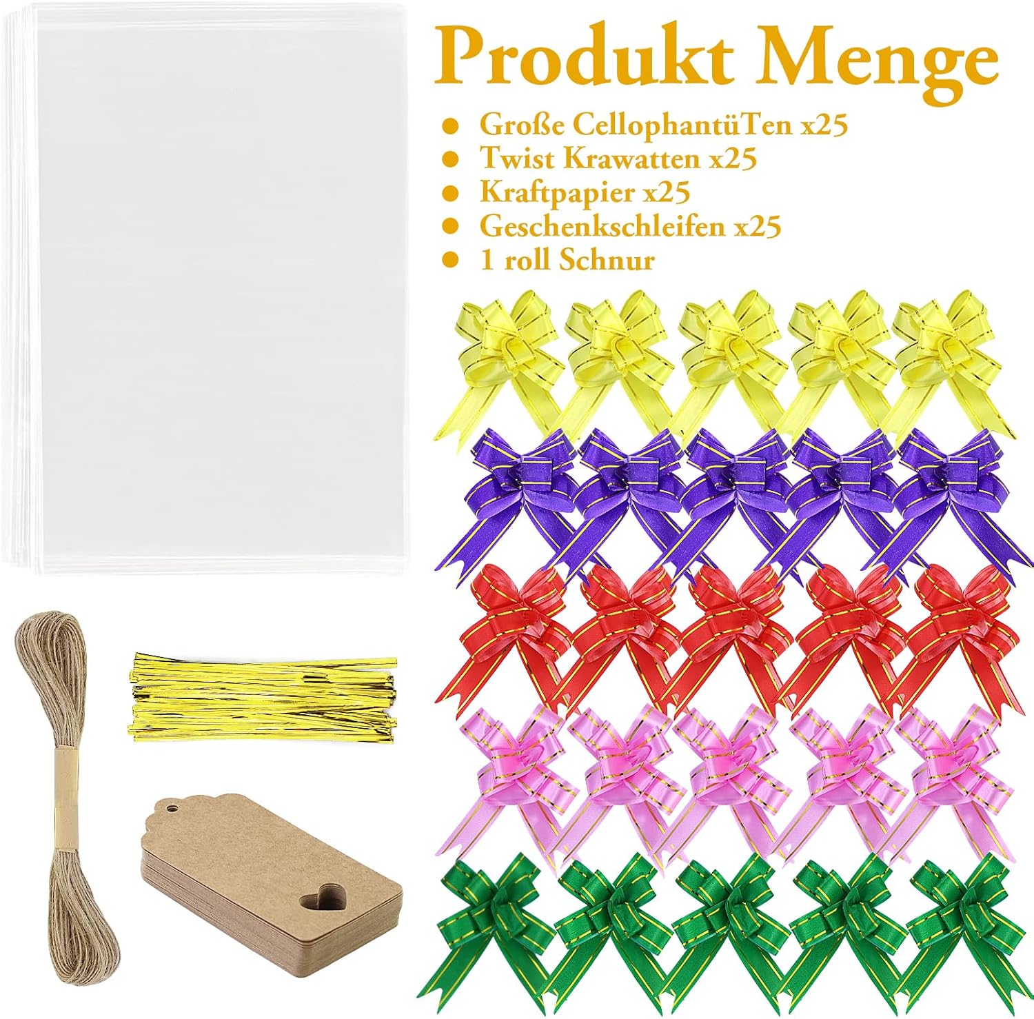 Facile da usare: il nostro sacchetto regalo trasparente è facile da usare, devi solo mettere gli articoli nel sacchetto regalo trasparente, quindi stringere il nastro tessuto per fissarlo, annodare un fiocco come decorazione e scrivere i tuoi desideri più calorosi sull'etichetta vuota! I sacchetti regalo trasparenti ti permettono di vedere chiaramente gli oggetti all'interno senza compromettere la bellezza degli oggetti stessi. Materiale di alta qualità: il nostro sacchetto regalo trasparente è realizzato in materiale OPP di alta qualità, trasparente, atossico e inodore. Nel frattempo, il singolo strato di questa borsa regalo ha un certo spessore, impermeabile, resistente all'umidità e agli strappi, quindi puoi usarlo con sicurezza. Design trasparente: la nostra borsa regalo è ricoperta da una pellicola di imballaggio trasparente che non copre il colore principale della merce. Quindi la vista è chiara, i cuori bianchi, i fiori e le confezioni regalo sembrano più nobili ed eleganti. Ampia applicazione: questo nostro cellophane trasparente ha una vasta gamma di usi, non solo per confezionare regali, ma anche per conservare alcune necessità quotidiane, come bambole, vestiti, giocattoli di peluche, biancheria da letto e così via. Adatto a varie occasioni, come compleanno, baby shower, Natale, Pasqua, San Valentino, festa del papà, festa di matrimonio, laurea e così via. Bellissimo set: riceverai 25 borse trasparenti, 25 cordoncini (5 colori), 20 fiocchi dorati e 20 cartellini vuoti con cordoncini attaccati. Le scatole regalo trasparenti sono perfette per cesti regalo e fiori di medie dimensioni e sono disponibili in quantità sufficienti per soddisfare le tue esigenze.