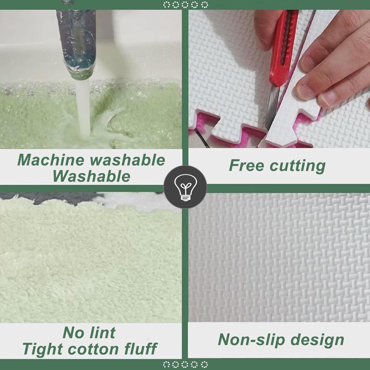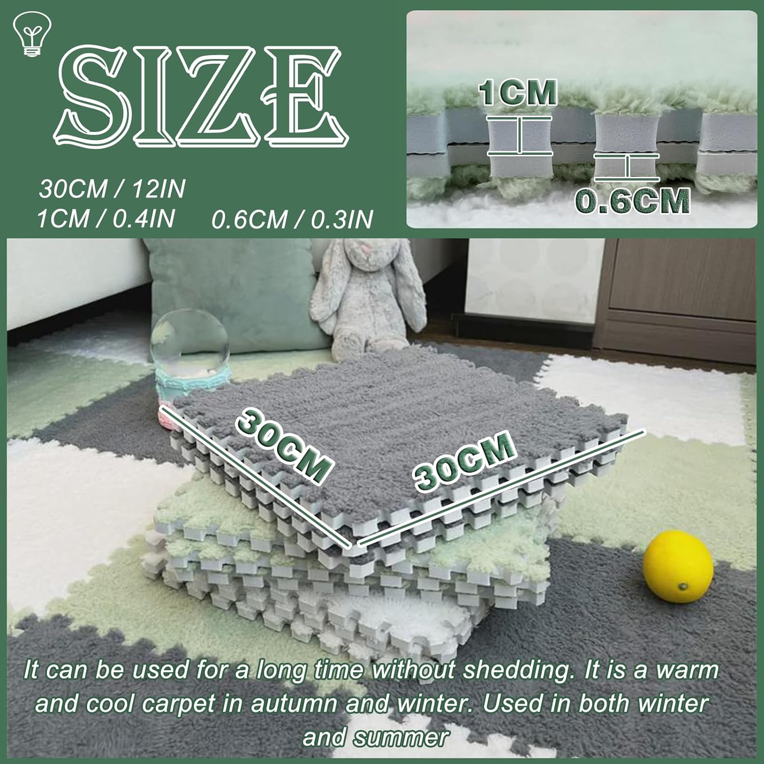 【Copertura regolabile】Set di 28 pezzi di piastrelle da 12 x 12 pollici (30,5 x 30,5 cm) (spessore 0,4 pollici/1 cm) con bordi in colore coordinato; Aggiungi/rimuovi facilmente le tessere per adattarle a sale giochi, soggiorni o camere da letto. 【Morbidezza e durata a doppio strato】 La base in schiuma EVA anti-spargimento e la parte superiore in morbido peluche offrono comfort ammortizzato e protezione del pavimento; i colori vivaci resistono allo sbiadimento per un uso a lungo termine. 【Assemblaggio stile puzzle】Le piastrelle leggere si incastrano perfettamente per un'installazione rapida; smontare in pile compatte per risparmiare spazio durante i riarrangiamenti. 【Pulizia senza problemi】 Aspirare o pulire con acqua; la superficie resistente resiste al traffico intenso, mantenendo i tappeti freschi negli ambienti domestici come le sale giochi. 【Soluzione domestica versatile】 Crea un rivestimento del pavimento morbido e sicuro per il gioco, il riposo o le riunioni; riduce il rumore e isola i pavimenti duri aggiungendo un tocco decorativo alle palestre domestiche o alle aree di attività dei bambini.