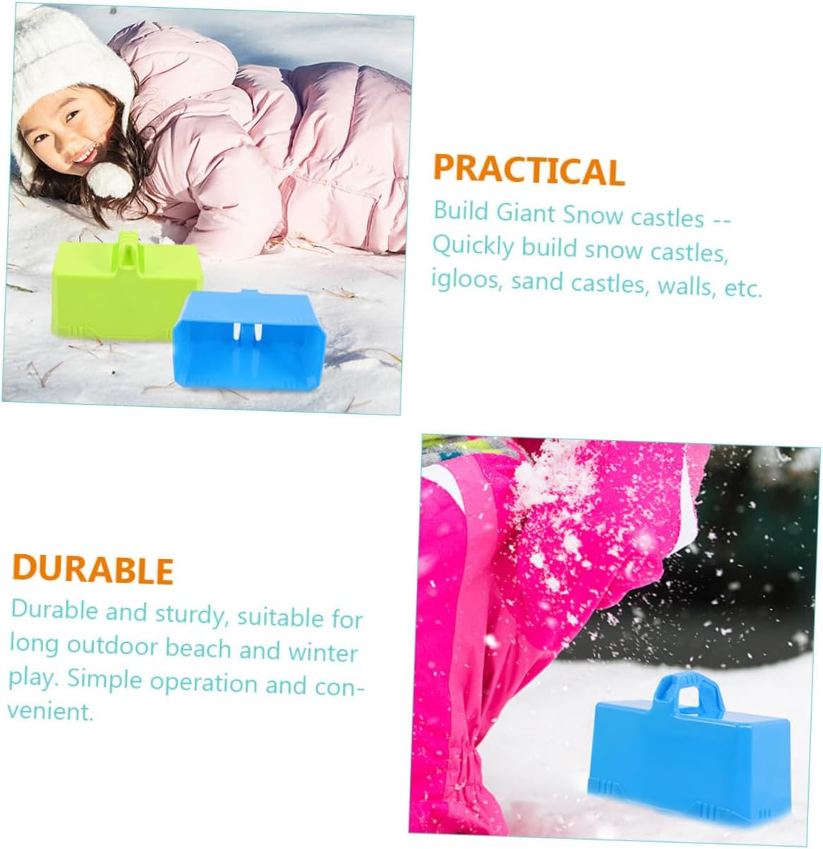 Modellamento della neve: questo strumento per bloccare la neve è ottimo anche per l'esterno in inverno. Inoltre, il giocattolo con i blocchi di neve è ideale per persone di tutte le età per combattere con i blocchi di neve o divertirsi sulla neve. Giocattoli da neve per esterni Snow Maker: giocattoli da neve durevoli per esterni che ti consentono di creare rapidamente più blocchi di neve ogni volta. Le tue mani rimangono pulite e calde. Divertiti con le battaglie con i blocchi di neve e i creatori di blocchi di neve per il gioco all'aperto con gli attrezzi da neve - con la neve per te puoi impilare rapidamente più blocchi di neve ogni volta mantenendo le mani pulite e calde. Gioco di neve per - progettato per adulti e bambini per creare rapidamente e facilmente blocchi di neve e giocattoli dalla forma perfetta sulla neve senza doversi preoccupare se i tuoi si annoieranno in inverno. Giocattoli da neve per esterni Giocattoli da neve per - I giocattoli da neve creativi e pratici possono portare gioia ai bambini e permettere loro di trascorrere un bell'inverno insieme, giocattoli da neve