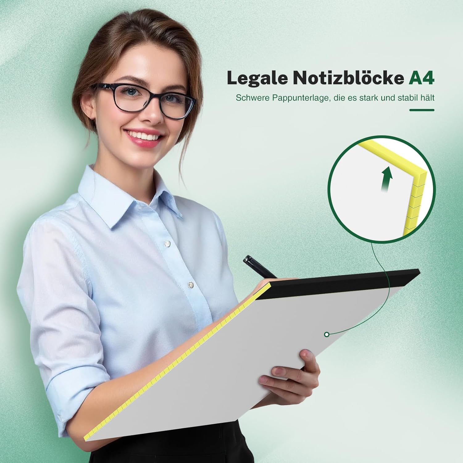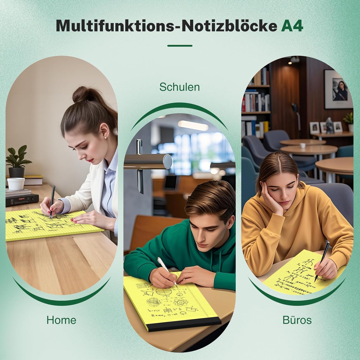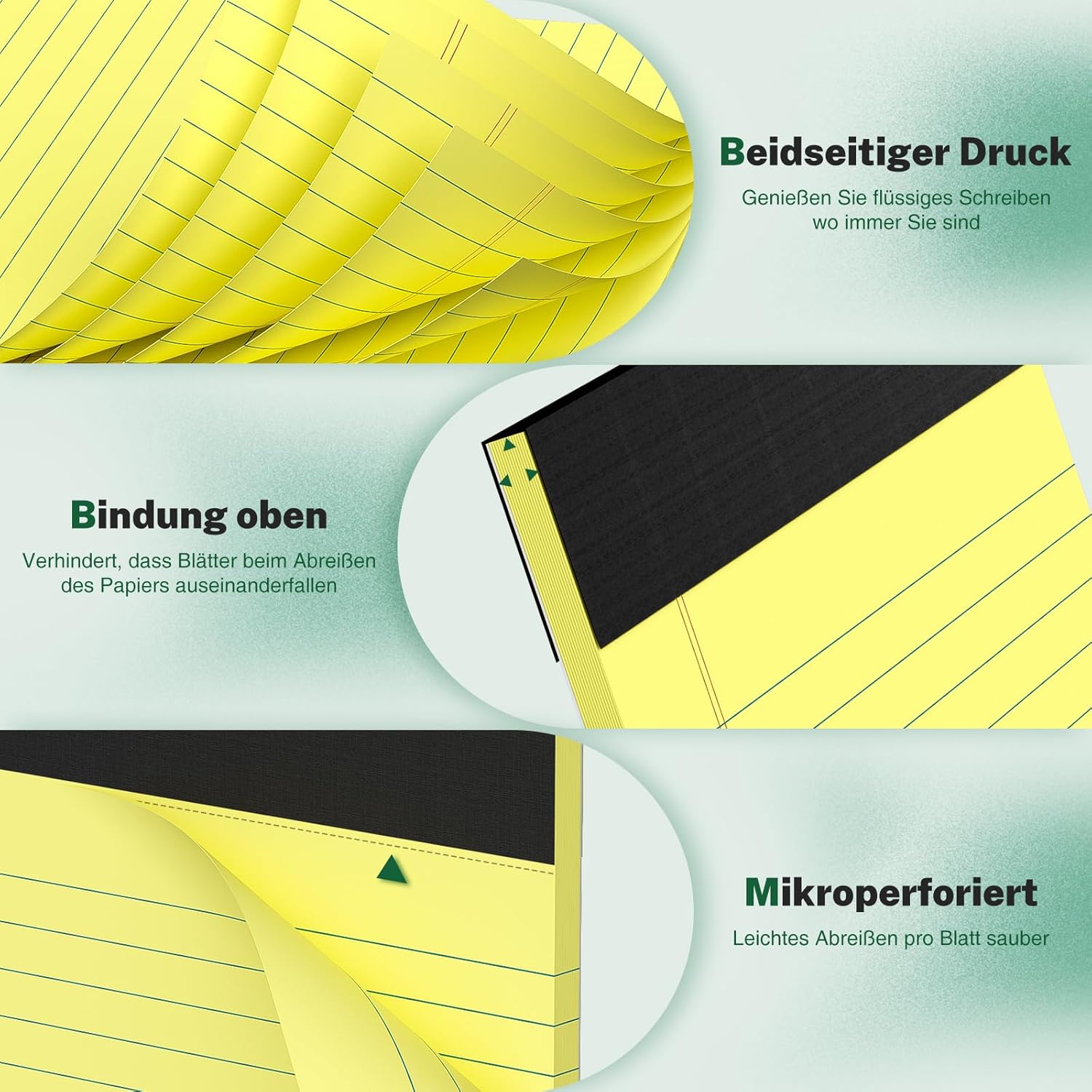 Carta premium: il blocco note giallo A4 è realizzato con carta di alta qualità che impedisce all'inchiostro di penetrare tra le pagine, facile da scrivere o disegnare, la penna neutra e la penna a sfera scrivono in modo fluido e senza sforzo sul blocco note. Il blocco note A4 a righe presenta un retro in cartone per un ulteriore supporto durante la scrittura o la scrittura, i blocchi note A4 sono perfetti per scrivere in movimento. Blocco note perforato: il blocco note A4 perforato consente di rimuovere i singoli fogli in modo semplice e pulito. Anche in situazioni irregolari, non si strapperà. Per poter conservare facilmente gli appunti che desideri e separare quelli che non vuoi, sia per lavoro, scuola o uso personale, questi fogli A4 a righe ti semplificheranno la vita. Perfetto per appunti aziendali quotidiani e cose da fare. Scrittura e lettura più facili: il blocco note A4 a righe strette da 7 mm (9/32") è ideale per elenchi, scuola e lavoro, i blocchi note A4 gialli sono meno stancanti per i tuoi occhi, sono comodi da usare e non danno fastidio. Questo blocco note A4 è un ottimo strumento per studenti, acquirenti e dirigenti per prendere appunti. Ti aiutano a catturare i tuoi pensieri casuali e i momenti speciali in modo da non dimenticare più le cose. Dimensioni e quantità: Ogni confezione di blocchi note legali A4 viene fornita con 3 blocchi di colore giallo carta, misurano 21,59 cm x 29,84 cm.. Ogni blocco note A4 giallo contiene 30 fogli da 60 pagine, per un totale di 180 pagine, offrendoti molto spazio per catturare i tuoi pensieri e idee. Puoi utilizzare il sottile blocco note A4 in carta gialla crea ricordi e registra fatture importanti, telefonate e altre cose. È perfetto per persone diverse con professioni, attività e lavori diversi per affrontare il lavoro quotidiano.