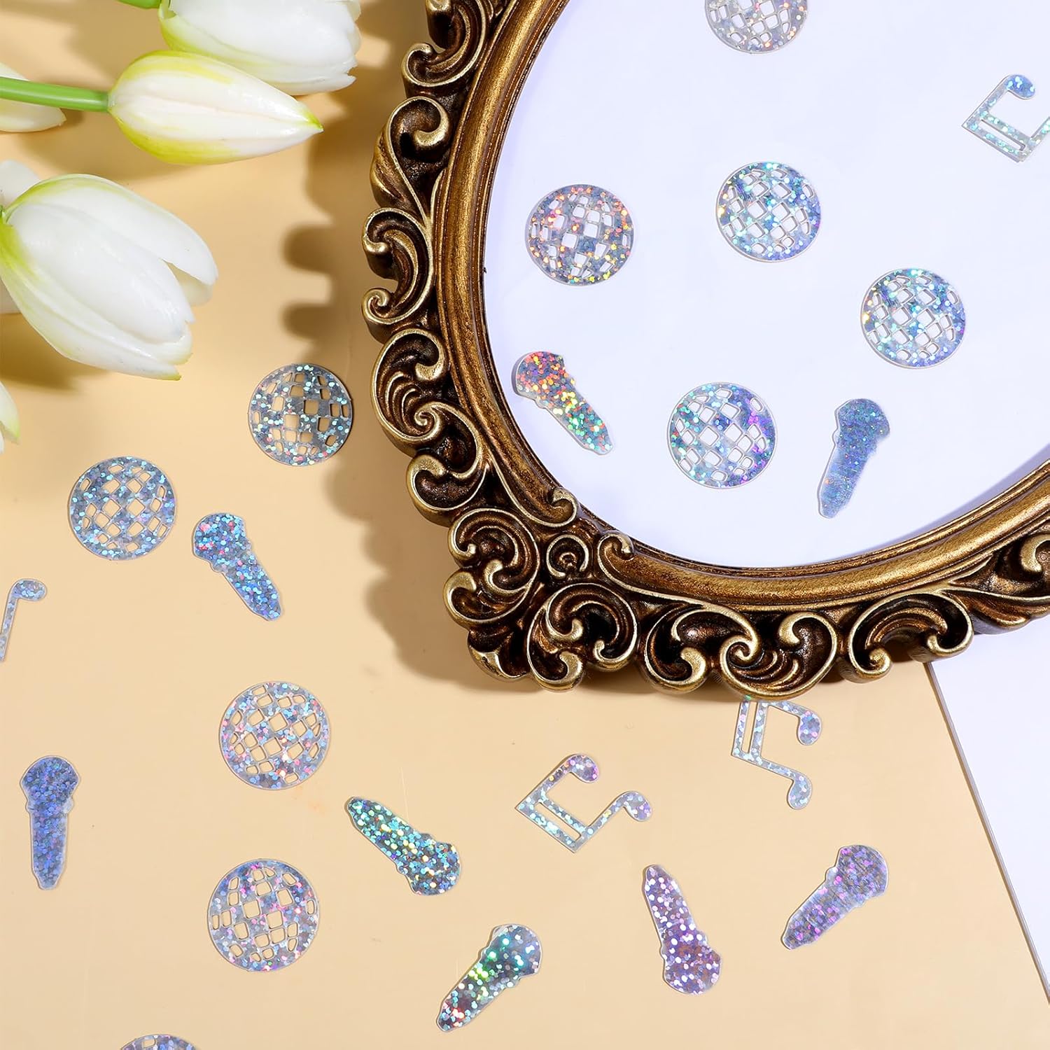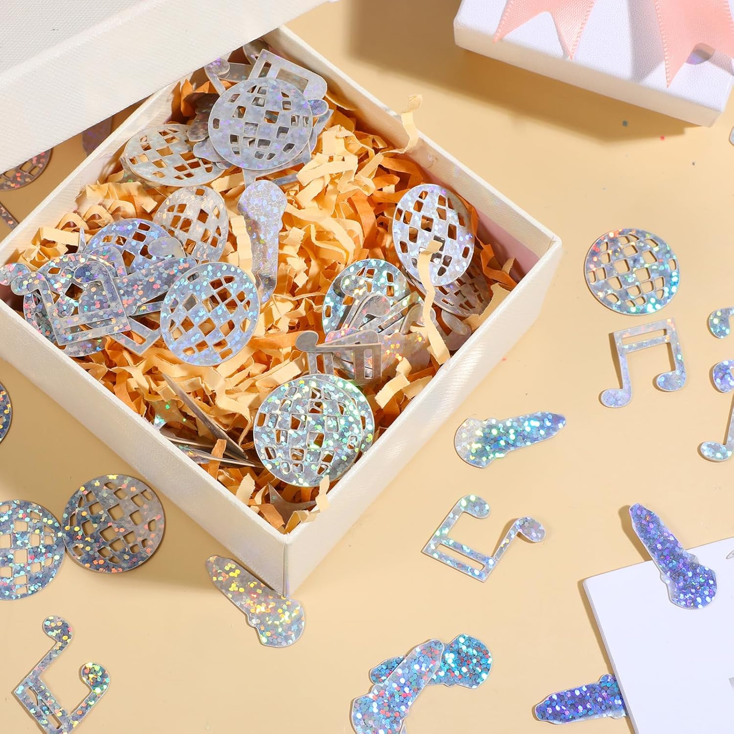 DECORAZIONE SFERA DA DISCO: I nostri 300 coriandoli glitter sono perfetti per qualsiasi festa a tema discoteca. Con superfici riflettenti che catturano la luce, doneranno al tuo evento un effetto glamour e abbagliante. Coriandoli di compleanno: questi coriandoli sono perfetti per feste di compleanno e altre occasioni festive. Con quattro design entusiasmanti: palline da discoteca, note musicali, microfoni e stelle a quattro punte, aggiungono colori scintillanti alla decorazione della tua festa. Requisiti decorativi: i coriandoli con palla da discoteca aggiungono un tocco di glamour e lucentezza a qualsiasi tavola. Basta cospargerli sulla superficie del tavolo per aggiungere un tocco glamour e rendere l'atmosfera emozionante ed energica. Materiali del prodotto: i coriandoli sferici sono realizzati in PET di alta qualità, robusti, durevoli e realistici; Ogni parte è tagliata e modellata con cura, con una superficie liscia e lucida che offre un'esperienza utente squisita. Hanno un senso estetico, fanno sì che qualsiasi tipo di elemento artistico raggiunga prestazioni perfette e rendono le foto della tua festa davvero eccellenti. Atmosfera vivace: il design scintillante dei nostri coriandoli garantisce che il tuo evento si distingua. Che si tratti di una festa a tema discoteca, di un matrimonio o di altre celebrazioni, la nostra decorazione da tavolo aggiunge un elemento festoso e vivace a qualsiasi ambiente.