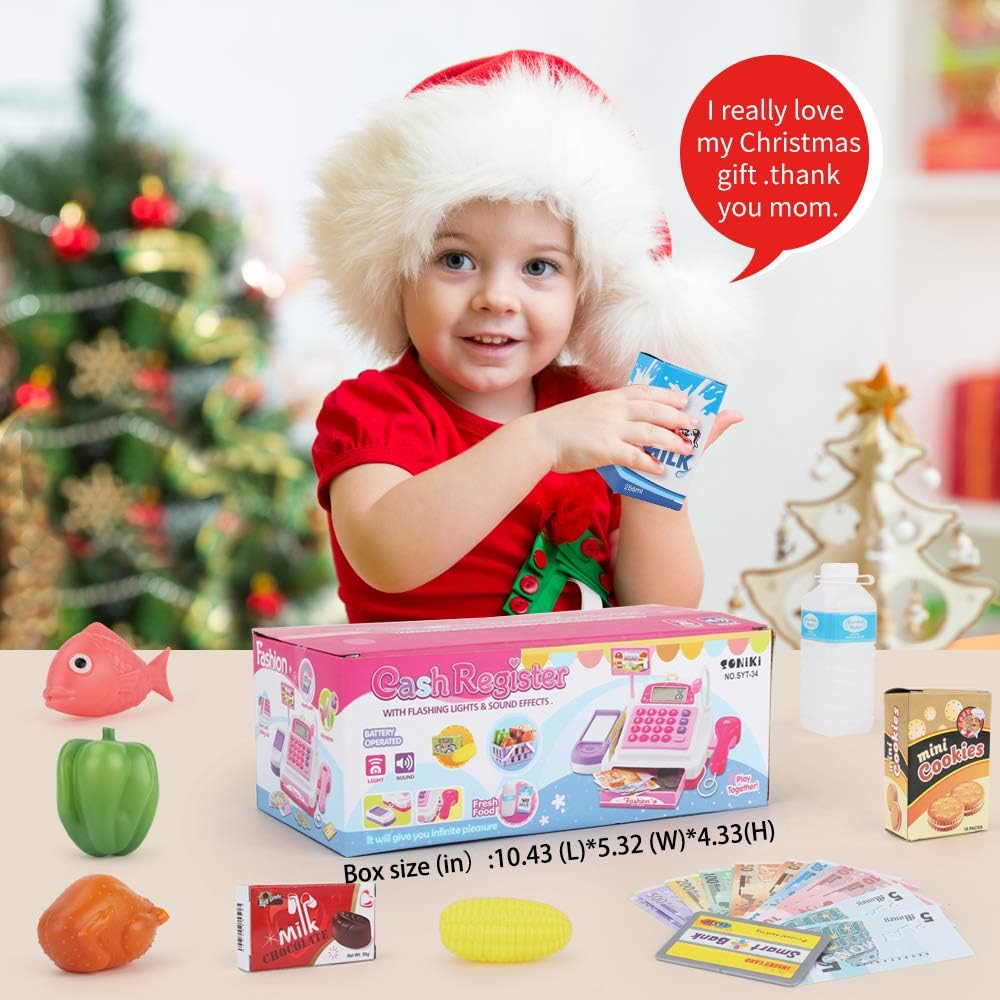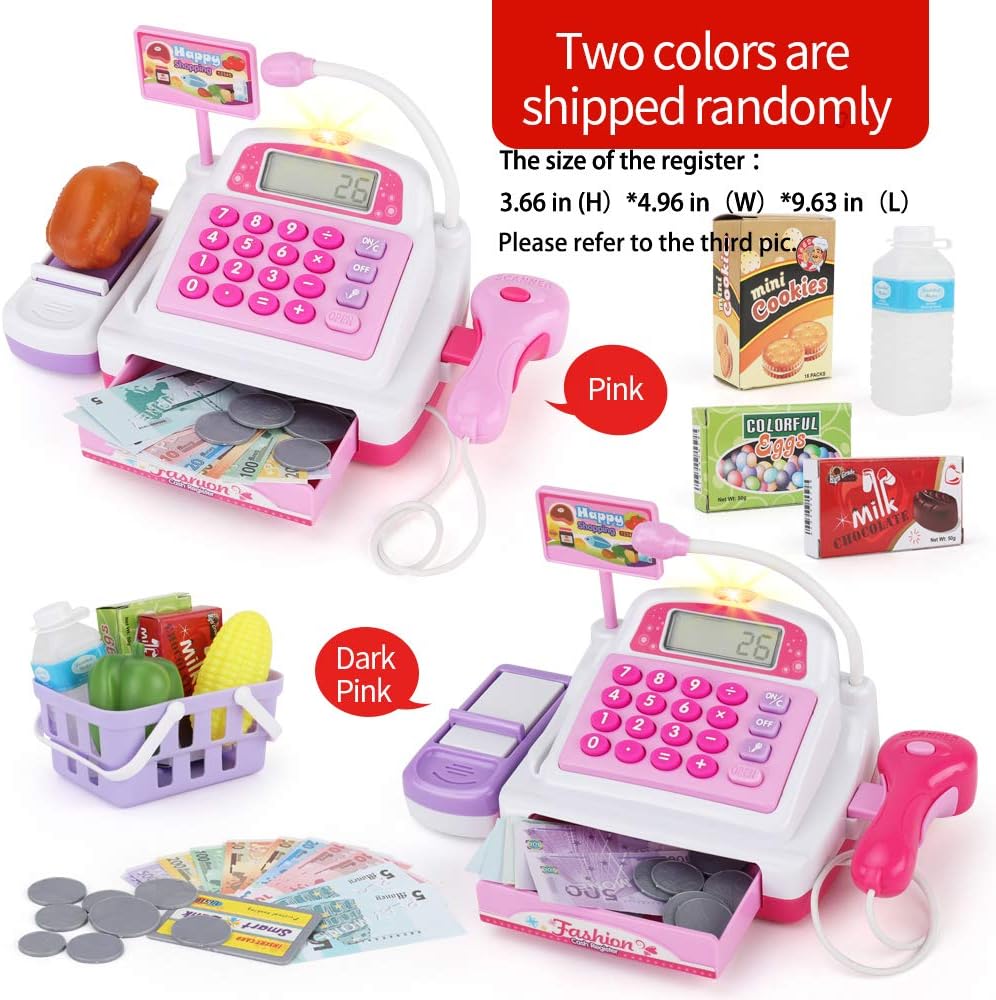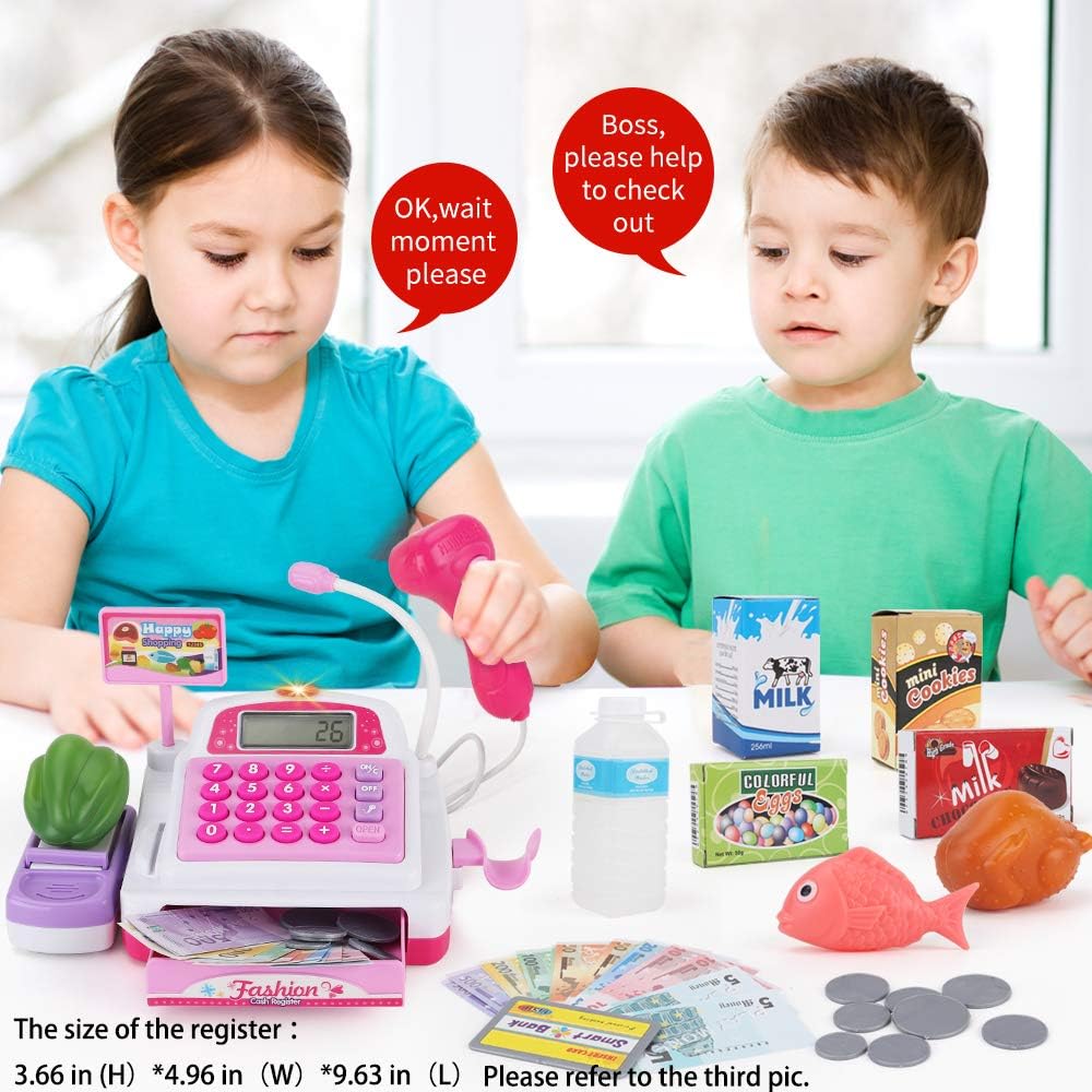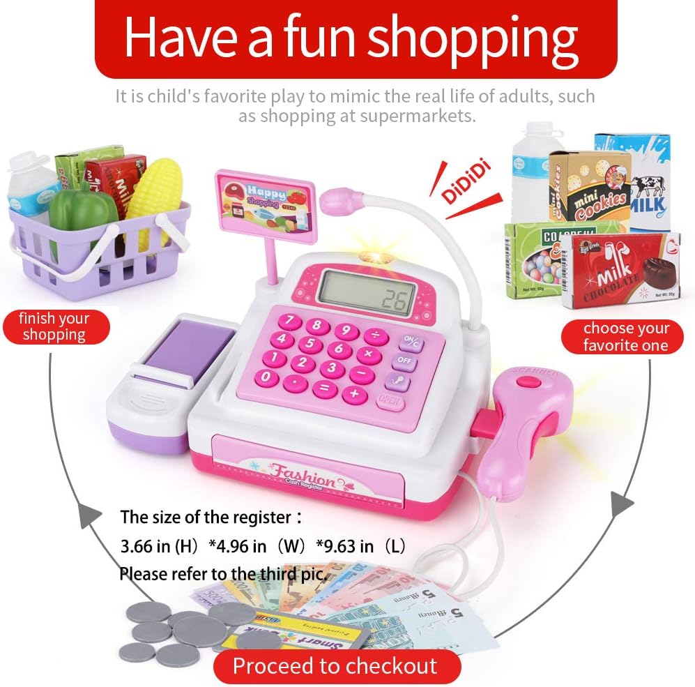 Gioco di ruolo del registratore di cassa da 34 pezzi: 1 registratore di cassa con scanner e nastro trasportatore, 9 giocattoli della spesa, 14 contanti, 8 monete, 1 carta di credito, 1 cestino. La cassa del negozio è dotata anche di una carta di credito da gioco strisciabile. I soldi e le monete in euro sono realistici e insegneranno ai tuoi figli come conoscere i soldi. Suoni e aperture reali: il cassetto contanti e lo scanner emettono un suono "DiDi" quando si aprono e si cliccano sui pulsanti, proprio come un vero registratore di cassa. Il suono realistico può stimolare i bambini a giocare e imparare. Sicurezza e controllo qualità: il design rotondo è realizzato con materiali sicuri ed ecologici, garantendo la massima sicurezza per i tuoi bambini Impara divertendoti: Sotodik finge di giocare ai giocattoli del registratore di cassa del supermercato e incoraggia i bambini ad apprendere le abilità matematiche e monetarie di base con questo vero registratore di cassa funzionante. Dimensioni del checkout del negozio di giochi di ruolo: è di dimensioni generose per bambini dai 3 anni in su. La dimensione è di ca. 25 * 14 * 12 cm/9,8 * 5,5 * 4,7 pollici. Speriamo che sia la dimensione dell'idea per le vostre aspettative.