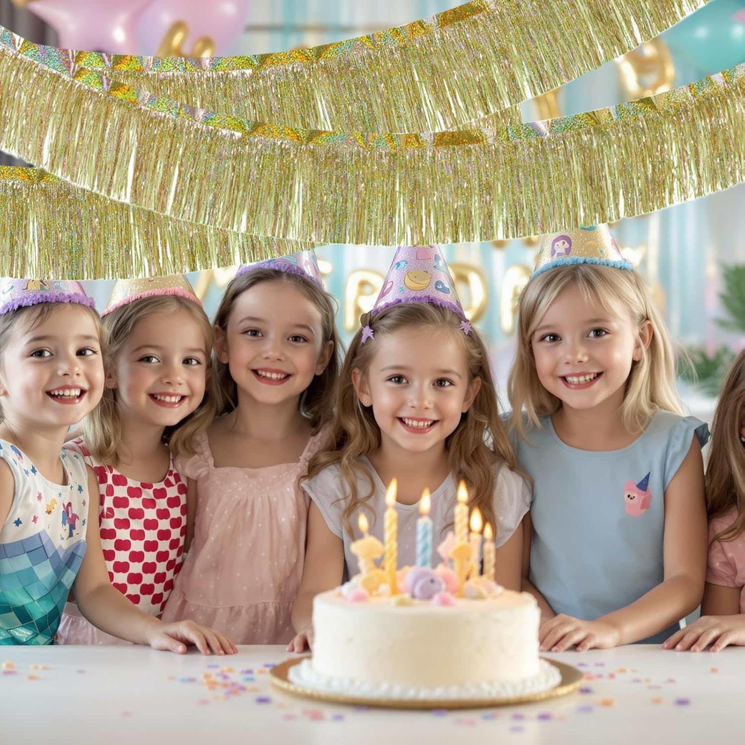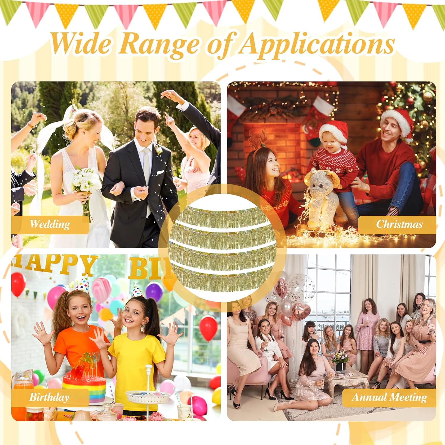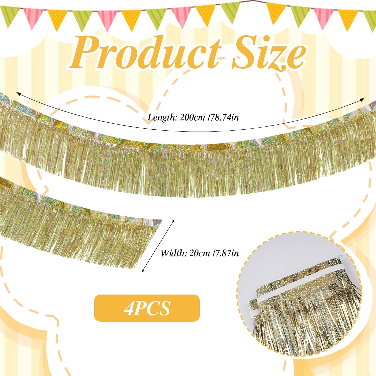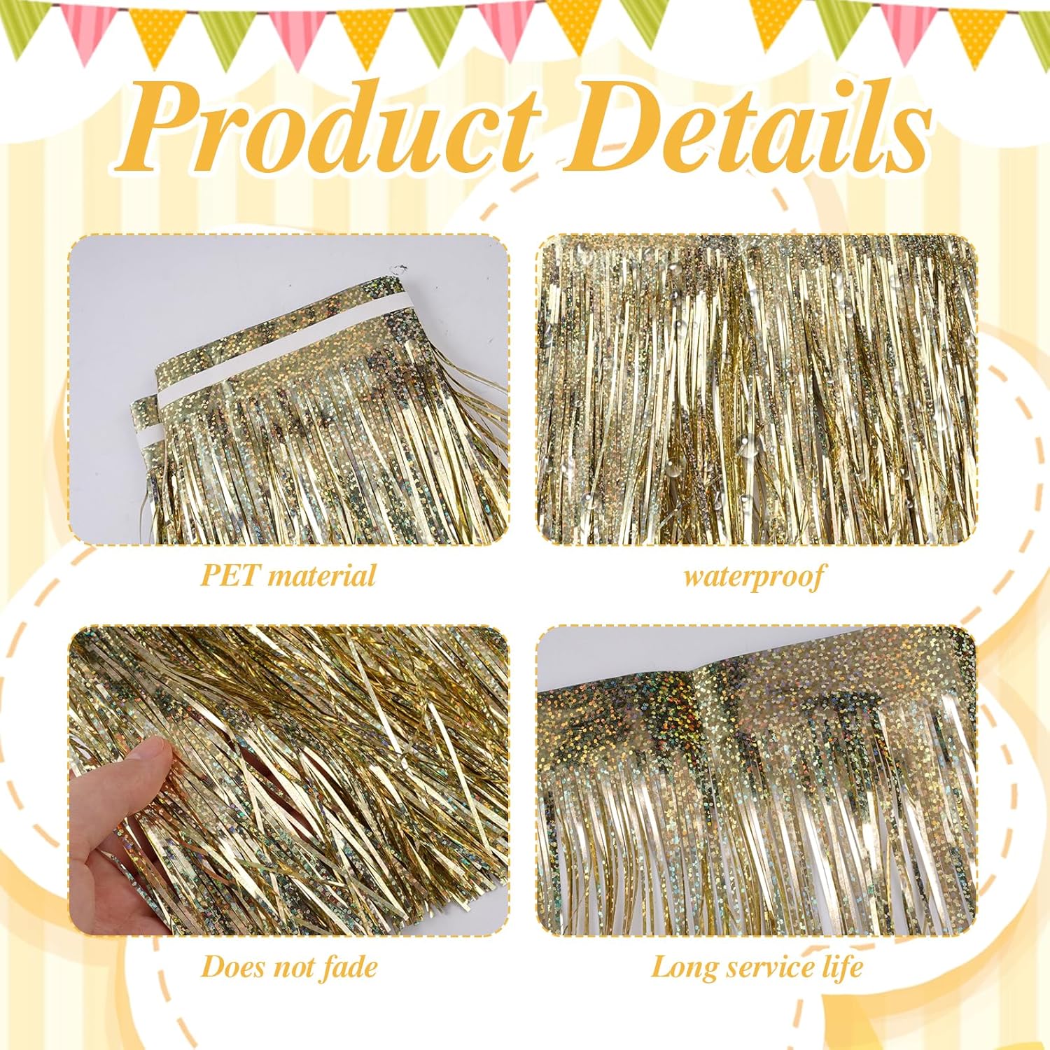 MATERIALE LUCENTE: La tenda in orpelli dorati è realizzata in materiale PET impermeabile ed ecologico, la superficie laser in metallo rifrange la luce colorata, è leggera e non sbiadisce. La tenda di compleanno glitterata mostrerà un effetto di luce arcobaleno che scorre sotto il vento o la luce, la foto viene fornita con un effetto filtro. CREA UN'ATMOSFERA: La ghirlanda di orpelli ha una lucentezza brillante, può facilmente illuminare la festa e aiutare a ravvivare l'atmosfera; L'atmosfera e lo scenario creati dalla ghirlanda di frange di orpelli ti stupiranno e possono anche essere usati come decorazione per la festa. FACILE DA USARE: La decorazione di compleanno delle tende con frange in lamina di orpello ha una striscia adesiva sul retro, basta staccare il nastro e appenderlo al muro, alla porta o ovunque tu voglia rallegrare la festa; Puoi raddoppiarli per ottenere un effetto maggiore IL PACCHETTO INCLUSO: Riceverai 4 pezzi di ghirlanda di frange in lamina metallica, ciascuna larga 20 cm * lunga 2 metri, le strisce sottili delle nappe sono drappeggiate, tagliabili, puoi regolare la lunghezza in base alle tue esigenze, l'orpello può essere riutilizzato! AMPIA GAMMA DI UTILIZZI: La ghirlanda di nappe metalliche con frange in lamina è perfetta per carnevali, feste di compleanno, decorazioni per auto, sfilate di carri allegorici, Natale, cene, battesimi di bambini, matrimoni, lauree, Halloween, ecc.
