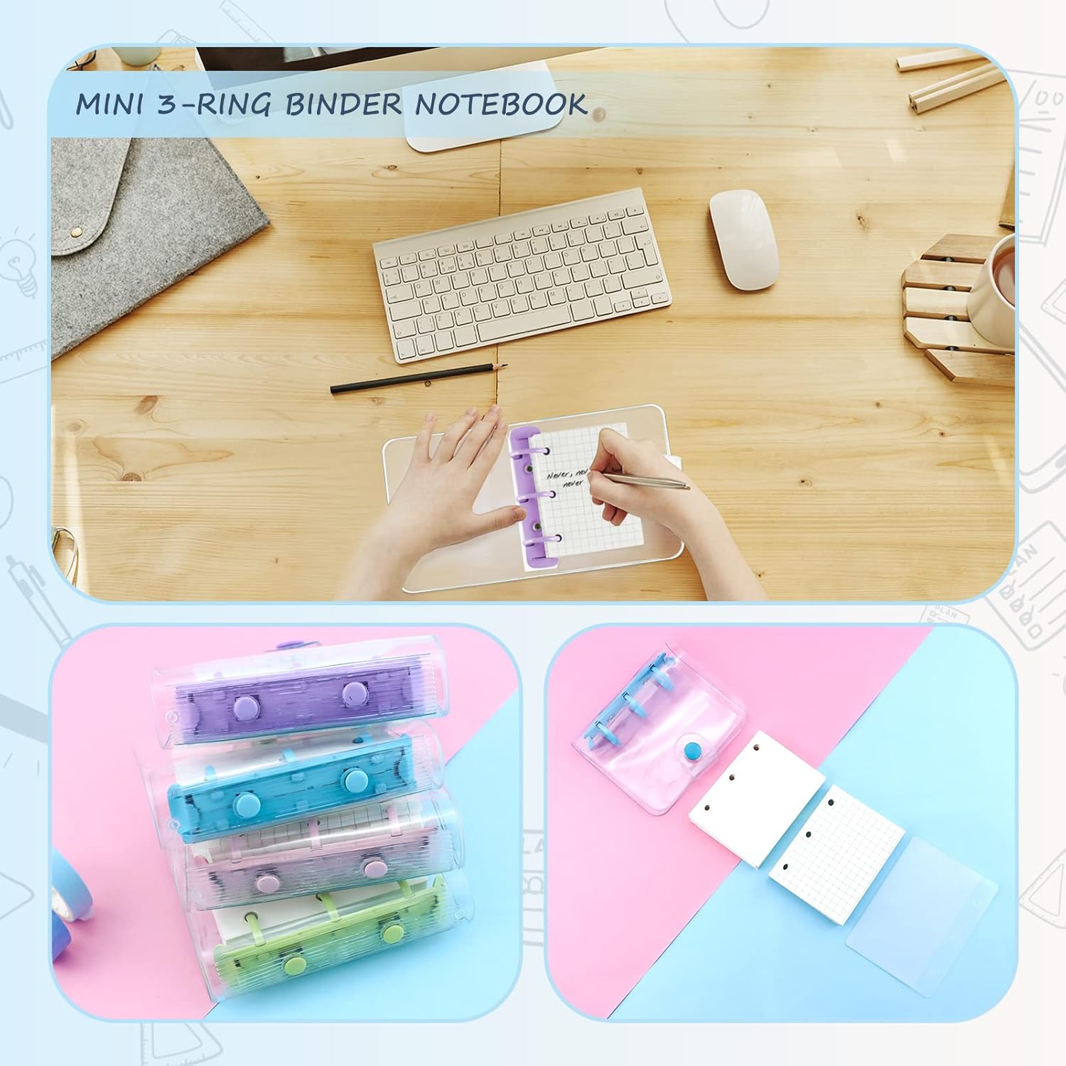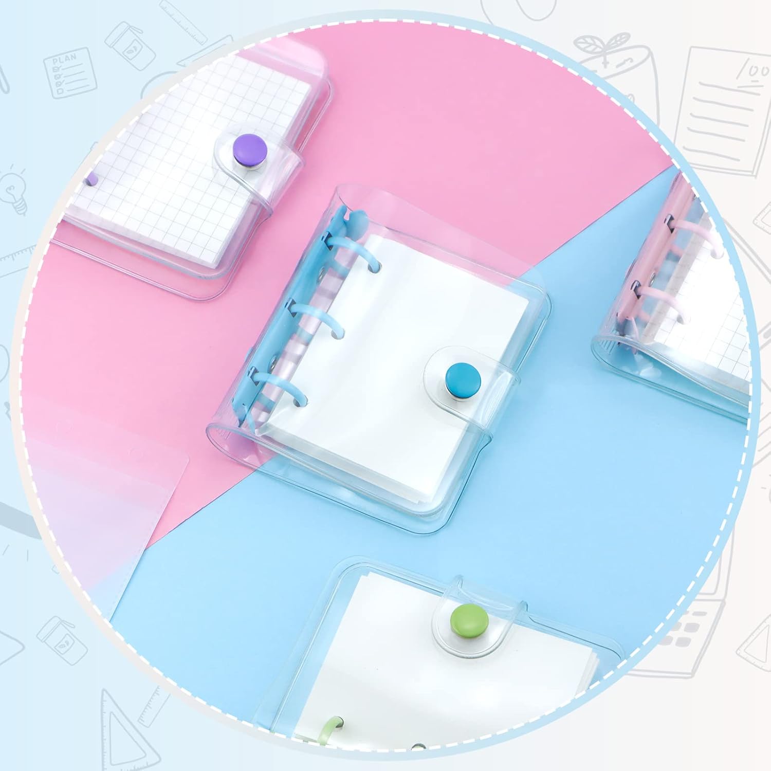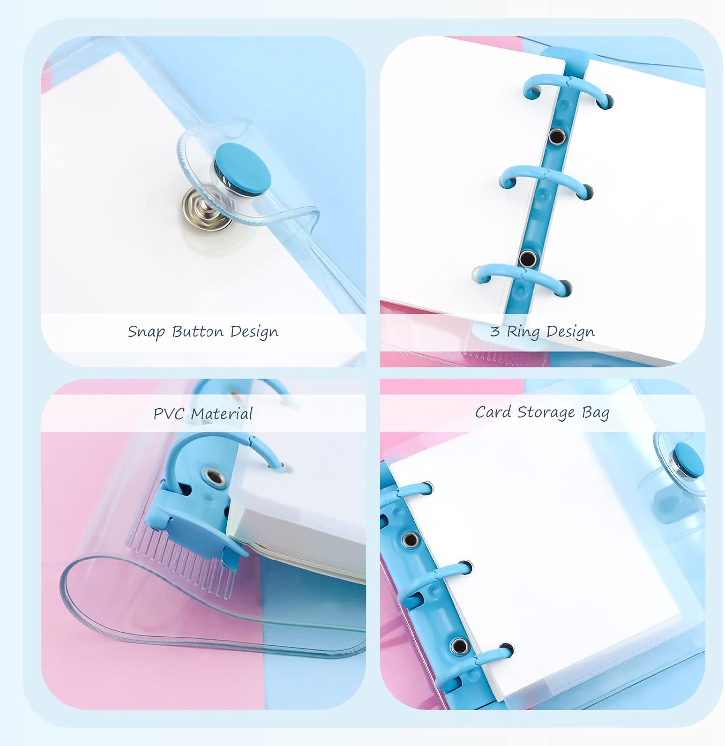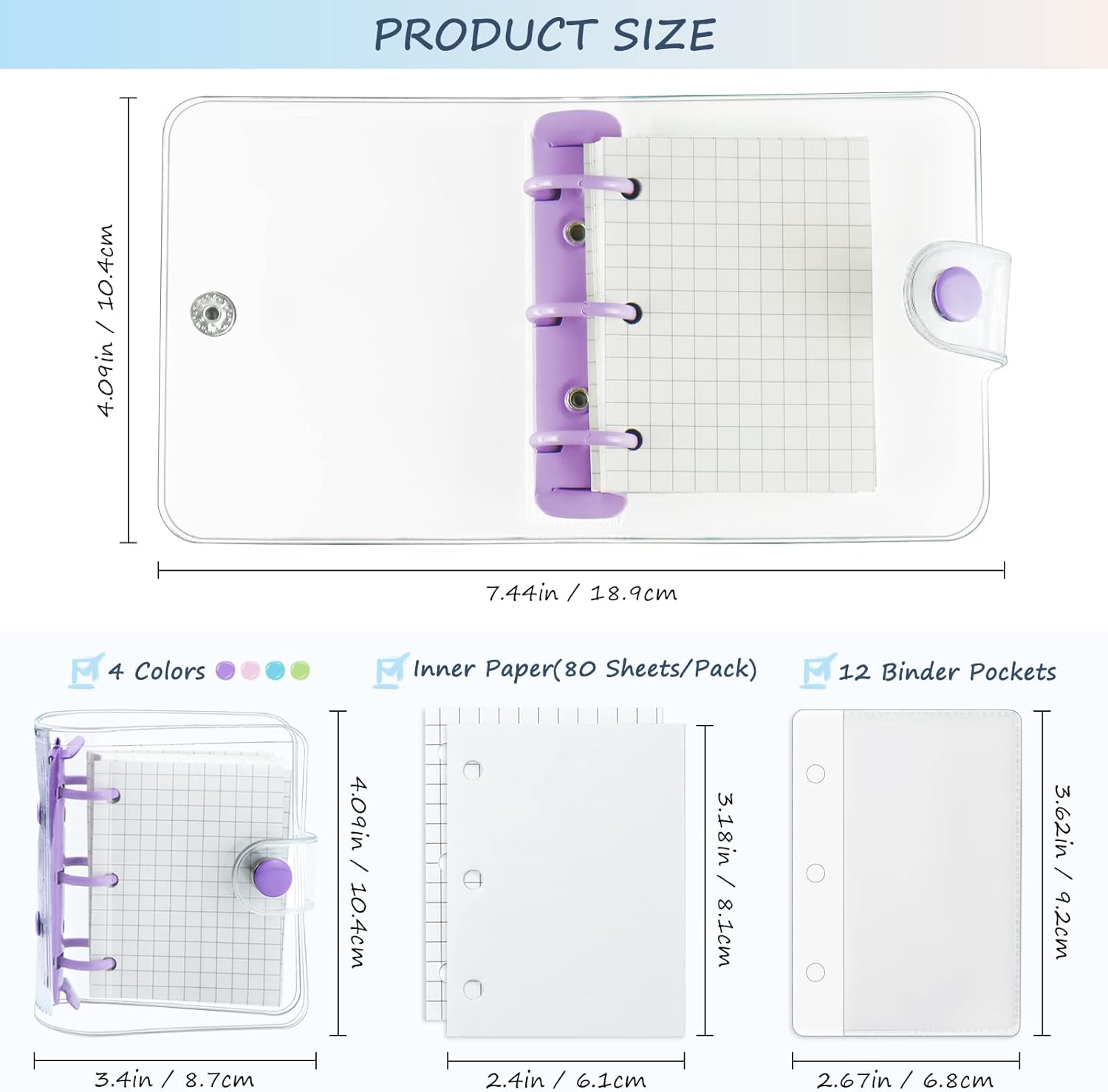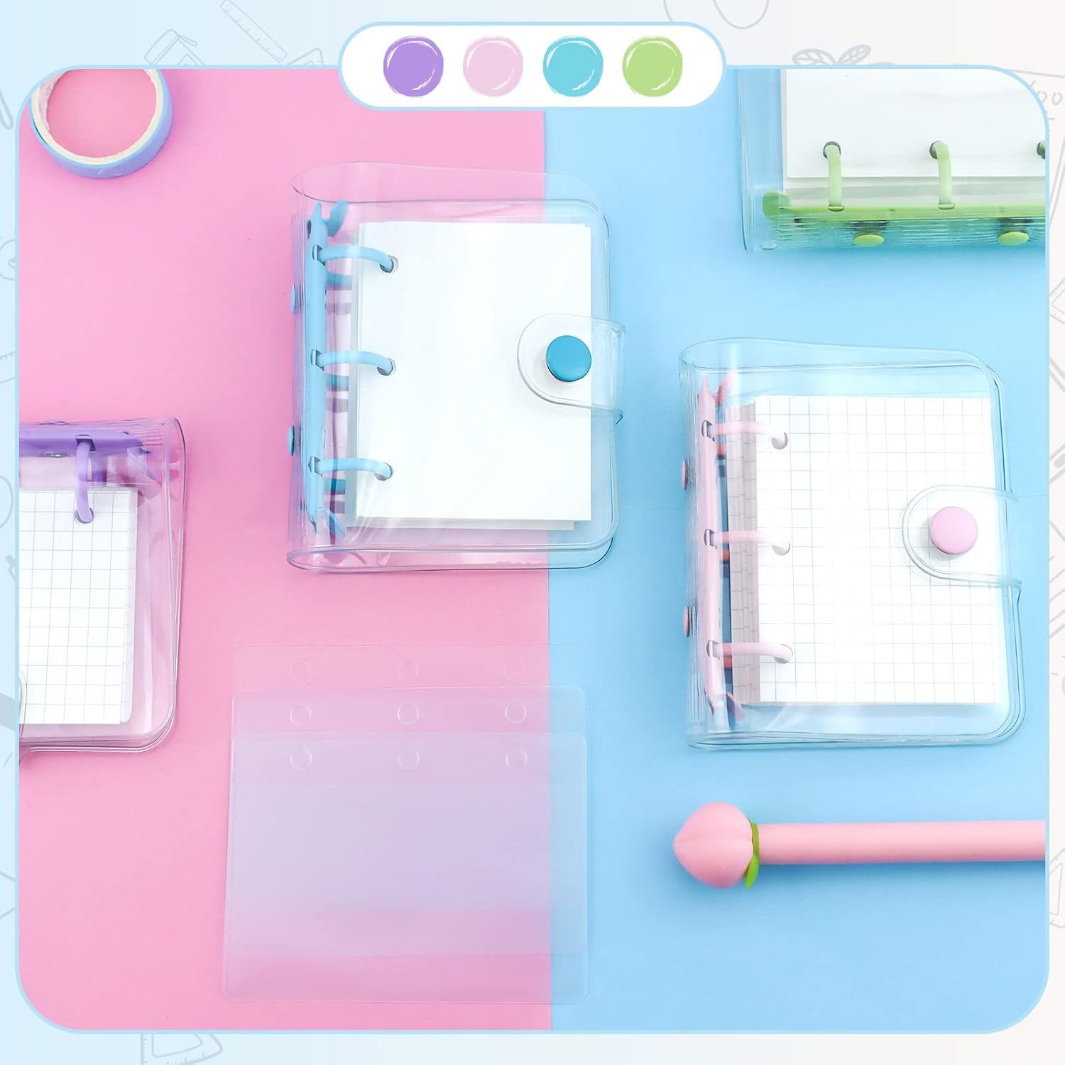 Quantità abbondante: la confezione include 4 mini raccoglitori a 3 anelli in rosa, viola, verde e blu, ognuno viene fornito con 80 fogli di carta interna vuota a foglia larga, accoppiati con 12 tasche trasparenti per raccoglitore; quantità sufficienti possono soddisfare le tue esigenze quotidiane e puoi condividerle con amici o familiari. Design a 3 anelli: questi raccoglitori sono progettati in un robusto raccoglitore circolare a 3 anelli in metallo che non solo può impedire alla carta di cadere, ma consente anche di aggiungere o rimuovere in modo flessibile le pagine interne per la tua comodità. Sono molto pratici e possono servirti a lungo. Affidabile da usare: questo tipo di mini tasca per raccoglitore è realizzato in PVC, con un raccoglitore ad anelli in metallo, inodore e leggero, non facile da rompere o deformare, e la carta interna adotta materiale di carta di buona qualità, non facile da penetrare nell'inchiostro, in grado di servire a lungo. Piccolo e portatile: la dimensione del piccolo raccoglitore è di circa 18,9 x 10,4 cm, piccolo e portatile, proprio in tasca, puoi portarlo con te sia che tu vada a lezione o uscire. La pagina interna è di 8,1 x 6,1 cm, abbastanza spazio per registrare note. Regalo delicato: progettato con un bottone a pressione, il mini diario per scrapbooking è semplice da chiudere e aprire, protegge bene le tue informazioni da fuoriuscite; è anche una bella scelta regalo per amici, bambini, studenti in vacanza, compleanno, festa dei bambini e così via.