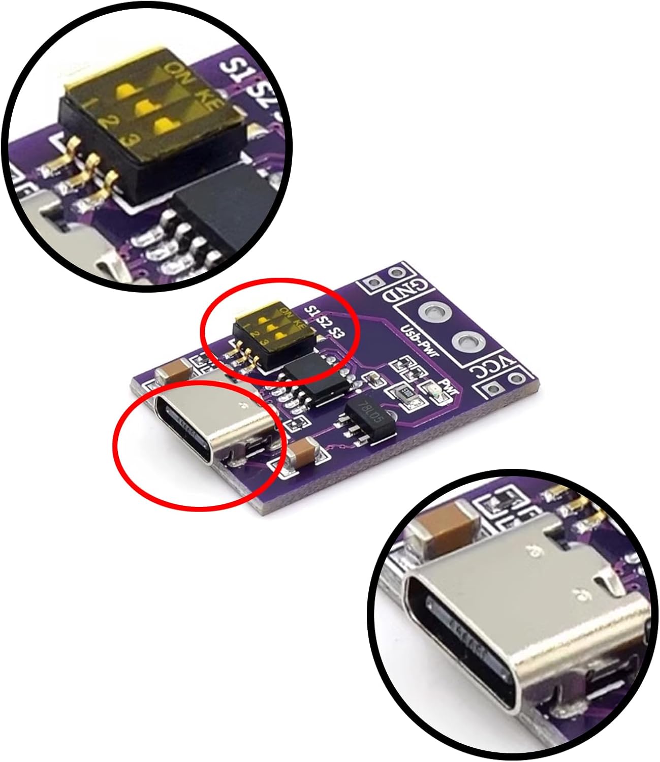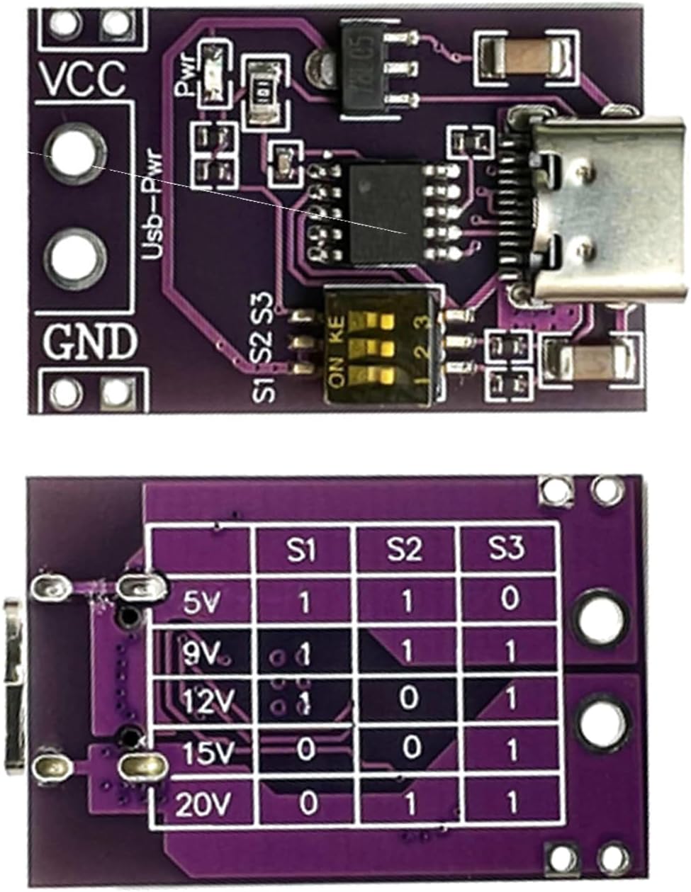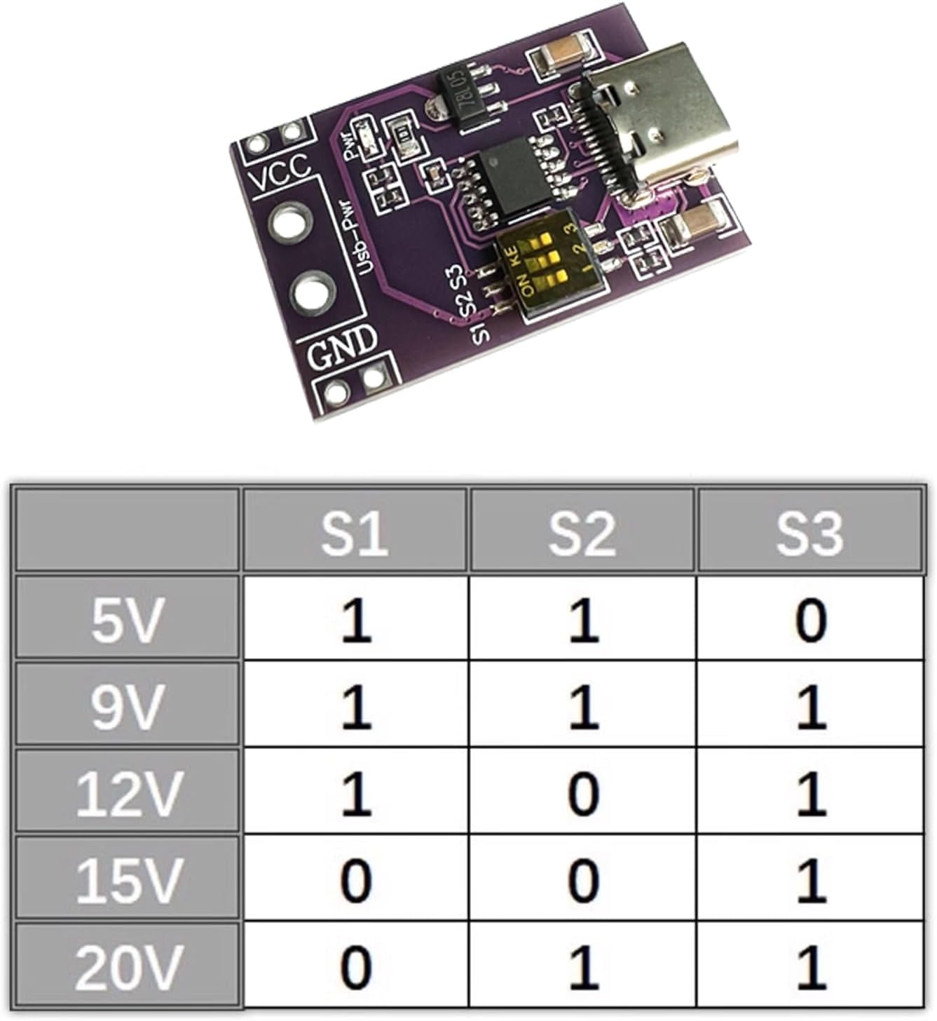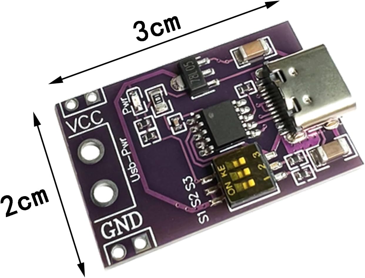 Questo modulo ha prestazioni stabili e pregevole fattura. Questa scheda è responsabile solo di indicare all'alimentatore quanta tensione è necessaria in uscita e il modulo non ha la funzione di determinare la tensione effettiva. Metodo di regolazione della tensione: regolare il DIP switch in base alla tabella sul retro della scheda per controllare la tensione in uscita. Sicuro e affidabile. (Poiché non viene visualizzata la tensione dopo aver impostato l'interruttore DIP, si consiglia di misurare la tensione con un multimetro prima di collegarsi al circuito dell'applicazione). Installazione semplice: se il DIP switch non è impostato secondo la tabella, il modulo emetterà una delle tensioni sopra indicate. prestazione stabile. Installazione semplice. L'entità della corrente: la scheda è responsabile dell'induzione della tensione e la corrente non deve superare la tensione che l'interfaccia USB può sopportare. La corrente di uscita delle spine e delle prese di tipo C è 5 A. Quando vengono utilizzate le porte USB-A, la corrente di resistenza è generalmente di 3 A. Quindi non supera questa corrente. Non ci saranno problemi. Dimensione attuale. È determinato dall'alimentazione e dal carico. La scheda è responsabile solo dell'induzione della tensione. Attenzione: la scheda è responsabile solo di indicare all'alimentatore quanta tensione è necessaria in uscita e il modulo non ha la funzione di determinare la tensione effettiva. Ciò è influenzato da fattori quali la precisione della tensione e la corrente dell'alimentatore stesso. Poiché dopo l'impostazione dei dip switch non viene visualizzata la tensione, si consiglia di misurare la tensione con un multimetro prima di collegarsi al circuito dell'applicazione. Se il dip switch non è impostato secondo la tabella, il modulo emetterà una delle tensioni sopra indicate.