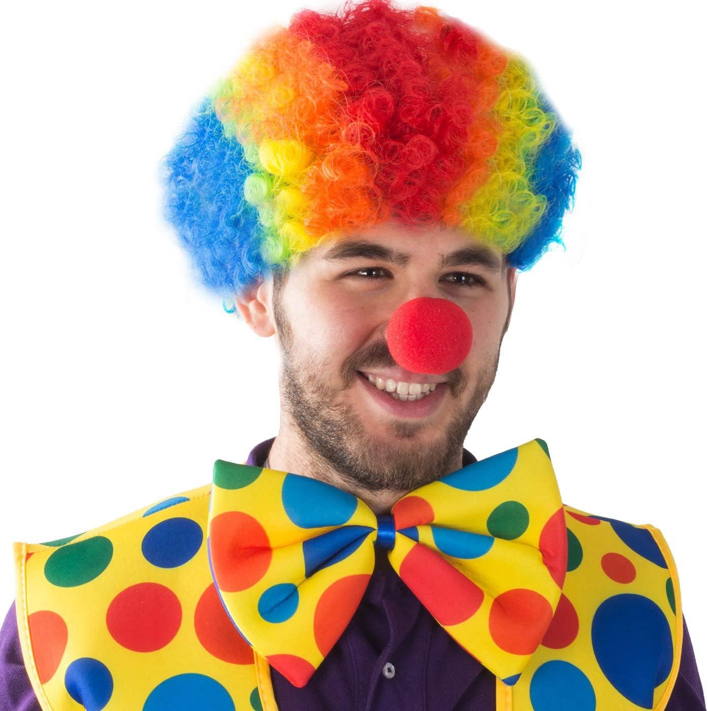 Taglia: taglia . Unisex, circonferenza della testa della parrucca fino a 25 pollici, regolazione per testa maschile e femminile. Design da clown: la parrucca con capelli ricci, buffo naso rosso e gilet da clown a pois è molto vicina al clown che abbiamo in mente. Materiale: questo set di oggetti di scena per clown è fatto di stoffa. Morbido e traspirante, da indossare, leggero e resistente, può essere indossato a lungo. APPLICAZIONI: questo set da clown è perfetto per parchi a tema, feste di compleanno, sportivi e festival come Halloween, carnevale, Natale, cosplay, travestimenti, spettacoli teatrali, feste in e altro ancora.