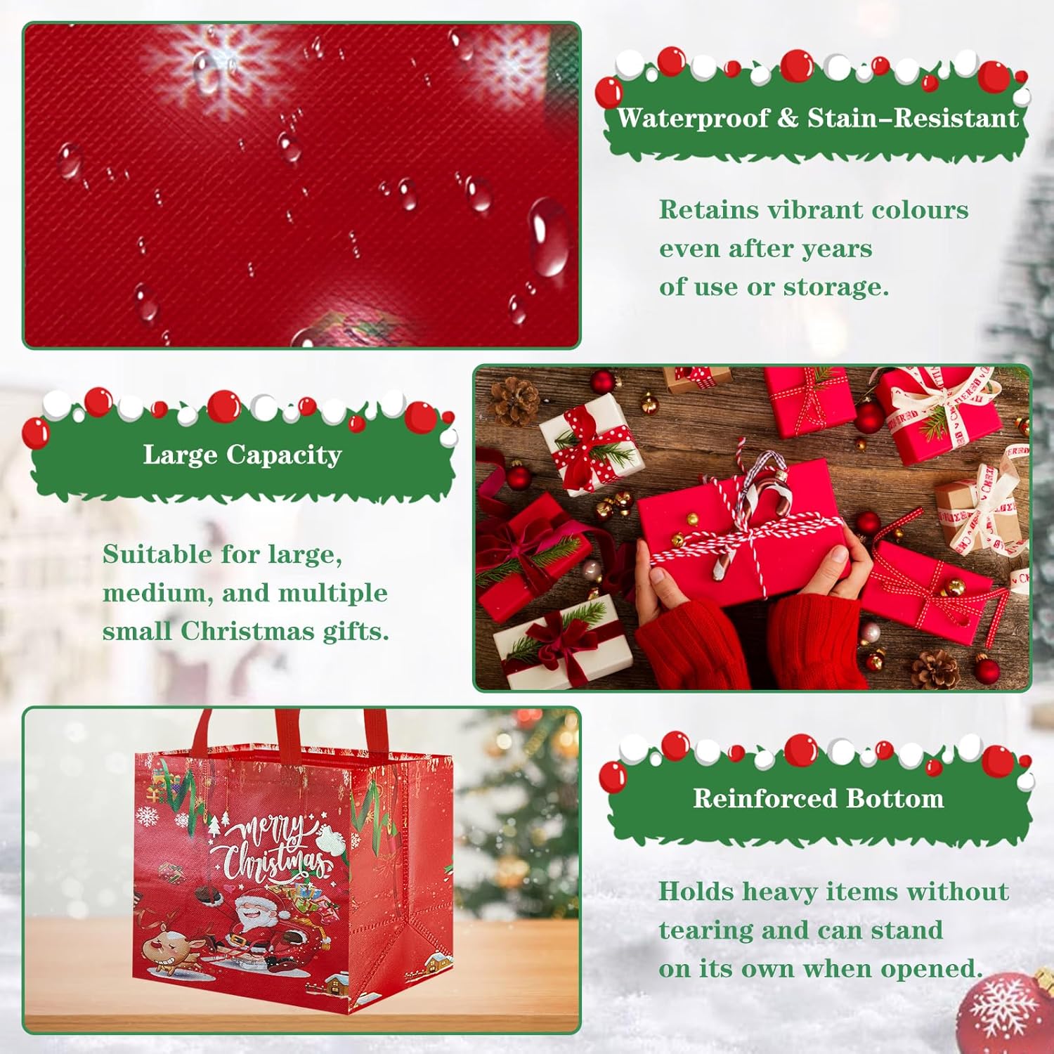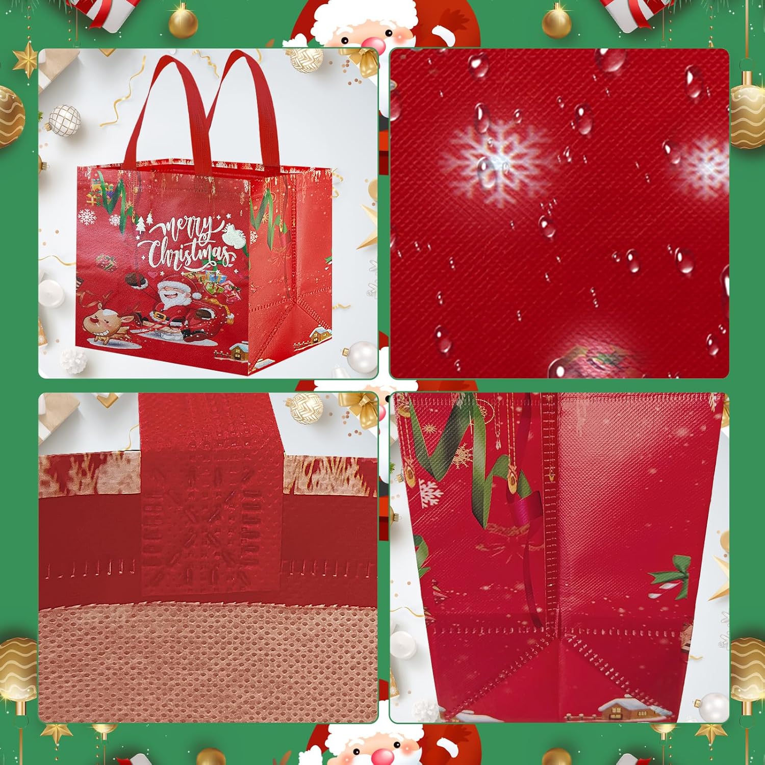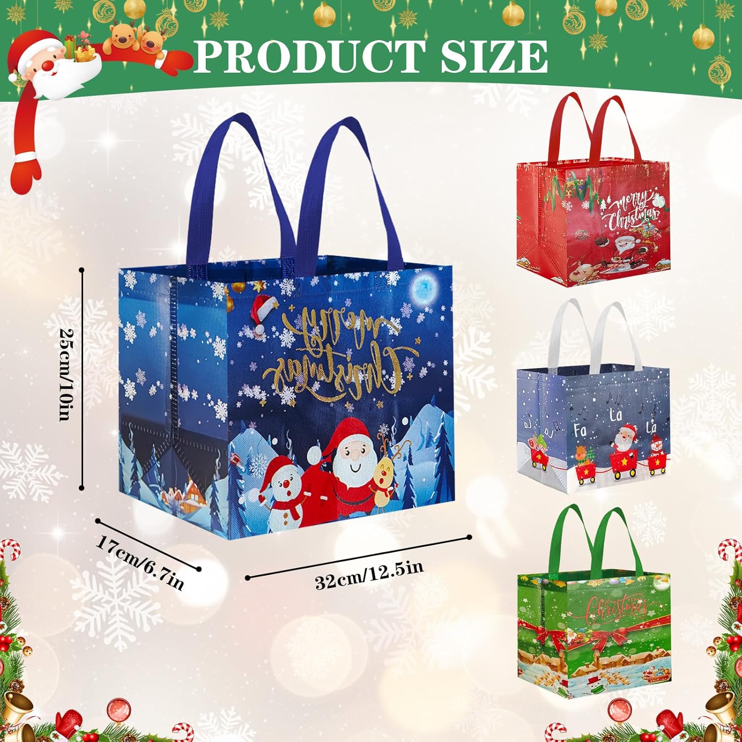 Sacchetti regalo di Natale riutilizzabili: i sacchetti regalo di Natale in tessuto non tessuto sono più resistenti e hanno una capacità di carico maggiore rispetto ai sacchetti di carta. La loro superficie è ricoperta da una pellicola sottile, che non solo li rende impermeabili e repellenti allo sporco, ma garantisce anche che mantengano i loro colori vivaci anche dopo anni di utilizzo o conservazione. Sono riutilizzabili. Sacchetti regalo di Natale ideali di medie dimensioni: riceverai 4 sacchetti regalo di Natale che misurano 25*32*17 cm (dimensioni senza manici). Questi sacchetti non sono adatti solo per confezionare vari regali di Natale medi e piccoli, ma anche per contenere caramelle, biscotti, cioccolata, cartoline, piccoli giocattoli e altri oggetti. Con il loro design classico, sono adatti sia per regali che per feste. Eccellente capacità di carico: le nostre borse per la spesa natalizie sono realizzate in tessuto non tessuto di alta qualità, leggero e resistente allo stesso tempo. Le connessioni sui manici e sul fondo dei sacchetti regalo sono rinforzate per ridurre il rischio di strappi, rendendoli più resistenti dei sacchetti di carta e più rispettosi dell'ambiente rispetto ai sacchetti di plastica. VARI DISEGNI ACCATTIVANTI: I sacchetti regalo di Natale sono progettati con 4 diversi design natalizi che includono elementi natalizi comuni come Babbo Natale, renne, cedri, fiocchi di neve, pupazzi di neve e campanelle. Non sono solo sacchetti regalo ideali ma anche decorazioni accattivanti per le feste di Natale. Una scelta ideale per confezionare regali durante le vacanze di Natale: queste borse per le feste di Natale sono perfette per confezionare regali della maggior parte delle dimensioni. Puoi usarli per feste di Natale, regali di festa, confezioni regalo di Natale, decorazioni natalizie o confezioni regalo di bottiglie di vino per regalare i tuoi regali di Natale ad amici, familiari e colleghi in una forma più elegante.