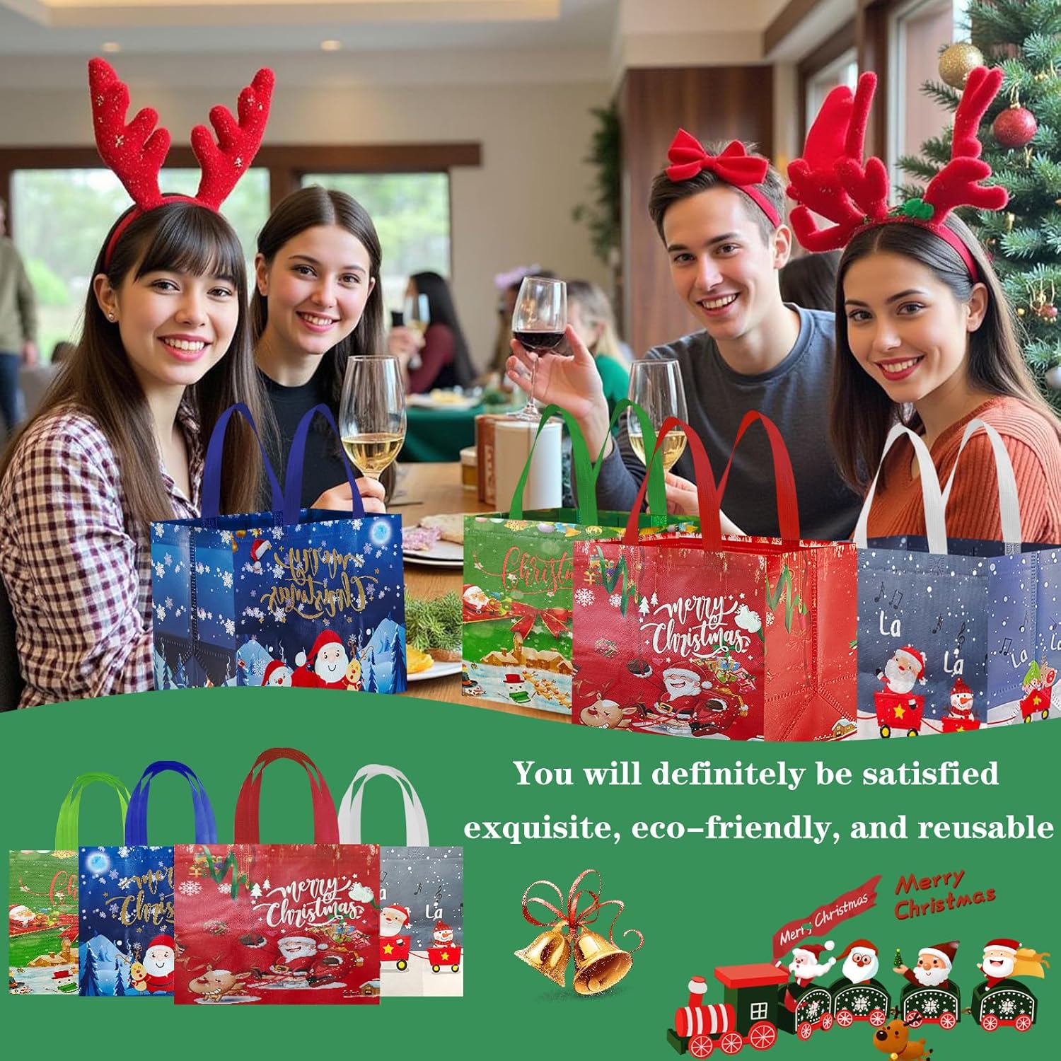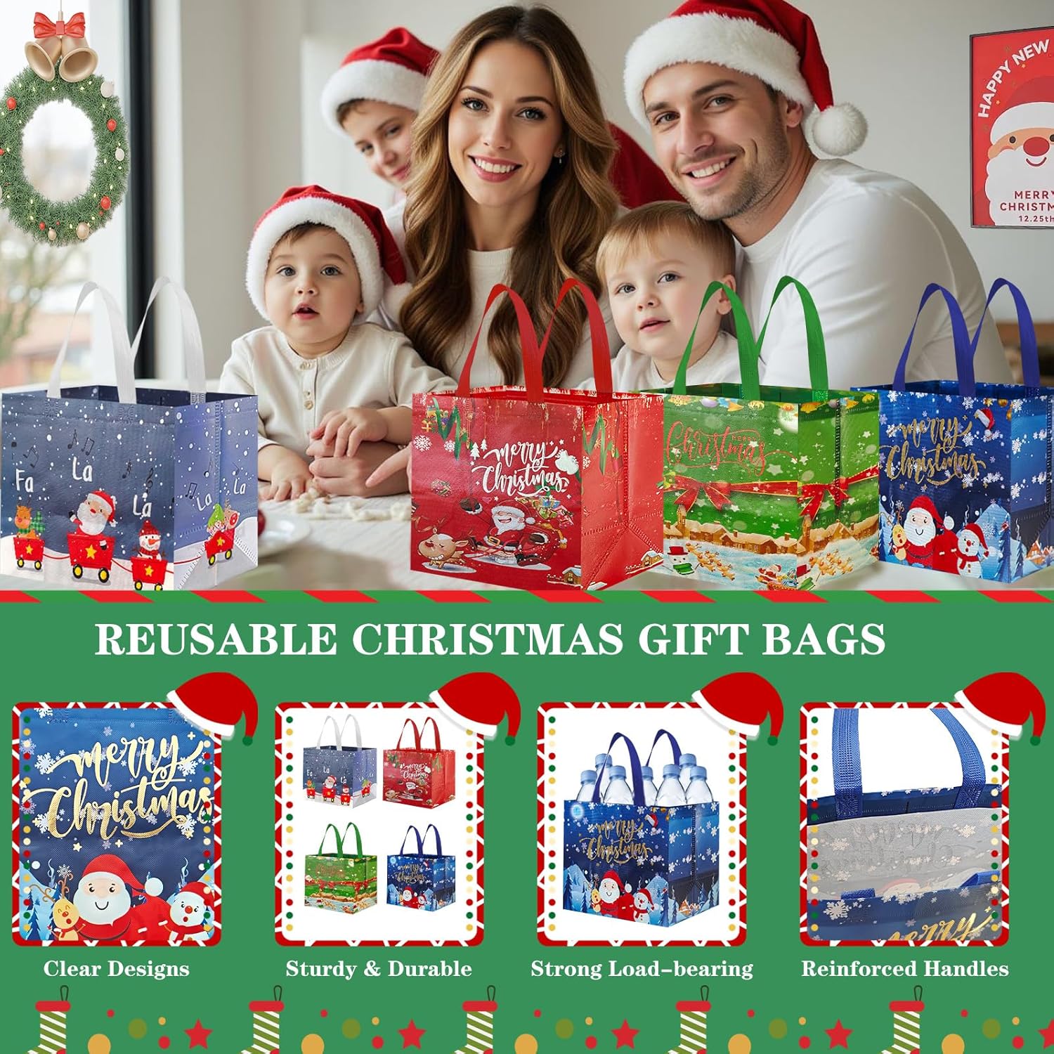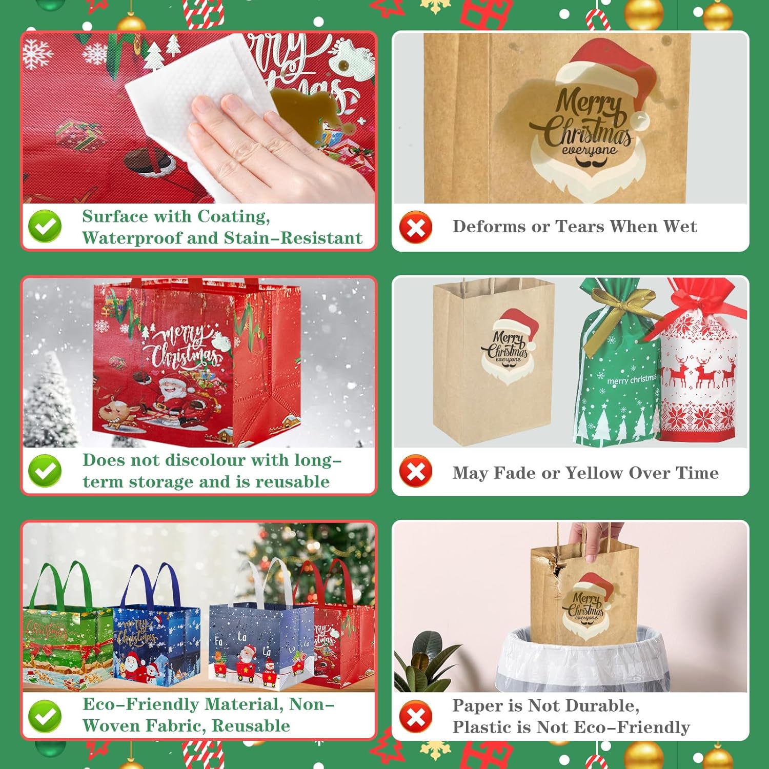 Sacchetti regalo di Natale riutilizzabili: i sacchetti regalo di Natale in tessuto non tessuto sono più resistenti e hanno una capacità di carico maggiore rispetto ai sacchetti di carta. La loro superficie è ricoperta da una pellicola sottile, che non solo li rende impermeabili e repellenti allo sporco, ma garantisce anche che mantengano i loro colori vivaci anche dopo anni di utilizzo o conservazione. Sono riutilizzabili. Sacchetti regalo di Natale ideali di medie dimensioni: riceverai 4 sacchetti regalo di Natale che misurano 25*32*17 cm (dimensioni senza manici). Questi sacchetti non sono adatti solo per confezionare vari regali di Natale medi e piccoli, ma anche per contenere caramelle, biscotti, cioccolata, cartoline, piccoli giocattoli e altri oggetti. Con il loro design classico, sono adatti sia per regali che per feste. Eccellente capacità di carico: le nostre borse per la spesa natalizie sono realizzate in tessuto non tessuto di alta qualità, leggero e resistente allo stesso tempo. Le connessioni sui manici e sul fondo dei sacchetti regalo sono rinforzate per ridurre il rischio di strappi, rendendoli più resistenti dei sacchetti di carta e più rispettosi dell'ambiente rispetto ai sacchetti di plastica. VARI DISEGNI ACCATTIVANTI: I sacchetti regalo di Natale sono progettati con 4 diversi design natalizi che includono elementi natalizi comuni come Babbo Natale, renne, cedri, fiocchi di neve, pupazzi di neve e campanelle. Non sono solo sacchetti regalo ideali ma anche decorazioni accattivanti per le feste di Natale. Una scelta ideale per confezionare regali durante le vacanze di Natale: queste borse per le feste di Natale sono perfette per confezionare regali della maggior parte delle dimensioni. Puoi usarli per feste di Natale, regali di festa, confezioni regalo di Natale, decorazioni natalizie o confezioni regalo di bottiglie di vino per regalare i tuoi regali di Natale ad amici, familiari e colleghi in una forma più elegante.