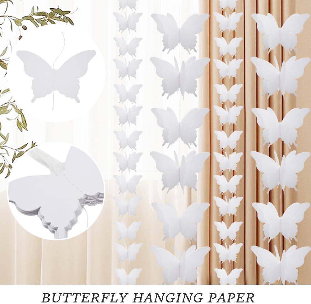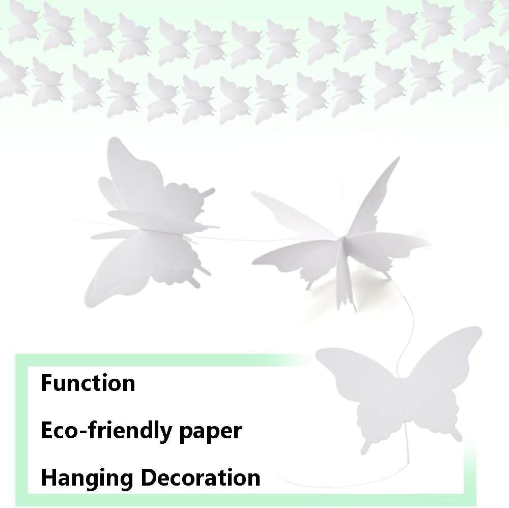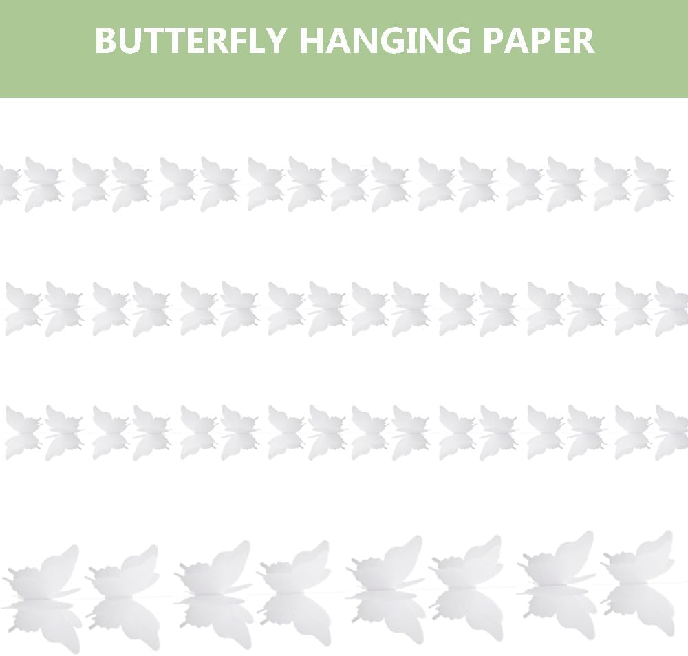 【Alta qualità】 Striscione a farfalla di carta appeso Ghirlanda decorativa a forma di farfalla 3D. 【Materiali】 Lo striscione a farfalla è realizzato con carta colorata di alta qualità in colori vivaci e realistici. 【Dimensioni】 Dimensioni singola farfalla 85x120 mm/3,34x4,7 pollici (LxL), 18 farfalle per banner, lunghezza totale di ciascun banner 2,8 m/110 pollici. 【Confezione】 Quantità: 4 pezzi di striscioni a farfalla; Colore: bianco. Applicazione: lo striscione con farfalla e ghirlanda di carta può essere appeso su rami, soffitti, pareti, corridoi, finestre e altri luoghi come decorazione per compleanni, matrimoni, feste, festival e altre occasioni.