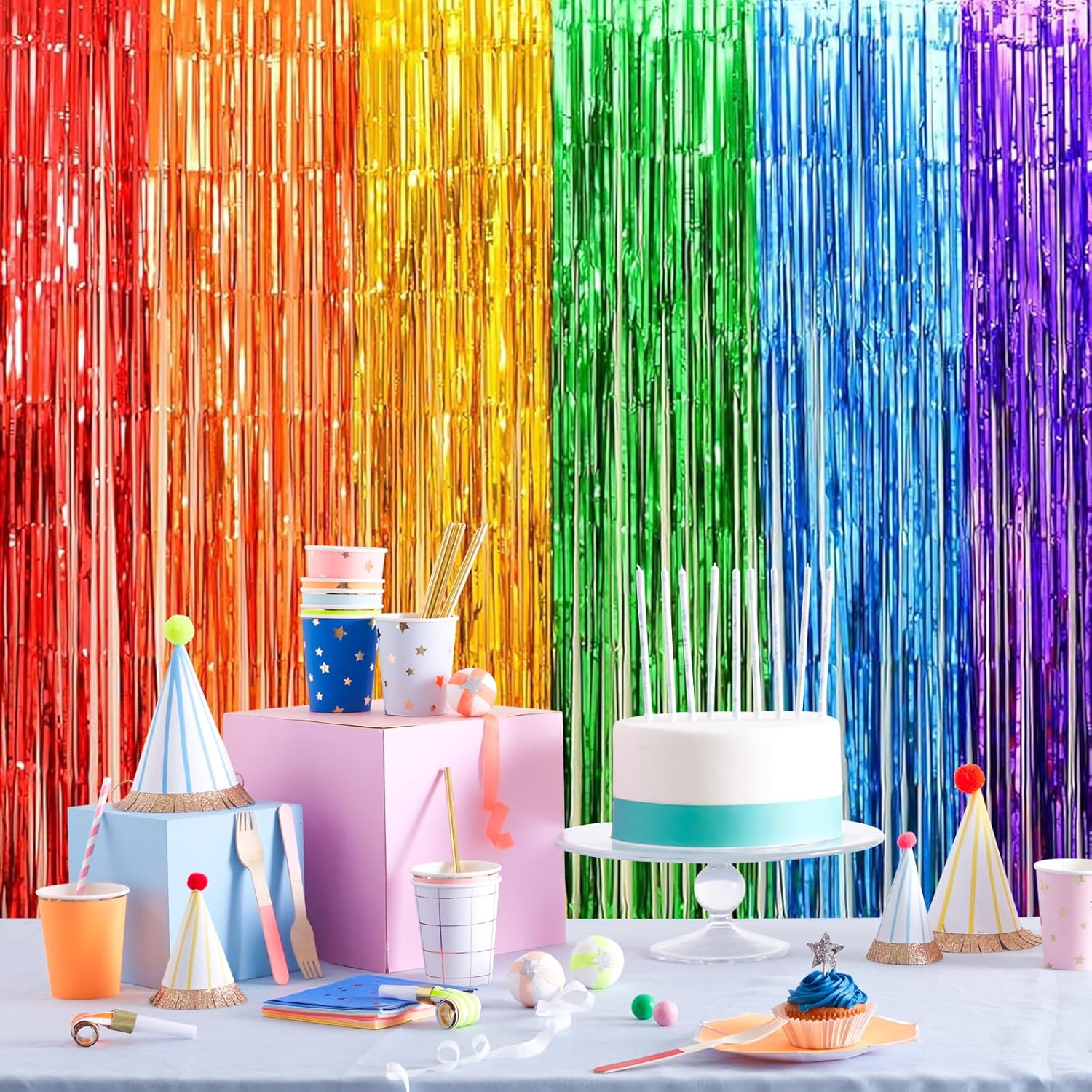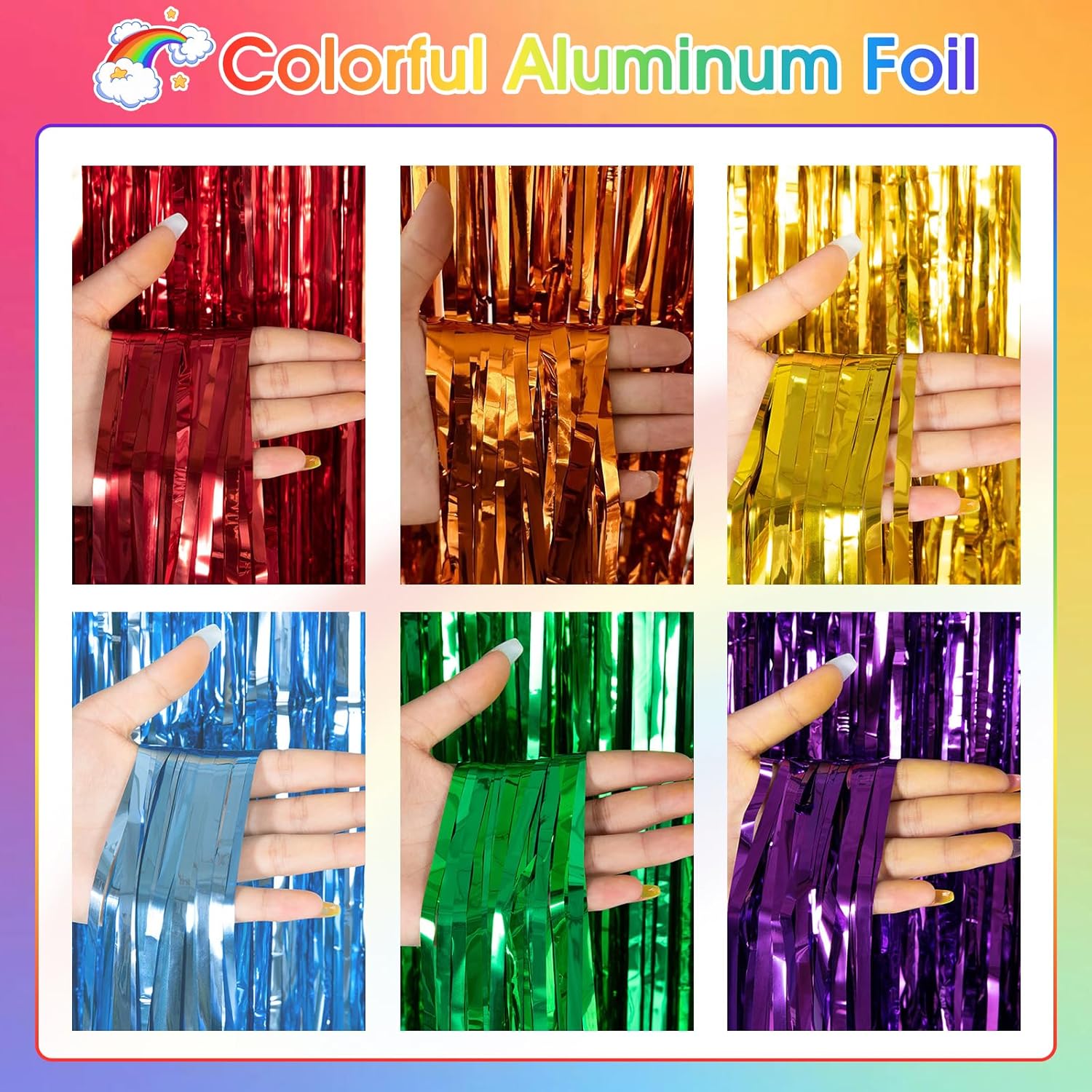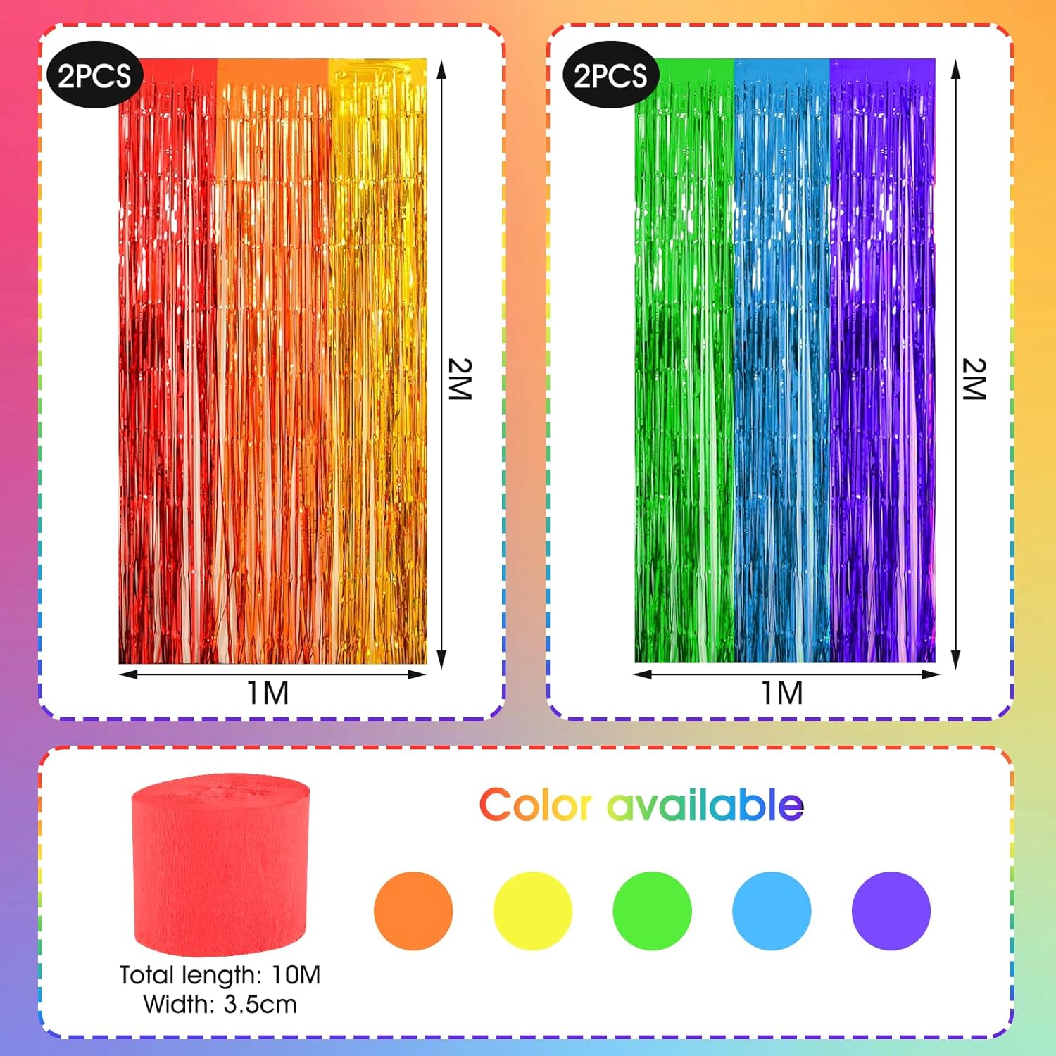 Decorazione per feste da 10 pezzi: il set contiene 4 glitter arcobaleno in plastica nelle dimensioni 1 m x 2 m e 6 nastri per mascheratura arcobaleno nelle dimensioni 3,5 cm x 10 m (un rotolo ciascuno nei colori rosso, arancione, giallo, verde, blu e viola). Materiale sicuro e durevole: la tenda tinsel arcobaleno glitter è realizzata in plastica di alta qualità, sicura e durevole. I colori sono uniformi e non sbiadiscono, mantenendo quindi la loro brillantezza a lungo. I nastri crespi colorati sono realizzati con carta crespa ecologica disponibile in sei colori accattivanti. Facile da installare: basta staccare il nastro adesivo e attaccare queste vivaci tende arcobaleno nella posizione desiderata. Aderisce saldamente e può essere rimosso senza lasciare residui: facile e comodo da usare. Nastri per mascheratura arcobaleno: questi nastri di carta multicolore possono essere piegati, annodati, incollati, appesi e tagliati in qualsiasi forma. Sono ideali per una varietà di lavori artigianali e possono abbellire la tua casa in modo creativo. DECORAZIONE ACCATTIVANTE: queste tende e nastri colorati con glitter metallici sono un'ottima aggiunta alle pareti a tema o agli sfondi delle feste. Brillano sotto le luci delle feste e sono perfetti per decorazioni di carnevale, fondali scenici, fondali fotografici, decorazioni murali per ufficio, feste di compleanno e molto altro ancora. La combinazione di rosso, arancione, giallo, verde, blu e viola ti offre una festa per gli occhi!