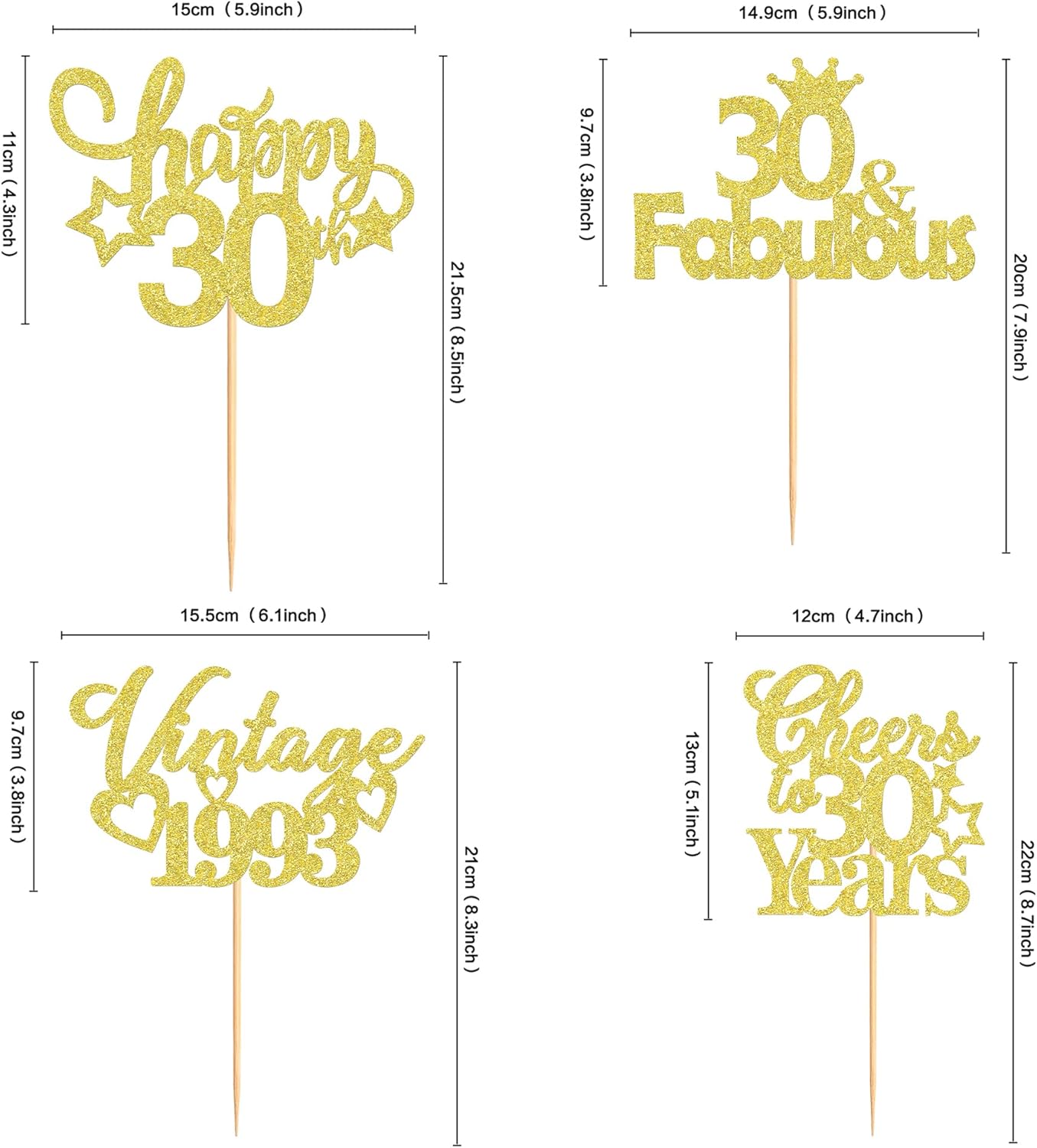 ★ Confezione/dimensioni: 4 pezzi, 16 cm x 19,5 cm / 6,3 pollici x 7,7 pollici (bastone incluso). ★ Materiale: cartoncino da 300 g e penna per stuzzicadenti, non tossico, i colori brillanti non sbiadiscono facilmente, brillano alla luce, facili da usare ★ Progettati per stupire: gli accattivanti toppers per torta glitterati in colore oro lucido, luminosi e vibranti, aggiungono un tono allegro e divertente alla tua festa di compleanno e aggiungono un colore unico alla tua festa del grande giorno. ★ Perfetto per le torte di compleanno: 30 toppers per cupcake sono così carini e perfetti per 30 decorazioni di compleanno a tema, 30 pezzi nuziali, 30 decorazioni per feste di compleanno. Puoi rendere il tuo cupcake più attraente e rendere divertente la tua festa. Puoi anche usarli per gelati, frutta, biscotti e altri dessert. ★ Suggerimenti: design su un solo lato, il retro è bianco solido. Solo a scopo decorativo, non è commestibile e si prega di non utilizzarlo nel forno o nel microonde, ma lasciare prima raffreddare i cupcake.