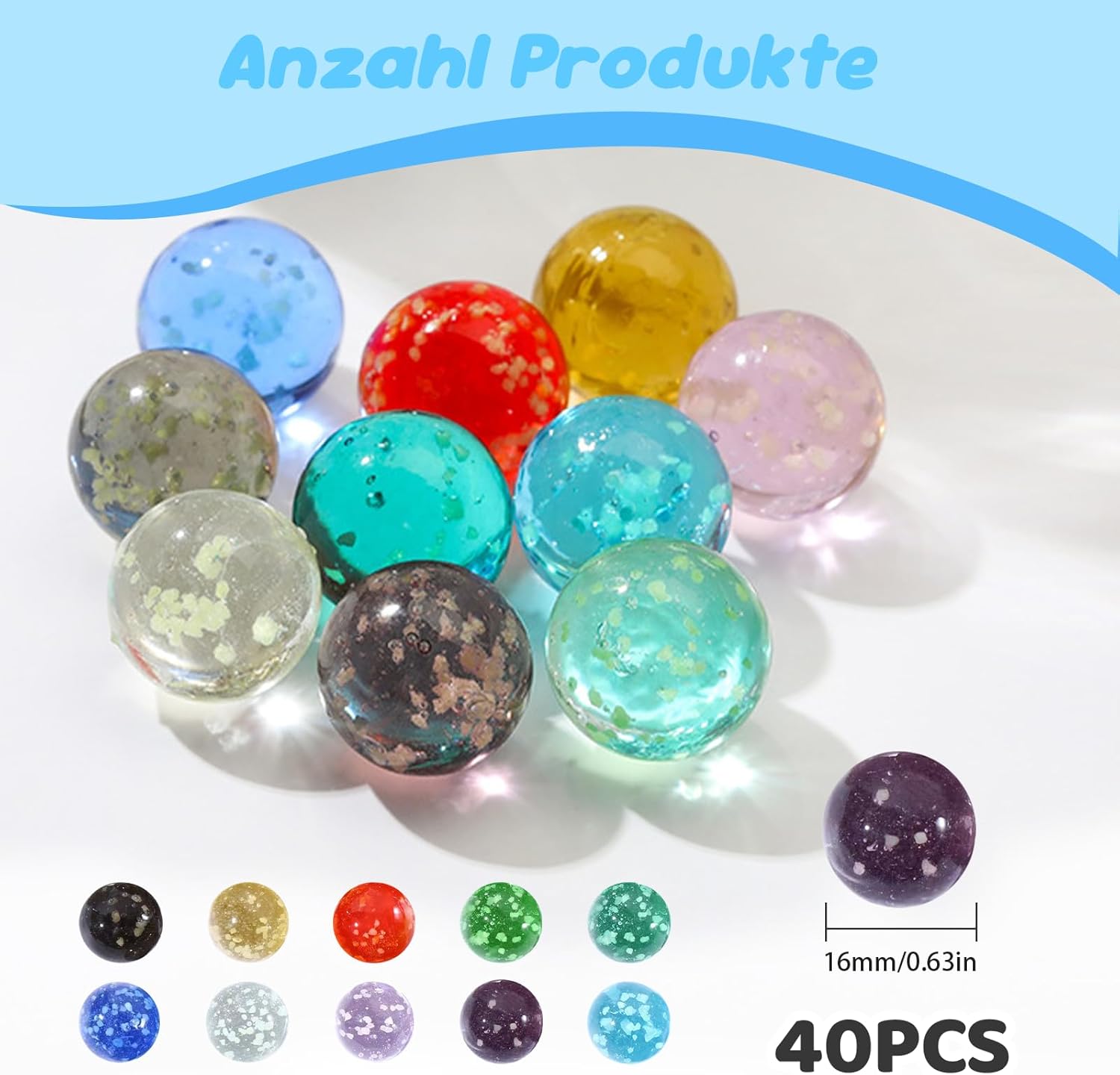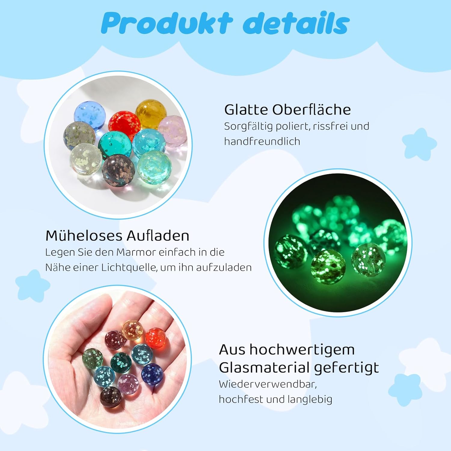 【40 biglie di vetro】 Riceverai 40 biglie di vetro in 10 colori diversi: rosso + trasparente + verde + verde chiaro + viola + azzurro + blu + oro + nero + viola chiaro. La grande quantità e varietà di colori soddisfano le esigenze di gioco dei bambini. 【Alta qualità】 Le nostre biglie di vetro colorate sono realizzate in vetro di alta qualità, che le rende particolarmente durevoli e infrangibili. Mantengono la loro forma anche dopo un uso prolungato e vengono accuratamente levigati e lucidati. La superficie liscia e priva di bave è confortevole e riduce al minimo le rotture quando si gioca all'interno e all'esterno. 【Come si illuminano】Le biglie per bambini possono essere caricate da qualsiasi fonte di luce, ad es. B. dalla luce solare, lampade standard o torce elettriche. Più luce assorbono le biglie di vetro, più brillano di notte. 【Divertimento senza fine】 Queste biglie fosforescenti offrono una varietà di opzioni di gioco: puoi rotolarle, lanciarle o farle rimbalzare, promuovendo senza sforzo la coordinazione occhio-mano e le capacità motorie. Le biglie di vetro colorate servono anche come giocattoli per il legame genitore-figlio e accompagnano la crescita del bambino. 【Usi versatili】 Queste biglie di vetro sono adatte anche come accessori per la casa: posizionale in vasi o acquari dove il loro bagliore notturno crea un'atmosfera unica. Possono essere utilizzati anche come materiali per il fai da te, ad esempio per modellare con la pasta da modellare o per incorniciarli in album fotografici.