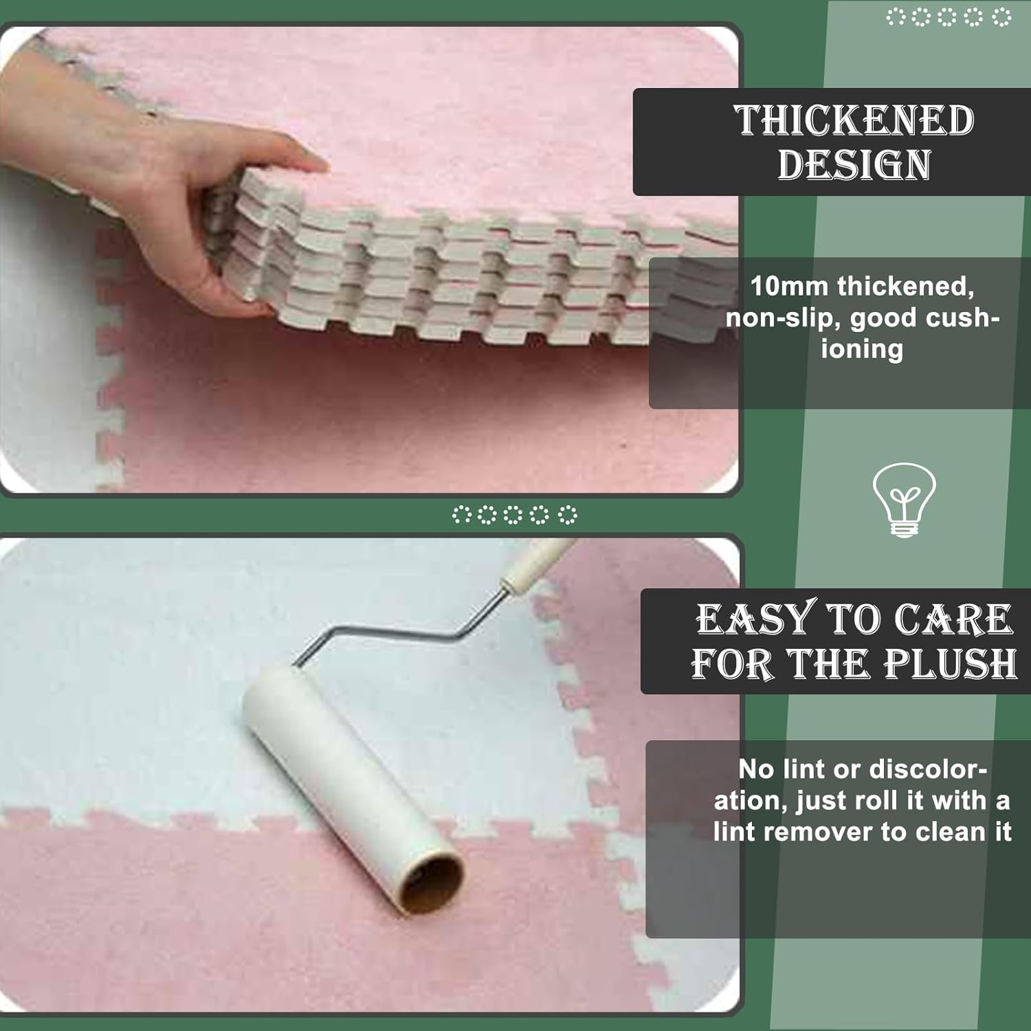【Comfort e durata superiori】 Realizzati con schiuma EVA spessa 0,4"/1 cm e superficie morbida, questi tappeti offrono morbidezza lussuosa mentre resistono alla caduta, garantendo un comfort duraturo nelle aree ad alto traffico. Facile da montare: il suo design leggero e ad incastro consente un'installazione rapida e senza attrezzi. Aggiungi o rimuovi facilmente le piastrelle per adattarle al tuo soggiorno, camera da letto o sala giochi e smontale per riporle Pratico 【Design personalizzabile】 Con 40 pezzi, mescola e abbina piastrelle per creare strisce, scacchiera o design unici, trasformando i tuoi pavimenti in un arredamento personalizzato per qualsiasi stanza. 【Manutenzione senza problemi】 La superficie resistente può essere facilmente pulita con un aspirapolvere o lavata con acqua, mantenendo i tappeti freschi e pronti per l'uso quotidiano, dalle riunioni di famiglia al relax.