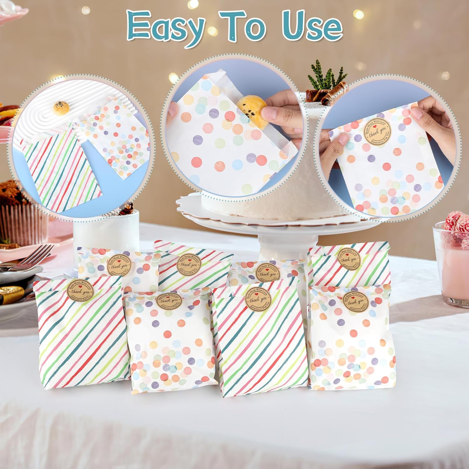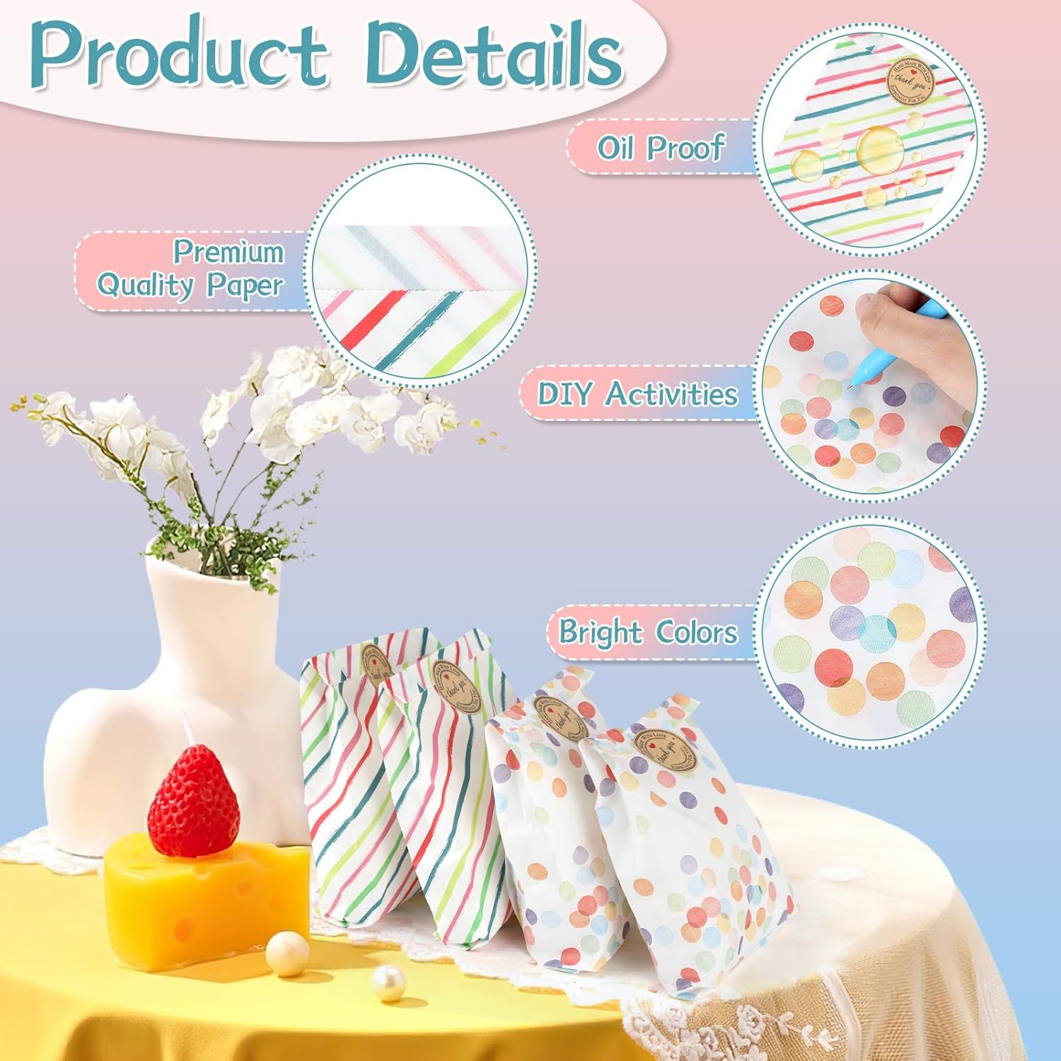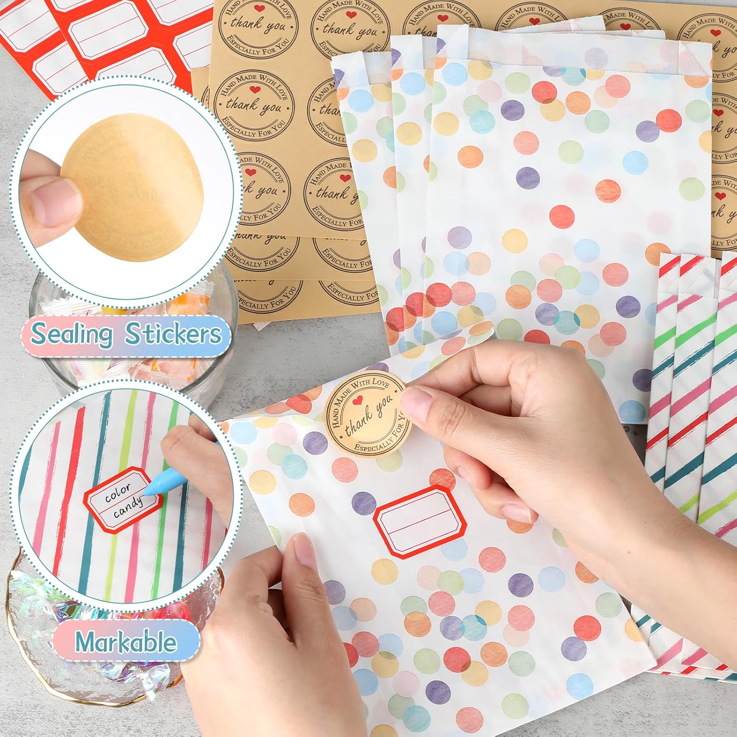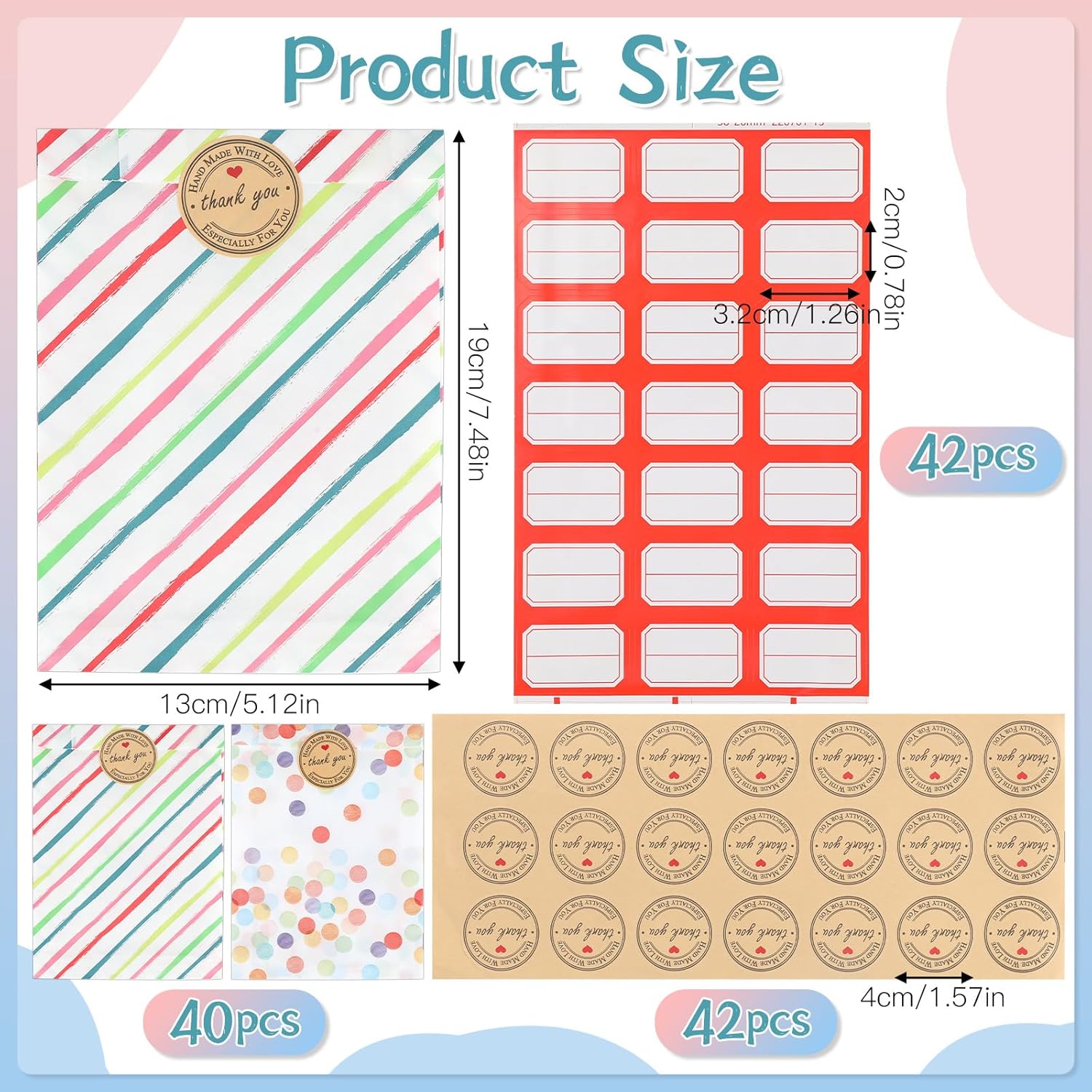 【Set di sacchetti regalo piccoli】Riceverai 40 sacchetti di carta per compleanno per bambini (2 stili di punti arcobaleno), 42 fogli di adesivi "Grazie", 42 fogli di carta per etichette scrivibili, quantità sufficiente per soddisfare tutte le tue esigenze quotidiane. 【Carta di alta qualità】I sacchetti di compleanno sono realizzati in carta di alta qualità, robusta e durevole. Sono facili da aprire e piegare, i sacchetti di carta sono resistenti all'olio, ecologici e atossici e possono entrare in contatto diretto con gli alimenti. Perfetto per sacchetti colorati per panini, sacchetti per feste. 【Adesivo adesivo】 Il piccolo sacchetto di carta viene fornito con carta "adesivo di ringraziamento" abbinata, che ha un'elevata forza adesiva ed è inoltre dotato di 21 etichette per contrassegnare, rendendo i sacchetti di compleanno dei tuoi bambini belli, raffinati e facili da identificare. I piccoli sacchetti di carta arcobaleno sono realizzati in carta spessa, resistente e durevole. 【Versatile】I piccoli sacchetti di carta sono adatti a varie occasioni, come feste di compleanno, matrimoni, Natale o altre celebrazioni. I sacchetti per feste possono essere utilizzati per confezionare dolci, regali o piccoli oggetti