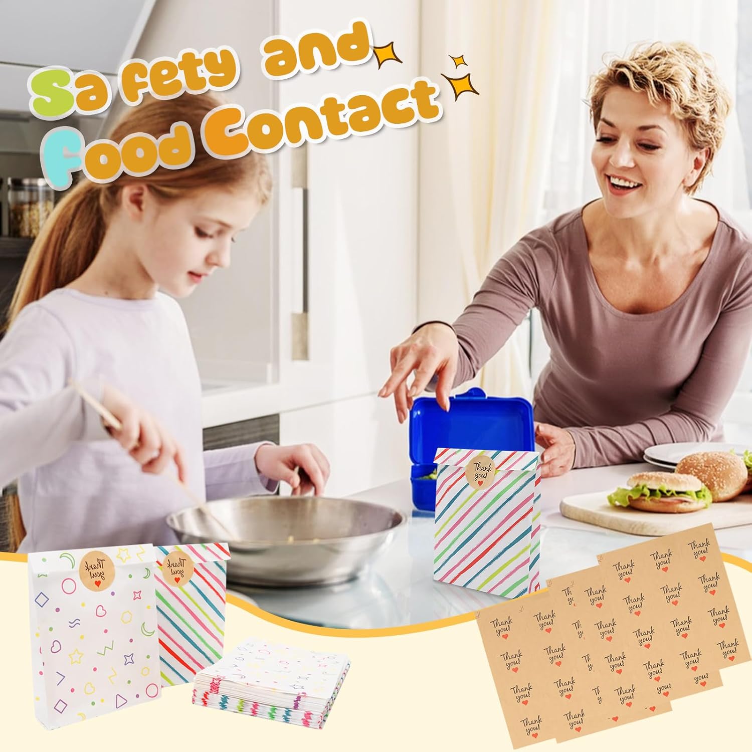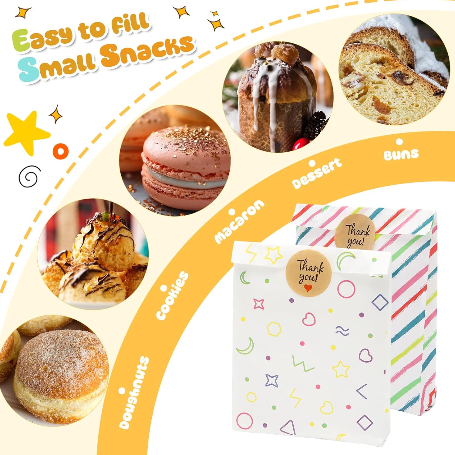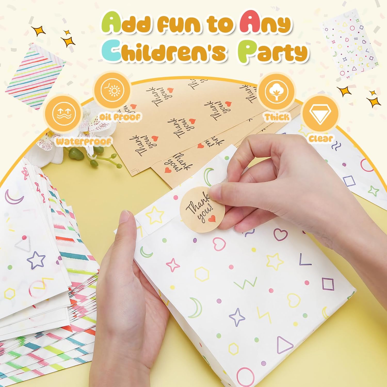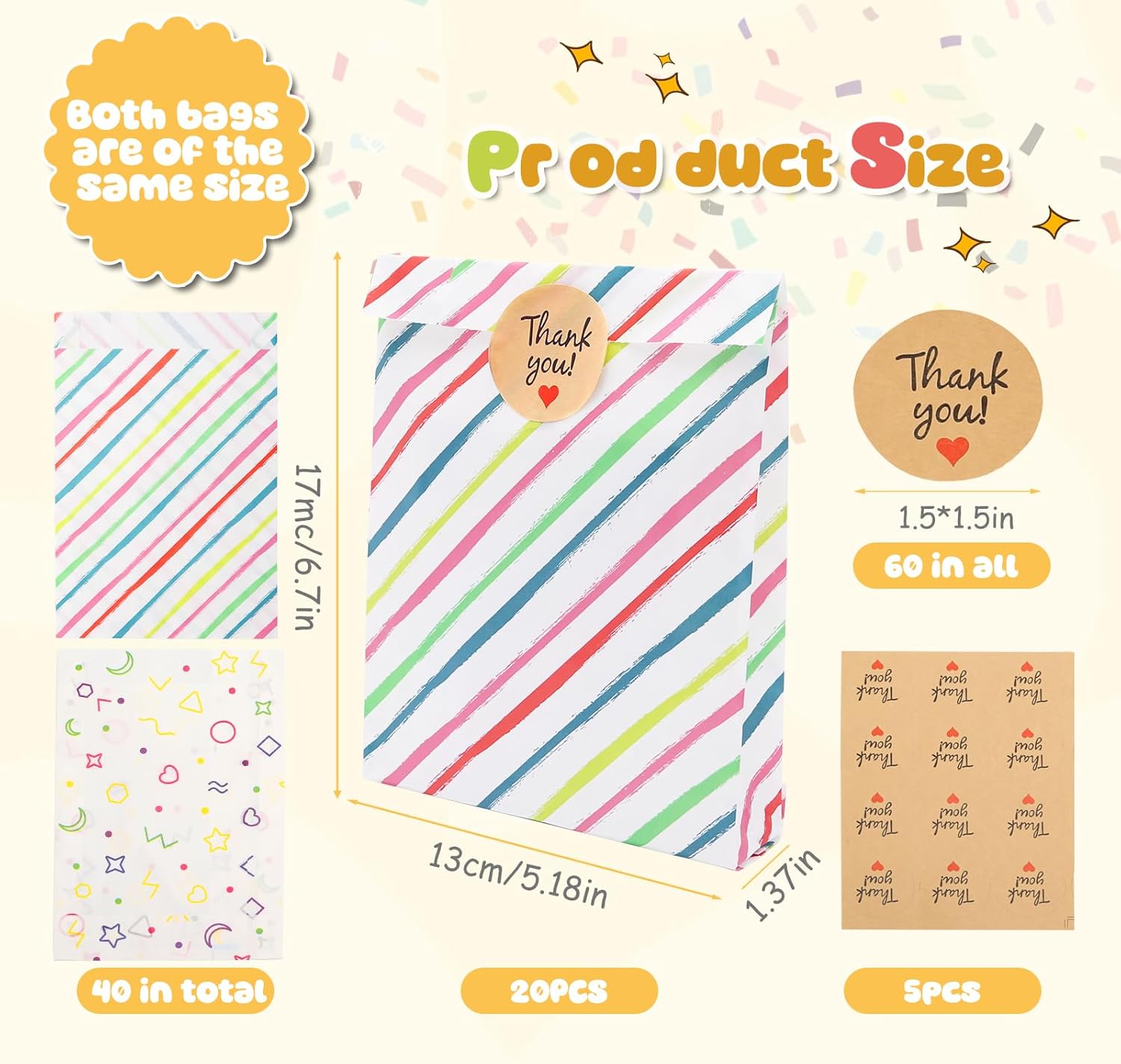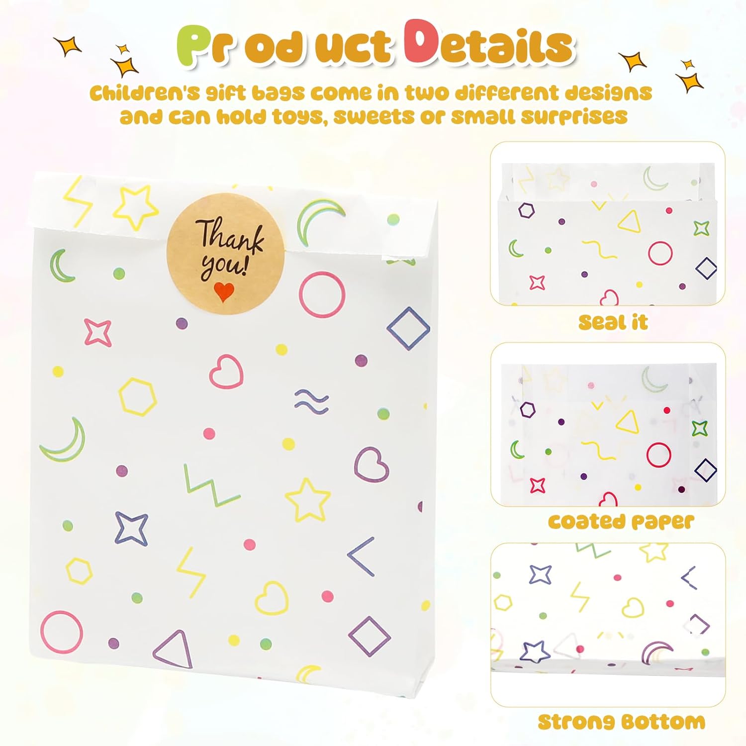 Contenuto della confezione: questo set contiene mini sacchetti di carta colorati e adesivi, pieghevoli e portatili e soddisfano le esigenze di classe o di eventi multipli. Sono resistenti agli strappi e non si ribaltano, quindi anche i bambini piccoli possono trasportarli in tutta sicurezza. Materiale: i sacchetti per feste sono realizzati in carta riciclabile di alta qualità, sono robusti e durevoli e offrono spazio per giocattoli, dolci o piccole sorprese. Un'alternativa sostenibile ai sacchetti di plastica Design colorato e accattivante: i sacchetti regalo per bambini sono disponibili in due diversi design e garantiscono divertimento e colore ad ogni festa. Ravvivano l'atmosfera e suscitano l'interesse dei bambini. Facile da riempire e da utilizzare: i sacchetti per feste in carta misurano 19 x 13 x 3,5 cm e offrono spazio sufficiente per piccoli regali. Sono ideali per genitori, insegnanti o organizzatori di feste. Versatile: sacchetti regalo per bambini. Ideale per compleanni di bambini, feste scolastiche, feste dell'asilo, giochi di pignatte, cacce al tesoro o come confezione per regalini, caramelle e piccoli regali