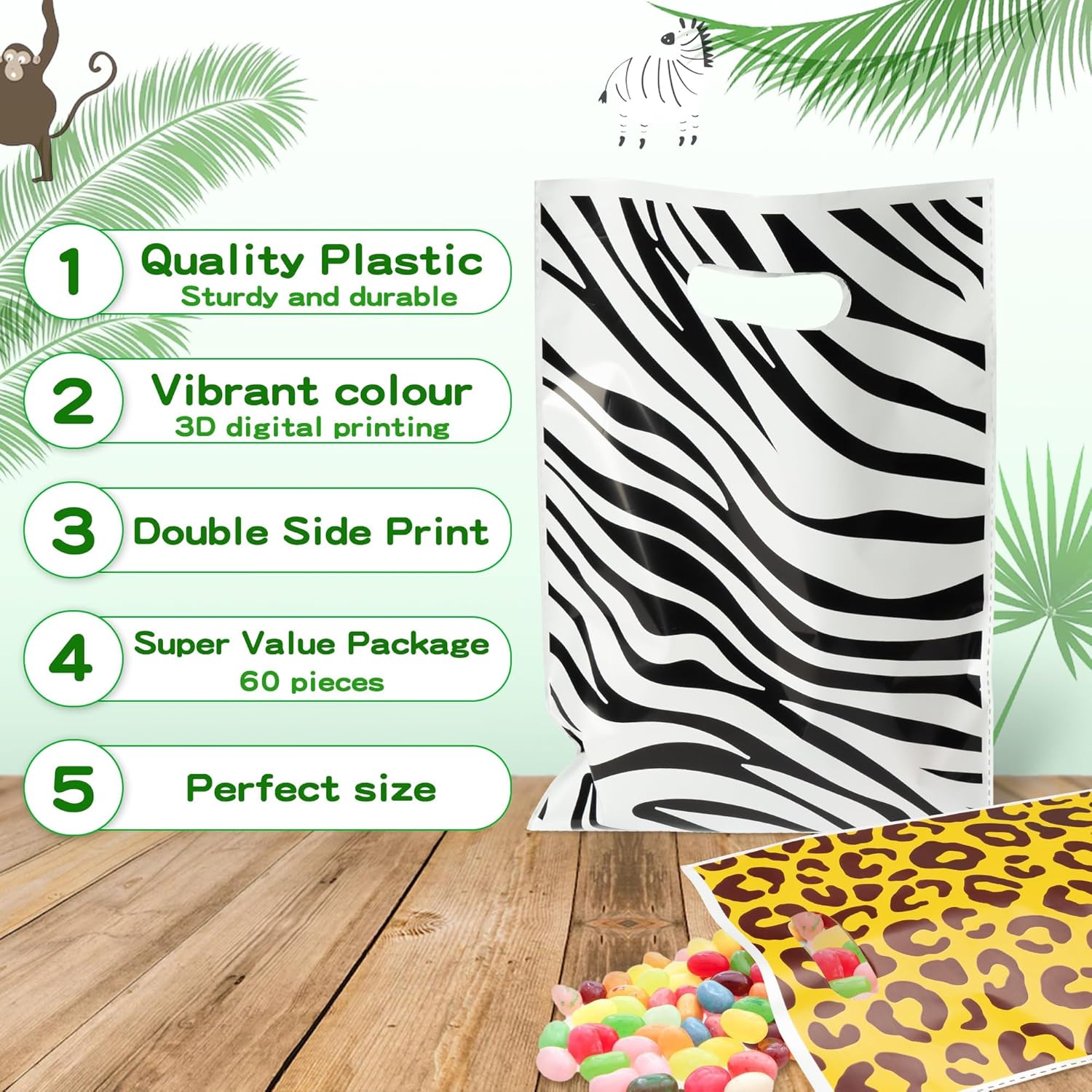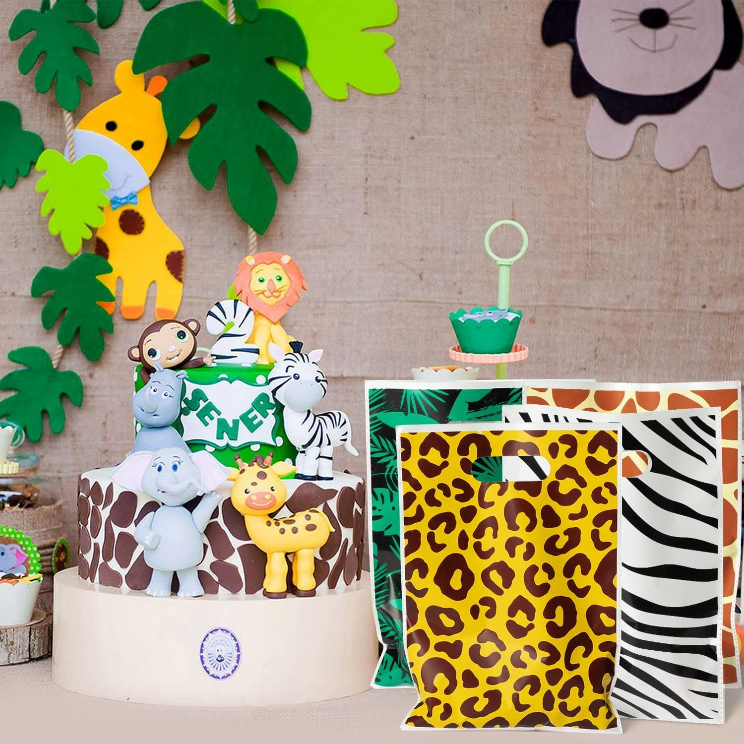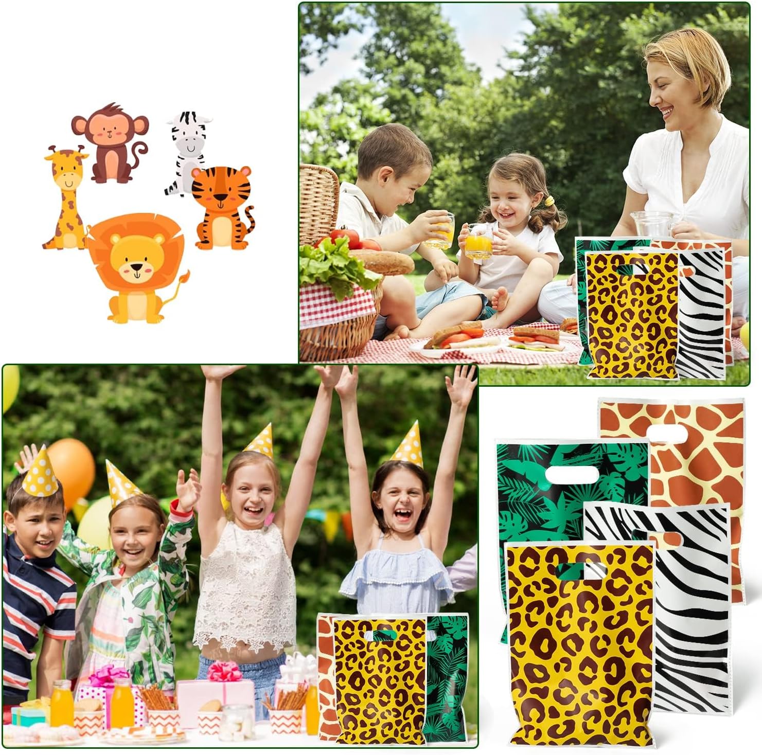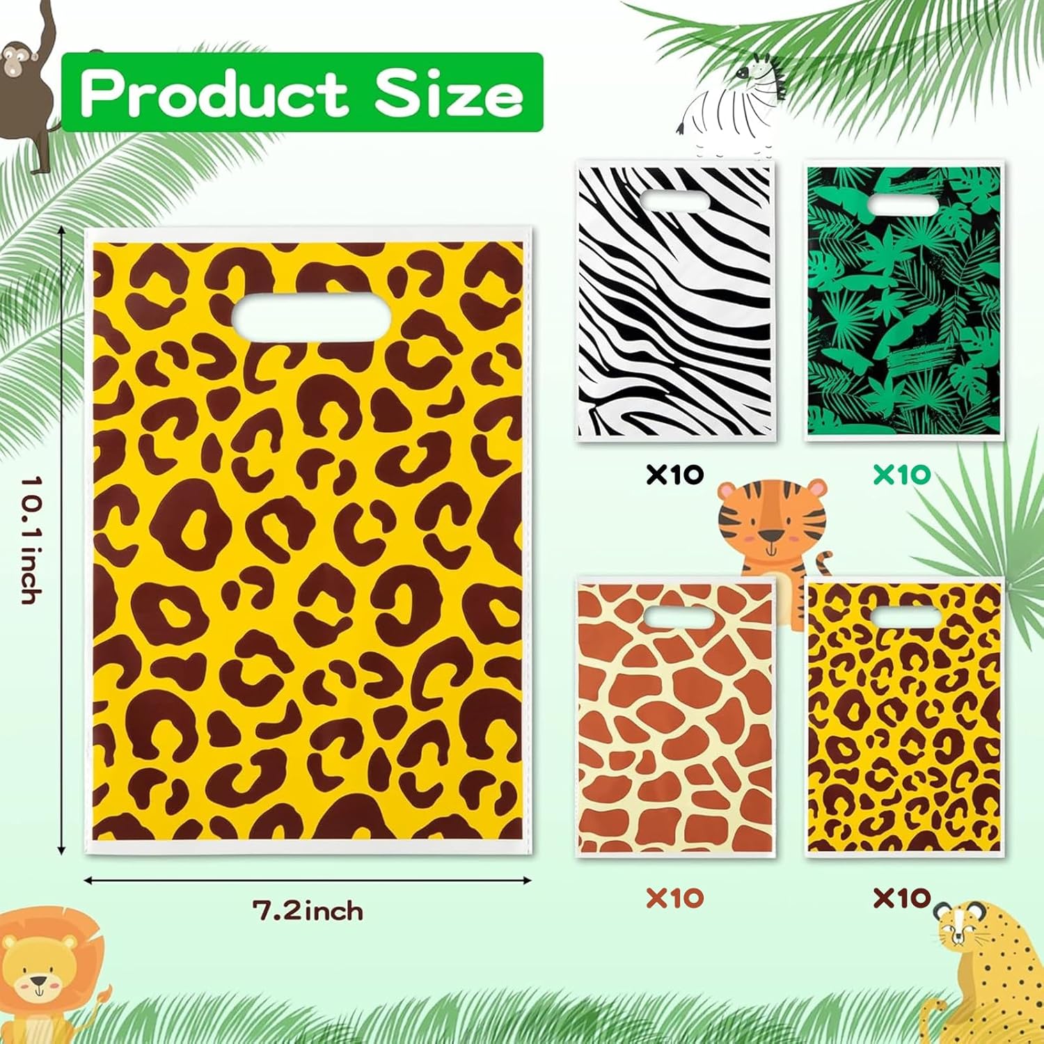 【Vari disegni di stampe di animali】 Contiene un totale di 40 sacchetti per bomboniere, divisi in 4 stampe diverse: strisce di zebra, macchie di ghepardo, macchie e foglie di giraffa, 10 pezzi per ciascuna stampa. Perfetto per feste energiche e divertenti. 【Tema degli animali della giungla】 Il sacchetto regalo a tema degli animali della giungla ha colori vivaci e motivi interessanti, che sono molto apprezzati dai bambini. Strisce zebrate, macchie di ghepardo, macchie di giraffa e motivi a foglie rendono l'intera festa più vivace e interessante, piena di atmosfera avventurosa nella giungla. 【Materiale di alta qualità】 I sacchetti regalo sono realizzati in materiale BOPP inodore, resistente e durevole, ha una superficie liscia e non taglia le mani dei bambini. È dotato di un design con maniglia cava che lo rende facile da trasportare per bambini e genitori. 【Occasioni applicabili】 I sacchetti regalo sono adatti per feste di compleanno, baby shower, campeggio, sacchetti regalo, sacchetti di caramelle e altre occasioni, rendendo più facile fare piccoli regali. Rendi la festa più divertente e conveniente e diventa un punto culminante popolare della festa. 【Design di grande capacità】 La dimensione del sacchetto regalo è di circa 10,1 x 7,2 pollici, con grande capacità, sufficiente per varie bomboniere o piccoli regali, come cioccolatini, caramelle, cupcake, biscotti, snack e altre bomboniere per le esigenze della festa.