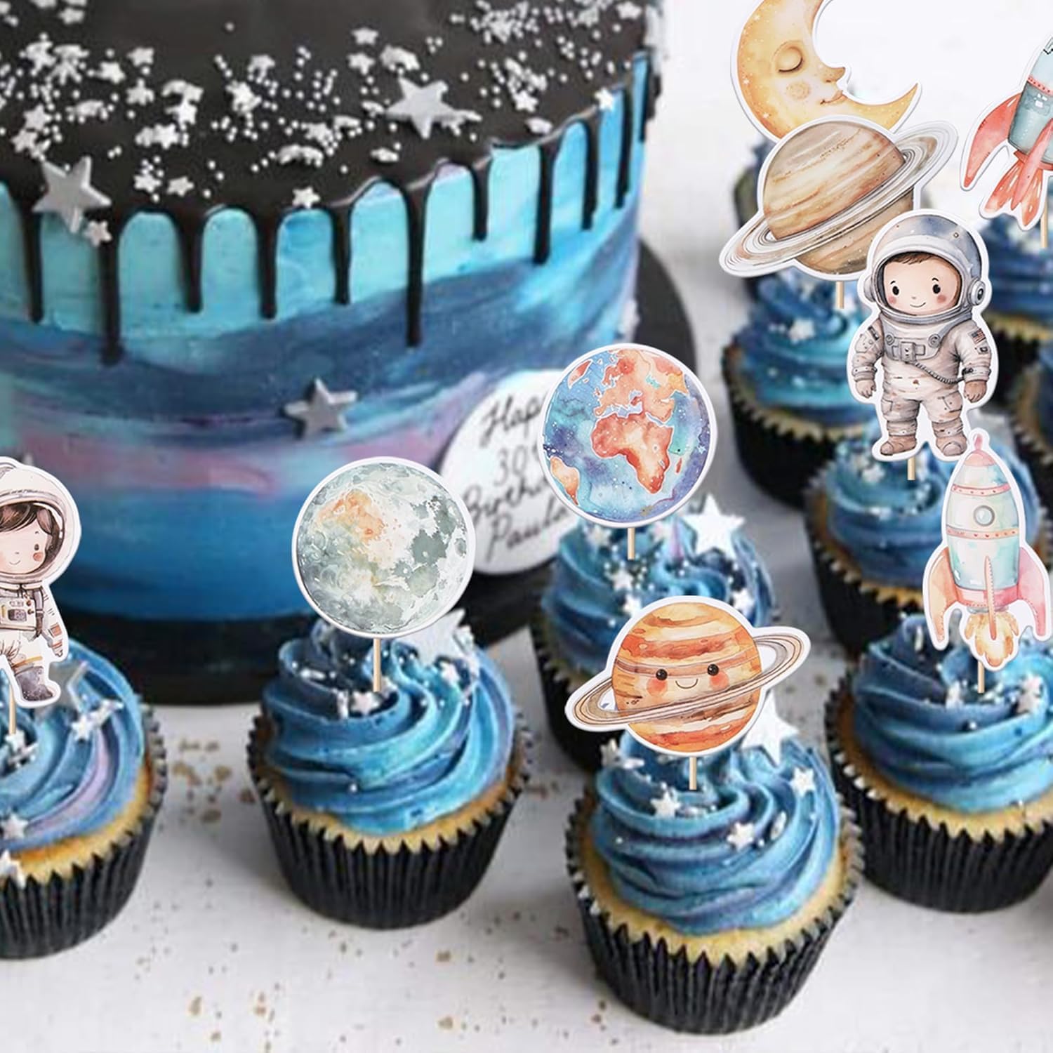 Materiale: i nostri toppers per cupcake sono realizzati in cartone spesso lucido su un lato di alta qualità. Confezione: contiene 40 toppers per cupcake. che possono soddisfare le tue diverse esigenze di decorazione, questi toppers cupcake sono preassemblati, puoi usarli direttamente quando li ricevi Dimensioni: la dimensione è 4,5 x 5,5 cm (senza bastoncino) Applicazione: decorazione perfetta per torte, biscotti, cupcakes, frutta, brownies, gelati e altro, particolarmente adatto per feste a tema spaziale, feste a tema sistema solare, feste a tema universo galassia, pianeti, feste a tema spaziale, tema, feste di compleanno per bambini, decorazioni cupcake Suggerimenti: Questi toppers cupcake non lo sono commestibili e sono solo decorativi, non utilizzare nel forno o nel microonde